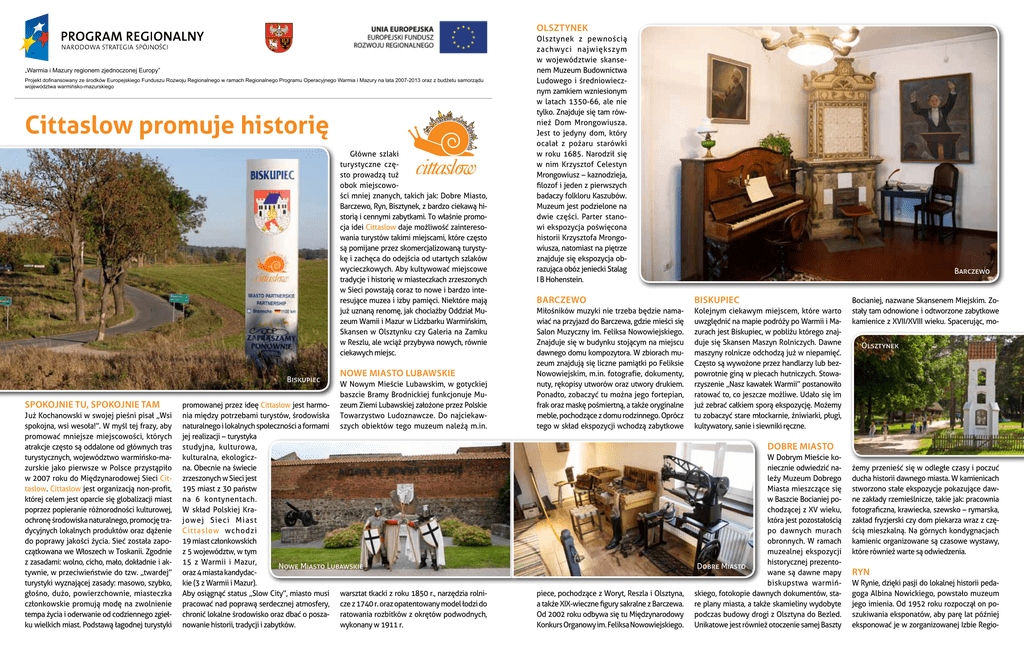 Olsztynek „Warmia i Mazury regionem zjednoczonej Europy” Projekt dofinansowany ze środków Europejskiego Funduszu Rozwoju Regionalnego w ramach Regionalnego Programu Operacyjnego Warmia i Mazury na lata 2007-2013 oraz z budżetu samorządu województwa warmińsko-mazurskiego Cittaslow promuje historię Główne szlaki turystyczne często prowadzą tuż obok miejscowości mniej znanych, takich jak: Dobre Miasto, Barczewo, Ryn, Bisztynek, z bardzo ciekawą historią i cennymi zabytkami. To właśnie promocja idei Cittaslow daje możliwość zainteresowania turystów takimi miejscami, które często są pomijane przez skomercjalizowaną turystykę i zachęca do odejścia od utartych szlaków wycieczkowych. Aby kultywować miejscowe tradycje i historię w miasteczkach zrzeszonych w Sieci powstają coraz to nowe i bardzo interesujące muzea i izby pamięci. Niektóre mają już uznaną renomę, jak chociażby Oddział Muzeum Wamii i Mazur w Lidzbarku Warmińskim, Skansen w Olsztynku czy Galeria na Zamku w Reszlu, ale wciąż przybywa nowych, równie ciekawych miejsc. Biskupiec Spokojnie tu, spokojnie tam Już Kochanowski w swojej pieśni pisał „Wsi spokojna, wsi wesoła!”. W myśl tej frazy, aby promować mniejsze miejscowości, których atrakcje często są oddalone od głównych tras turystycznych, województwo warmińsko-mazurskie jako pierwsze w Polsce przystąpiło w 2007 roku do Międzynarodowej Sieci Cittaslow. Cittaslow jest organizacją non-profit, której celem jest oparcie się globalizacji miast poprzez popieranie różnorodności kulturowej, ochronę środowiska naturalnego, promocję tradycyjnych lokalnych produktów oraz dążenie do poprawy jakości życia. Sieć została zapoczątkowana we Włoszech w Toskanii. Zgodnie z zasadami: wolno, cicho, mało, dokładnie i aktywnie, w przeciwieństwie do tzw. „twardej” turystyki wyznającej zasady: masowo, szybko, głośno, dużo, powierzchownie, miasteczka członkowskie promują modę na zwolnienie tempa życia i oderwanie od codziennego zgiełku wielkich miast. Podstawą łagodnej turystyki Nowe Miasto Lubawskie W Nowym Mieście Lubawskim, w gotyckiej baszcie Bramy Brodnickiej funkcjonuje Muzeum Ziemi Lubawskiej założone przez Polskie Towarzystwo Ludoznawcze. Do najciekawszych obiektów tego muzeum należą m.in. promowanej przez ideę Cittaslow jest harmonia między potrzebami turystów, środowiska naturalnego i lokalnych społeczności a formami jej realizacji – turystyka studyjna, kulturowa, kulturalna, ekologiczna. Obecnie na świecie zrzeszonych w Sieci jest 195 miast z 30 państw na 6 kontynentach. W skład Polskiej Krajowej Sieci Miast Cittaslow wchodzi 19 miast członkowskich z 5 województw, w tym 15 z Warmii i Mazur, Nowe Miasto Lubawskie oraz 4 miasta kandydackie (3 z Warmii i Mazur). Aby osiągnąć status „Slow City”, miasto musi warsztat tkacki z roku 1850 r., narzędzia rolnipracować nad poprawą serdecznej atmosfery, cze z 1740 r. oraz opatentowany model łodzi do chronić lokalne środowisko oraz dbać o posza- ratowania rozbitków z okrętów podwodnych, nowanie historii, tradycji i zabytków. wykonany w 1911 r. Olsztynek z pewnością zachwyci największym w województwie skansenem Muzeum Budownictwa Ludowego i średniowiecznym zamkiem wzniesionym w latach 1350-66, ale nie tylko. Znajduje się tam również Dom Mrongowiusza. Jest to jedyny dom, który ocalał z pożaru starówki w roku 1685. Narodził się w nim Krzysztof Celestyn Mrongowiusz – kaznodzieja, filozof i jeden z pierwszych badaczy folkloru Kaszubów. Muzeum jest podzielone na dwie części. Parter stanowi ekspozycja poświęcona historii Krzysztofa Mrongowiusza, natomiast na piętrze znajduje się ekspozycja obrazująca obóz jeniecki Stalag I B Hohenstein. Barczewo Barczewo Biskupiec Miłośników muzyki nie trzeba będzie namawiać na przyjazd do Barczewa, gdzie mieści się Salon Muzyczny im. Feliksa Nowowiejskiego. Znajduje się w budynku stojącym na miejscu dawnego domu kompozytora. W zbiorach muzeum znajdują się liczne pamiątki po Feliksie Nowowiejskim, m.in. fotografie, dokumenty, nuty, rękopisy utworów oraz utwory drukiem. Ponadto, zobaczyć tu można jego fortepian, frak oraz maskę pośmiertną, a także oryginalne meble, pochodzące z domu rodzinnego. Oprócz tego w skład ekspozycji wchodzą zabytkowe Kolejnym ciekawym miejscem, które warto uwzględnić na mapie podróży po Warmii i Mazurach jest Biskupiec, w pobliżu którego znajduje się Skansen Maszyn Rolniczych. Dawne maszyny rolnicze odchodzą już w niepamięć. Często są wywożone przez handlarzy lub bezpowrotnie giną w piecach hutniczych. Stowarzyszenie „Nasz kawałek Warmii” postanowiło ratować to, co jeszcze możliwe. Udało się im już zebrać całkiem sporą ekspozycję. Możemy tu zobaczyć stare młockarnie, żniwiarki, pługi, kultywatory, sanie i siewniki ręczne. piece, pochodzące z Woryt, Reszla i Olsztyna, a także XIX-wieczne figury sakralne z Barczewa. Od 2002 roku odbywa się tu Międzynarodowy Konkurs Organowy im. Feliksa Nowowiejskiego. W Dobrym Mieście koniecznie odwiedzić należy Muzeum Dobrego Miasta mieszczące się w Baszcie Bocianiej pochodzącej z XV wieku, która jest pozostałością po dawnych murach obronnych. W ramach muzealnej ekspozycji historycznej prezentoDobre Miasto wane są dawne mapy biskupstwa warmińskiego, fotokopie dawnych dokumentów, stare plany miasta, a także skamieliny wydobyte podczas budowy drogi z Olsztyna do Bezled. Unikatowe jest również otoczenie samej Baszty Bocianiej, nazwane Skansenem Miejskim. Zostały tam odnowione i odtworzone zabytkowe kamienice z XVII/XVIII wieku. Spacerując, moOlsztynek Dobre Miasto żemy przenieść się w odległe czasy i poczuć ducha historii dawnego miasta. W kamienicach stworzono stałe ekspozycje pokazujące dawne zakłady rzemieślnicze, takie jak: pracownia fotograficzna, krawiecka, szewsko – rymarska, zakład fryzjerski czy dom piekarza wraz z