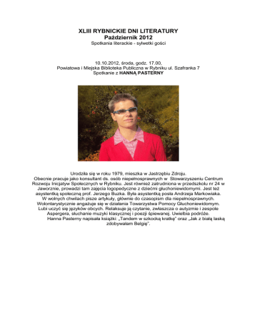 XLIII RYBNICKIE DNI LITERATURY Październik 2012 Spotkania literackie - sylwetki gości 10.10.2012, środa, godz. 17.00, Powiatowa i Miejska Biblioteka Publiczna w Rybniku ul. Szafranka 7 Spotkanie z HANNĄ PASTERNY Urodziła się w roku 1979, mieszka w Jastrzębiu Zdroju. Obecnie pracuje jako konsultant ds. osób niepełnosprawnych w Stowarzyszeniu Centrum Rozwoju Inicjatyw Społecznych w Rybniku. Jest również zatrudniona w przedszkolu nr 24 w Jaworznie, prowadzi tam zajęcia logopedyczne z dziećmi głuchoniewidomymi. Jest też asystentką społeczną prof. Jerzego Buzka. Była asystentką posła Andrzeja Markowiaka. W wolnych chwilach pisze artykuły, głównie do czasopism dla niepełnosprawnych. Wolontarystycznie angażuje się w działania Towarzystwa Pomocy Głuchoniewidomym. Lubi uczyć się języków obcych. Relaksuje ją czytanie, zwłaszcza o autyzmie i zespole Aspergera, słuchanie muzyki klasycznej i poezji śpiewanej. Uwielbia podróże. Hanna Pasterny napisała książki: „Tandem w szkocką kratkę” oraz „Jak z białą laską zdobywałam Belgię”. 19.10.2012, poniedziałek, godz.10.00 sala widowiskowa RCK Pułapki prowincji, czyli dlaczego bez regionalizmu nie ma demokracji. Rozmawiają Aleksandra Klich, szefowa Magazynu Świątecznego Gazety Wyborczej i Zbigniew Kadłubek, profesor Uniwersytetu Śląskiego. Znana jest w całej Polsce jako autorka poruszająca problematykę feministyczną, kościelną, a także, mówiąc najogólniej, dotyczącą kondycji współczesnej humanistyki (…). Należy do tej nielicznej grupy dziennikarzy, którzy są wrażliwi na autentyczne wykluczenie społeczne. (…) Jest utalentowaną felietonistką, eseistką, biografistką, a także regionalistką, bo sprawy regionu, Górnego Śląska zawsze były dla niej istotne. (…) Podkreśla swą rybnickość i swe rybnickie korzenie w wielu swych tekstach. Ze swej lokalności rybnickiej, z rybnickiej tożsamości czyni walor twórczy. (tekst z laudacji wygłoszonej przez Zbigniewa Kadłubka podczas uroczystości wręczenia Złotej Honorowej Lampki Górniczej 2012r.) Zbigniew Kadłubek – doktor habilitowany, adiunkt w Katedrze Literatury Porównawczej na Wydziale Filologicznym Uniwersytetu Śląskiego[1]; filolog klasyczny, komparatysta, eseista, tłumacz, pisarz. Autor szkiców o dawnej i współczesnej kulturze Śląska, retoryce, literaturze średniowiecznej, ekspresjonizmie niemieckim. Opublikował dwie książki na temat teologii św. Piotra Damianiego (10071072). Wraz z Tadeuszem Sławkiem redaguje serię komparatystyczną „Civitas Mentis”. 15.10.2012, poniedziałek, godz.14.00 aula Uniwersytetu Śląskiego ul. Rudzka 13, Rybnik Spotkanie autorskie z ANNĄ JANKO. Moderator: dr Marta Cuber Anna Janko (ur. 1957) – współczesna polska pisarka, poetka i krytyk literacki. Debiutowała jako poetka tomem List do królika doświadczalnego (1977). O nastoletniej wówczas autorce pisali m.in. Hanna Krall i Artur Sandauer. Wydała kolejnych 5 zbiorów wierszy: Wykluwa się staruszka (1979), Diabłu świeca (1980), Koronki na rany (1989), Zabici czasem długo stoją (1995), Świetlisty cudzoziemiec (2000). Za ten ostatni tom była w 2001 roku nominowana do Nagrody Nike. Jest też autorką dramatu "Rzeź lalek", wystawionego w Teatrze Współczesnym w Szczecinie (1980-81). W latach 1998-2004 była redaktorem autorskiej serii wydawniczej „To jest poezja”. Współpracowała z PR II Polskiego Radia, prowadząc w latach 2002-2005 cotygodniowe kulturalne audycje na żywo. Członek PEN Clubu i Stowarzyszenia Pisarzy Polskich. Prezes wrocławskiego oddziału SPP (1993-1996); prezes warszawskiego oddziału SPP (1999-2002), wiceprezes Zarządu Głównego SPP (2002-2005), prezes gdańskiego oddziału SPP (od 2007). Jako poetka debiutowała w 1977 r. W 1980 roku otrzymała Nagrodę Młodych im. Włodzimierza Pietrzaka, w 1993 r. Nagrodę Niezależnego Związku Pisarzy w Dreźnie. W 2001 r. była nominowana do nagrody literackiej Nike[1] za tom "Świetlisty cudzoziemiec". W 2008 r. za powieść "Dziewczyna z zapałkami" nominowano ją do Nagrody Mediów Cogito oraz Europejskiej Nagrody Europy Środkowej Angelus. W 2009 r. otrzymała nagrodę im. Reymonta. Współpracowała z wrocławskim miesięcznikiem "Odra", II programem Polskiego Radia, czasopismem "Pani". Obecnie współpracuje ze "Zwierciadłem". Jest członkiem PENclubu i Stowarzyszenia Pisarzy Polskich. Ostatnio ukazały się: "Maciupek i Maleńtas. Niezwykłe przygody w Brzuchu Mamy" (proza dla dzieci, Nasza Księgarnia 2012) i "Pasja według św. Hanki" (powieść, Wydawnictwo Literackie 2012). 16.10.2012, wtorek, godz. 10.00 Zespół Szkół Technicznych, ul. Kościuszki 5, Rybnik Spotkanie literackie z TADEUSZEM KIJONKĄ Tadeusz Bolesław Kijonka polityk, poeta, dziennikarz,. Ukończył studia na Uniwersytecie Jagiellońskim. W 1992 założył i został prezesem Górnośląskiego Towarzystwa Literackiego. Od 1995, tj. od założenia, pełni funkcję redaktora naczelnego miesięcznika społeczno-kulturalnego "Śląsk". Odznaczony m.in. Krzyżem Komandorskim Orderu Odrodzenia Polski (1997)[2] i Brązowym Medalem Zasłużony Kulturze Gloria Artis (2006). 16.10.2012, wtorek, godz. 17.00 Powiatowa i Miejska Biblioteka Publiczna w Rybniku. ul. Szafranka 7 Spotkanie literackie z MIKOŁAJEM ŁOZIŃSKIM, Moderator dr MARTA CUBER Urodził się w 1980 r. w Warszawie. Pisarz i fotografik, absolwent socjologii w Paryżu. Debiutował powieścią „Reisefieber” (Znak 2006), za którą otrzymał w 2007 r. Nagrodę Fundacji im. Kościelskich. Jest zdobywcą II nagrody literackiej w Konkursie Młodych Twórców Warszawskiej Fundacji Kultury (2006), był też stypendystą programu Instytutu Książki i Stowarzyszenia Willa Decjusza dla pisarzy i tłumaczy Homines Urbani (jesień 2007 r.). Opublikował również „Bajki dla Idy” (Znak 2008). We wrześniu 2011 r. jego „Książka” (Wydawnictwo Literackie) została Krakowską Książką Miesią