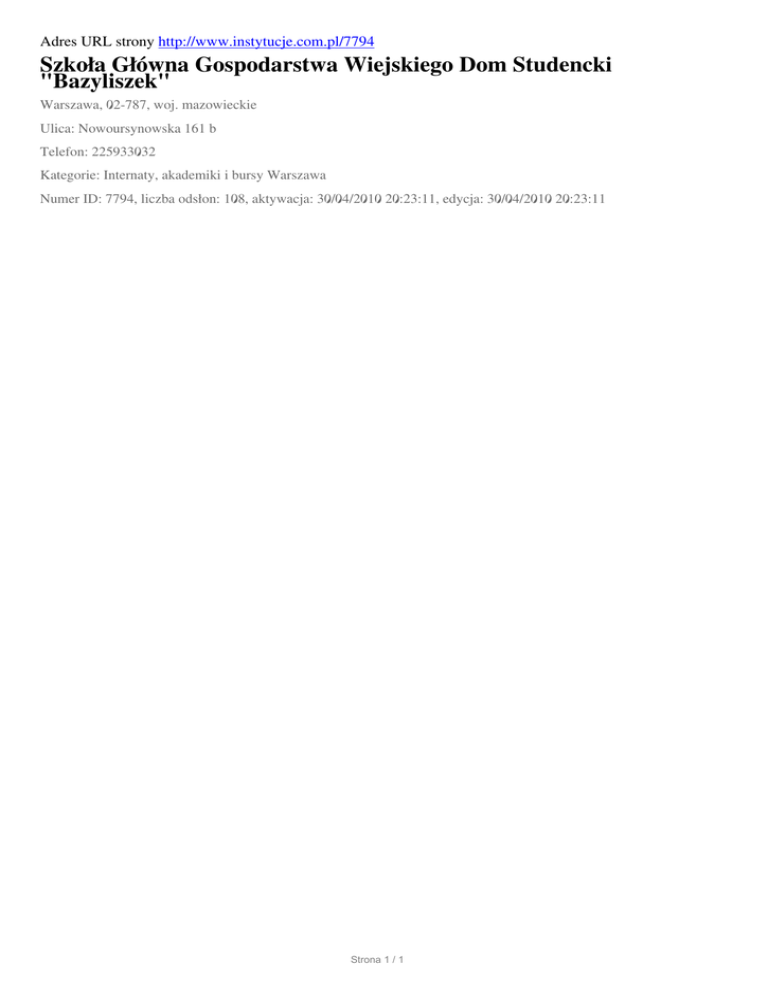 Adres URL strony http://www.instytucje.com.pl/7794 Szkoła Główna Gospodarstwa Wiejskiego Dom Studencki "Bazyliszek" Warszawa, 02-787, woj. mazowieckie Ulica: Nowoursynowska 161 b Telefon: 225933032 Kategorie: Internaty, akademiki i bursy Warszawa Numer ID: 7794, liczba odsłon: 108, aktywacja: 30/04/2010 20:23:11, edycja: 30/04/2010 20:23:11 Strona 1 / 1