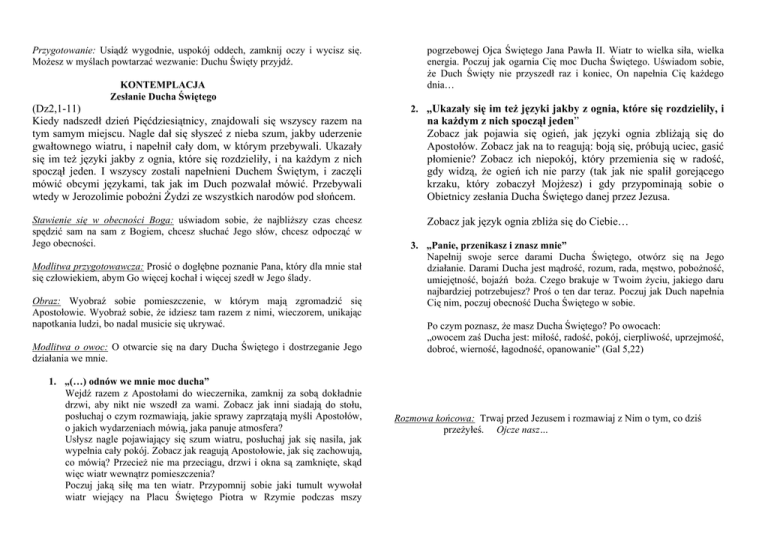 Przygotowanie: Usiądź wygodnie, uspokój oddech, zamknij oczy i wycisz się. Możesz w myślach powtarzać wezwanie: Duchu Święty przyjdź. KONTEMPLACJA Zesłanie Ducha Świętego (Dz2,1-11) Kiedy nadszedł dzień Pięćdziesiątnicy, znajdowali się wszyscy razem na tym samym miejscu. Nagle dał się słyszeć z nieba szum, jakby uderzenie gwałtownego wiatru, i napełnił cały dom, w którym przebywali. Ukazały się im też języki jakby z ognia, które się rozdzieliły, i na każdym z nich spoczął jeden. I wszyscy zostali napełnieni Duchem Świętym, i zaczęli mówić obcymi językami, tak jak im Duch pozwalał mówić. Przebywali wtedy w Jerozolimie pobożni Żydzi ze wszystkich narodów pod słońcem. Stawienie się w obecności Boga: uświadom sobie, że najbliższy czas chcesz spędzić sam na sam z Bogiem, chcesz słuchać Jego słów, chcesz odpocząć w Jego obecności. Modlitwa przygotowawcza: Prosić o dogłębne poznanie Pana, który dla mnie stał się człowiekiem, abym Go więcej kochał i więcej szedł w Jego ślady. Obraz: Wyobraź sobie pomieszczenie, w którym mają zgromadzić się Apostołowie. Wyobraź sobie, że idziesz tam razem z nimi, wieczorem, unikając napotkania ludzi, bo nadal musicie się ukrywać. Modlitwa o owoc: O otwarcie się na dary Ducha Świętego i dostrzeganie Jego działania we mnie. 1. „(…) odnów we mnie moc ducha” Wejdź razem z Apostołami do wieczernika, zamknij za sobą dokładnie drzwi, aby nikt nie wszedł za wami. Zobacz jak inni siadają do stołu, posłuchaj o czym rozmawiają, jakie sprawy zaprzątają myśli Apostołów, o jakich wydarzeniach mówią, jaka panuje atmosfera? Usłysz nagle pojawiający się szum wiatru, posłuchaj jak się nasila, jak wypełnia cały pokój. Zobacz jak reagują Apostołowie, jak się zachowują, co mówią? Przecież nie ma przeciągu, drzwi i okna są zamknięte, skąd więc wiatr wewnątrz pomieszczenia? Poczuj jaką siłę ma ten wiatr. Przypomnij sobie jaki tumult wywołał wiatr wiejący na Placu Świętego Piotra w Rzymie podczas mszy pogrzebowej Ojca Świętego Jana Pawła II. Wiatr to wielka siła, wielka energia. Poczuj jak ogarnia Cię moc Ducha Świętego. Uświadom sobie, że Duch Święty nie przyszedł raz i koniec, On napełnia Cię każdego dnia… 2. „Ukazały się im też języki jakby z ognia, które się rozdzieliły, i na każdym z nich spoczął jeden” Zobacz jak pojawia się ogień, jak języki ognia zbliżają się do Apostołów. Zobacz jak na to reagują: boją się, próbują uciec, gasić płomienie? Zobacz ich niepokój, który przemienia się w radość, gdy widzą, że ogień ich nie parzy (tak jak nie spalił gorejącego krzaku, który zobaczył Mojżesz) i gdy przypominają sobie o Obietnicy zesłania Ducha Świętego danej przez Jezusa. Zobacz jak język ognia zbliża się do Ciebie… 3. „Panie, przenikasz i znasz mnie” Napełnij swoje serce darami Ducha Świętego, otwórz się na Jego działanie. Darami Ducha jest mądrość, rozum, rada, męstwo, pobożność, umiejętność, bojaźń boża. Czego brakuje w Twoim życiu, jakiego daru najbardziej potrzebujesz? Proś o ten dar teraz. Poczuj jak Duch napełnia Cię nim, poczuj obecność Ducha Świętego w sobie. Po czym poznasz, że masz Ducha Świętego? Po owocach: „owocem zaś Ducha jest: miłość, radość, pokój, cierpliwość, uprzejmość, dobroć, wierność, łagodność, opanowanie” (Gal 5,22) Rozmowa końcowa: Trwaj przed Jezusem i rozmawiaj z Nim o tym, co dziś przeżyłeś. Ojcze nasz…