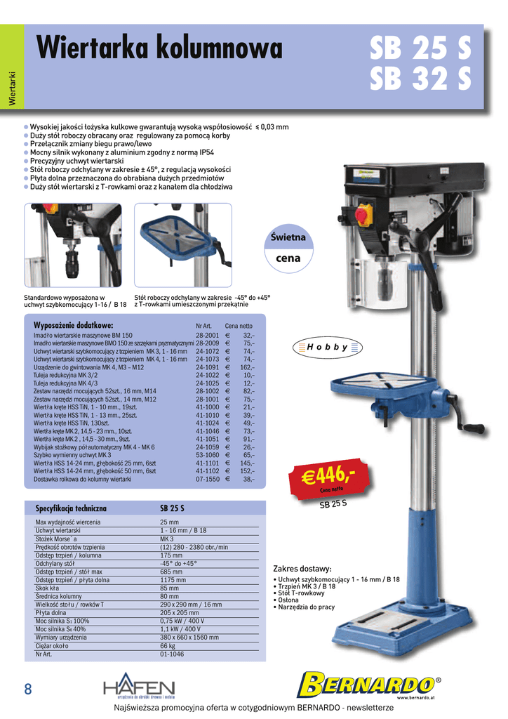 Wiertarka kolumnowa Wiertarki SB 25 S SB 32 S • Wysokiej jakości łożyska kulkowe gwarantują wysoką współosiowość ≤ 0,03 mm • Duży stół roboczy obracany oraz regulowany za pomocą korby • Przełącznik zmiany biegu prawo/lewo • Mocny silnik wykonany z aluminium zgodny z normą IP54 • Precyzyjny uchwyt wiertarski • Stół roboczy odchylany w zakresie ± 45°, z regulacją wysokości • Płyta dolna przeznaczona do obrabiana dużych przedmiotów • Duży stół wiertarski z T-rowkami oraz z kanałem dla chłodziwa Świetna cena Standardowo wyposażona w uchwyt szybkomocujący 1-16 / B 18 Stół roboczy odchylany w zakresie -45° do +45° z T-rowkami umieszczonymi przekątnie Wyposażenie dodatkowe: Nr Art. Imadło wiertarskie maszynowe BM 150 28-2001 Imadło wiertarskie maszynowe BMO 150 ze szczękami pryzmatycznymi 28-2009 Uchwyt wiertarski szybkomocujący z trzpieniem MK 3, 1 - 16 mm 24-1072 Uchwyt wiertarski szybkomocujący z trzpieniem MK 4, 1 - 16 mm 24-1073 Urządzenie do gwintowania MK 4, M3 – M12 24-1091 Tuleja redukcyjna MK 3/2 24-1022 Tuleja redukcyjna MK 4/3 24-1025 Zestaw narzędzi mocujących 52szt., 16 mm, M14 28-1002 Zestaw narzędzi mocujących 52szt., 14 mm, M12 28-1001 Wiertła kręte HSS TiN, 1 - 10 mm., 19szt. 41-1000 Wiertła kręte HSS TiN, 1 - 13 mm., 25szt. 41-1010 Wiertła kręte HSS TiN, 130szt. 41-1024 Wiertła kręte MK 2, 14,5 - 23 mm., 10szt. 41-1046 Wiertła kręte MK 2 , 14,5 - 30 mm., 9szt. 41-1051 Wybijak stożkowy półautomatyczny MK 4 - MK 6 24-1059 Szybko wymienny uchwyt MK 3 53-1060 Wiertła HSS 14-24 mm, głębokość 25 mm, 6szt 41-1101 Wiertła HSS 14-24 mm, głębokość 50 mm, 6szt 41-1102 Dostawka rolkowa do kolumny wiertarki 07-1550 Cena netto € 32,– € 75,– € 74,– € 74,– € 162,– € 10,– € 12,– € 82,– € 75,– € 21,– € 39,– € 49,– € 73,– € 91,– € 26,– € 65,– € 145,– € 152,– € 38,– €446,Cena netto Specyfikacja techniczna SB 25 S Max wydajność wiercenia Uchwyt wiertarski Stożek Morse`a Prędkość obrotów trzpienia Odstęp trzpień / kolumna Odchylany stół Odstęp trzpień / stół max Odstęp trzpień / płyta dolna Skok kła Średnica kolumny Wielkość stołu / rowków T Płyta dolna Moc silnika S1 100% Moc silnika S6 40% Wymiary urządzenia Ciężar około Nr Art. 25 mm 1 - 16 mm / B 18 MK 3 (12) 280 - 2380 obr./min 175 mm -45° do +45° 685 mm 1175 mm 85 mm 80 mm 290 x 290 mm / 16 mm 205 x 205 mm 0,75 kW / 400 V 1,1 kW / 400 V 380 x 660 x 1560 mm 66 kg 01-1046 SB 25 S Zakres dostawy: • Uchwyt szybkomocujący 1 - 16 mm / B 18 • Trzpień MK 3 / B 18 • Stół T-rowkowy • Osłona • Narzędzia do pracy 8 Najświeższa promocyjna oferta w cotygodniowym BERNARDO - newsletterze SB 25 S SB 32 S Wiertarki Solidne i mocne wiertarki kolumnowe serii SB z zakresem wiercenia od 25 mm do 32 mm. Stworzone do zakładów rzemieślniczych, serwisów ale również dla majsterkowiczów w przydomowych garażach. Standardowo wyposażone w przełącznik obrotów lewo / prawo. Prezentowane modele zapewniają optymalny stosunek ceny do jakości. Bardzo cicha i płynna praca dzięki wyważonym Wysokiej jakości silnik wykonany z kołom pasowym. Najwyższej jakości pasy aluminium zapewnia bezwibracyjną pracę klinowe zapewniają płynne przeniesienie napędu €692,Wszystkie elementy sterowania ergonomicznie zaprojektowane i łatwe w obsłudze Możliwość opcjonalnego wyposażenia w głowicę do szybkiej zmiany narzędzi Dla wygody pracy z długimi przedmiotami wiertarkę można opcjonalnie wyposażyć w uchwyty rolkowe Ergonomicznie zaprojektowany uchwyt dla łatwego ustawiania posuwu wrzeciona Cena netto SB 32 S Wyposażona w płytę dolną dla obróbki większych przedmiotów (SB 32S wyposażona w T-rowki) Specyfikacja techniczna SB 32 S Max wydajność wiercenia Uchwyt wiertarski Stożek Morse`a Prędkość obrotów trzpienia Odstęp trzpień / kolumna Odchylany stół Odstęp trzpień / stół max Odstęp trzpień / płyta dolna Skok kła Średnica kolumny Wielkość stołu / rowków T Płyta dolna Moc silnika S1 100% Moc silnika S6 40% Wymiary urządzenia Ciężar około Nr Art. 32 mm 1 - 16 mm / B 18 MK 4 (12) 150 - 2450 obr./min 215 mm -45° do +45° 760 mm 1125 mm 120 mm 92 mm 355 x 350 mm / 14 mm 295 x 245 mm 1,1 kW / 400 V 1,6 kW / 400 V 400 x 720 x 1700 mm 100 kg 01-1051 Stół roboczy odchylany w zakresie od -45° do +45° z regulacją wysokości, oraz obracany o 360° Zakres dostawy: • Uchwyt szybkomocujący 1 - 16 mm / B 18 • Trzpień MK 4 / B 18 • Stół T-rowkowy • Osłona • Narzędzia do pracy 9 Najaktualniejsza oferta dostępna na www.hafen.pl