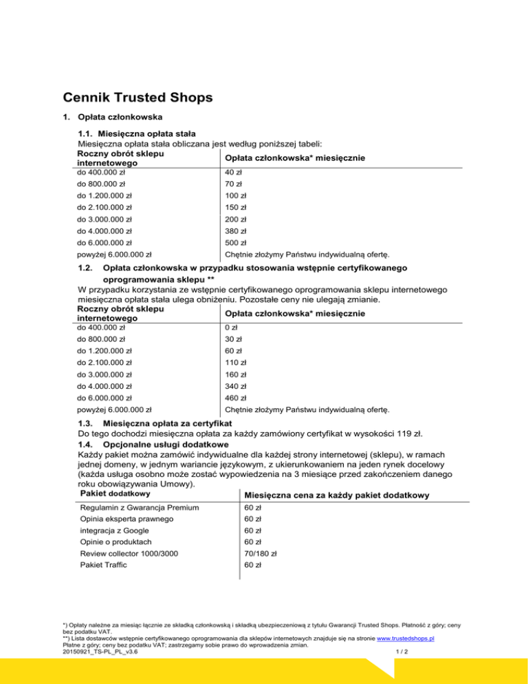 Cennik Trusted Shops 1. Opłata członkowska 1.1. Miesięczna opłata stała Miesięczna opłata stała obliczana jest według poniższej tabeli: Roczny obrót sklepu Opłata członkowska* miesięcznie internetowego do 400.000 zł 40 zł do 800.000 zł 70 zł do 1.200.000 zł 100 zł do 2.100.000 zł 150 zł do 3.000.000 zł 200 zł do 4.000.000 zł 380 zł do 6.000.000 zł 500 zł powyżej 6.000.000 zł Chętnie złożymy Państwu indywidualną ofertę. Opłata członkowska w przypadku stosowania wstępnie certyfikowanego oprogramowania sklepu ** W przypadku korzystania ze wstępnie certyfikowanego oprogramowania sklepu internetowego miesięczna opłata stała ulega obniżeniu. Pozostałe ceny nie ulegają zmianie. Roczny obrót sklepu Opłata członkowska* miesięcznie internetowego 1.2. do 400.000 zł 0 zł do 800.000 zł 30 zł do 1.200.000 zł 60 zł do 2.100.000 zł 110 zł do 3.000.000 zł 160 zł do 4.000.000 zł 340 zł do 6.000.000 zł 460 zł powyżej 6.000.000 zł Chętnie złożymy Państwu indywidualną ofertę. 1.3. Miesięczna opłata za certyfikat Do tego dochodzi miesięczna opłata za każdy zamówiony certyfikat w wysokości 119 zł. 1.4. Opcjonalne usługi dodatkowe Każdy pakiet można zamówić indywidualne dla każdej strony internetowej (sklepu), w ramach jednej domeny, w jednym wariancie językowym, z ukierunkowaniem na jeden rynek docelowy (każda usługa osobno może zostać wypowiedzenia na 3 miesiące przed zakończeniem danego roku obowiązywania Umowy). Pakiet dodatkowy Miesięczna cena za każdy pakiet dodatkowy Regulamin z Gwarancja Premium 60 zł Opinia eksperta prawnego 60 zł integracja z Google 60 zł Opinie o produktach 60 zł Review collector 1000/3000 70/180 zł Pakiet Traffic 60 zł *) Opłaty należne za miesiąc łącznie ze składką członkowską i składką ubezpieczeniową z tytułu Gwarancji Trusted Shops. Płatność z góry; ceny bez podatku VAT. **) Lista dostawców wstępnie certyfikowanego oprogramowania dla sklepów internetowych znajduje się na stronie www.trustedshops.pl Płatne z góry; ceny bez podatku VAT; zastrzegamy sobie prawo do wprowadzenia zmian. 20150921_TS-PL_PL_v3.6 1/2 2. Dalsze koszty z tytułu członkostwa 2.1 2.2 2.3 Jednorazowa opłata aktywacyjna 199 zł Opłata manipulacyjna za obsługę roszczenia odszkodowawczego lub reklamacji 100 zł Koszt sporządzenia każdego dodatkowego protokołu z audytu w przypadku niewłaściwego wprowadzenia wymaganych zmian 200 zł 3. Koszty z tytułu korzystania z gwarancji typu Excellence Kosztami z tytułu korzystania z Gwarancji Trusted Shops należy obciążyć klienta w wysokości, jak niżej: Wysokość gwarancji Okres gwarancji Cena z podatkiem VAT do 500 zł 30 dni 1,99 zł do 1.500 zł 30 dni 2,99 zł do 2.500 zł 30 dni 4,99 zł do 5.000 zł 30 dni 9,99 zł do 10.000 zł 30 dni 19,99 zł do 20.000 zł 30 dni 39,99 zł W przypadku 60-dniowego okresu ochrony wyżej wymienione ceny należy pomnożyć przez 2, w odniesieniu do 90-dniowego okresu ochrony – przez 3, a w przypadku 120-dniowego okresu ochrony – przez 4. 4. Prowizja w przypadku integracji gwarancji typu Excellence W przypadku pośredniczenia w zawarciu umowy w przedmiocie Ochrony Kupującego Trusted Shops sklep internetowy otrzymuje od TS prowizję w wysokości uzależnionej od Refund Application Ratio (RAR): Refund Application Ratio (RAR) Prowizja > 2% 2% - 1% < 1% 0% 15% 30% Obliczany co miesiąc wskaźnik RAR za miesiąc ubiegły uzyskuje się poprzez podzielenie liczby wniosków o zwrot przez ilość transakcji dokonanych w miesiącu rozliczeniowym. Wnioskiem o zwrot jest każdy przypadek wypłaty świadczenia w rozumieniu oświadczenia gwarancyjnego (TS-GAE_PL), zgłoszony przez klienta sklepu internetowego za pośrednictwem systemu TS. Pod pojęciem transakcji rozumiany jest każdy przypadek rejestracji przystąpienia do Gwarancji Trusted Shops. Na koniec każdego miesiąca rozliczeniowego TS wystawia sklepowi internetowemu fakturę na kwotę odpowiadającą kwocie wypłaconych świadczeń gwarancyjnych, pomniejszoną o wysokość należnej prowizji. 5. Opcjonalne usługi dodatkowe dla posiadaczy pakietów członkowskich Trusted Shops 5.1 Certyfikacja w trybie ekspresowym 800 zł Sporządzenie indywidualnego protokołu z przeprowadzonego audytu w trybie przyspieszonym w ciągu maksymalnie 3 dni roboczych (przy posiadaniu wiarygodności finansowej) 5.2 Zmiana właściciela sklepu internetowego 200 zł Przejęcie praw strony umowy certyfikowanego sklepu z zachowaniem treści umowy (ogólne warunki handlowe itd.) 5.3 Zmiana oprogramowania sklepu 800 zł Ponowna certyfikacja ze względu na zmianę oprogramowania sklepu 5.4 Ponowny audyt sklepu 800 zł Ponowny audyt ze względu na szeroki zakres zmian istotnych elementów sklepu, ważnych z punktu widzenia certyfikacji Płatne z góry; ceny bez podatku VAT; zastrzegamy sobie prawo do wprowadzenia zmian. 20150921_TS-PL_PL_v3.6 2/2