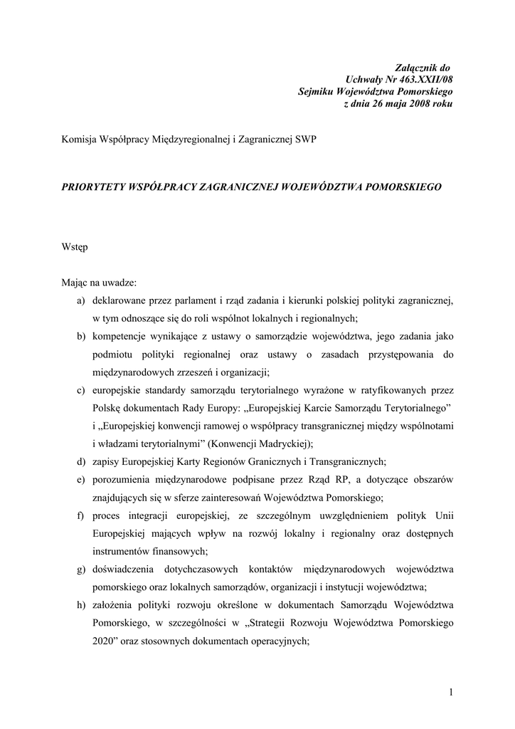 Załącznik do Uchwały Nr 463.XXII/08 Sejmiku Województwa Pomorskiego z dnia 26 maja 2008 roku Komisja Współpracy Międzyregionalnej i Zagranicznej SWP PRIORYTETY WSPÓŁPRACY ZAGRANICZNEJ WOJEWÓDZTWA POMORSKIEGO Wstęp Mając na uwadze: a) deklarowane przez parlament i rząd zadania i kierunki polskiej polityki zagranicznej, w tym odnoszące się do roli wspólnot lokalnych i regionalnych; b) kompetencje wynikające z ustawy o samorządzie województwa, jego zadania jako podmiotu polityki regionalnej oraz ustawy o zasadach przystępowania do międzynarodowych zrzeszeń i organizacji; c) europejskie standardy samorządu terytorialnego wyrażone w ratyfikowanych przez Polskę dokumentach Rady Europy: „Europejskiej Karcie Samorządu Terytorialnego” i „Europejskiej konwencji ramowej o współpracy transgranicznej między wspólnotami i władzami terytorialnymi” (Konwencji Madryckiej); d) zapisy Europejskiej Karty Regionów Granicznych i Transgranicznych; e) porozumienia międzynarodowe podpisane przez Rząd RP, a dotyczące obszarów znajdujących się w sferze zainteresowań Województwa Pomorskiego; f) proces integracji europejskiej, ze szczególnym uwzględnieniem polityk Unii Europejskiej mających wpływ na rozwój lokalny i regionalny oraz dostępnych instrumentów finansowych; g) doświadczenia dotychczasowych kontaktów międzynarodowych województwa pomorskiego oraz lokalnych samorządów, organizacji i instytucji województwa; h) założenia polityki rozwoju określone w dokumentach Samorządu Województwa Pomorskiego, w szczególności w „Strategii Rozwoju Województwa Pomorskiego 2020” oraz stosownych dokumentach operacyjnych; 1 ustala się: I. Cele i zadania współpracy międzynarodowej województwa pomorskiego. A. Treść i zakres współpracy międzynarodowej województwa pomorskiego wynika z polityki zagranicznej Rzeczypospolitej Polskiej. Współpraca ta ma na celu wzbogacenie polityki Państwa Polskiego o elementy regionalne oraz wzmacnianie rozwoju gospodarczego, społecznego i kulturowego województwa pomorskiego. Między innymi poprzez współpracę międzynarodową, województwo pomorskie ma stać się bardziej konkurencyjne, spójne i dostępne, przy czym rozwój kontaktów międzynarodowych zależy od szeroko rozumianych uwarunkowań postępu cywilizacyjnego województwa pomorskiego. B. W realizacji współpracy międzynarodowej województwa pomorskiego wykorzystuje się jego walory regionalne: 1) znaczne możliwości gospodarcze wynikające m.in. z położenia geograficznego w obszarze Morza Bałtyckiego oraz funkcji tranzytowych portów morskich, a także przechodzących przez ten region paneuropejskich korytarzy transportowych; 2) potencjał gospodarczy ulokowany w tradycyjnych dla województwa pomorskiego sektorach gospodarki, w szybko rozwijającym się sektorze usług i szeroko rozumianej innowacyjności oraz wynikający z walorów turystycznych regionu; 3) potencjał intelektualny związany z działającymi na terenie województwa uczelniami wyższymi i instytucjami naukowo – badawczymi, będący podstawą postępu technologicznego; 4) bogaty dorobek kulturowy wynikający z uwarunkowań historycznych oraz zróżnicowania etnicznego; 5) znaczny poziom aktywności społecznej i przedsiębiorczości mieszkańców. C. Cele i zadania współpracy międzynarodowej wynikają z założeń strategii rozwoju województwa pomorskiego. Jej tworzenie należy traktować jako proces podlegający cyklicznym weryfikacjom, przyjmując jednocześnie zasadę stabilności ogólnych celów rozwojowych regionu. 2 Do najważniejszych kierunków rozwojowych województwa pomorskiego determinujących zadania i obszary współpracy międzynarodowej należą: 1. Tworzenie materialnych podstaw egzystencji społeczności regionalnej przez wspieranie rozwoju istniejących i powstawanie nowych przedsiębiorstw kreujących nowe miejsca pracy. Związane jest to z tworzeniem warunków korzystnych dla aktywizacji kapitału rodzimego oraz przyciągania kapitału zagranicznego; 2. Przyspieszenie rozbudowy i modernizacji infrastruktury komunikacyjnej. Inwestycje w dziedzinie komunikacji drogowej, kolejowej, morskiej, lotniczej, telekomunikacji przyczynią się do integracji wewnętrznej i zewnętrznej (w wymiarze krajowym i międzynarodowym) województwa pomorskiego oraz do wzmocnienia rangi trójmiejskiego węzła lądowo-morskiego i lotniczego; 3. Wspieranie rozwoju innowacji i nowoczesnych technologii; 4. Modernizacja i rozbudowa infrastruktury technicznej związanej z ochroną środowiska naturalnego w ramach zrównoważonego rozwoju regionu. Dotyczy to w szczególności gospodarki odpadami, gospodarki wodno-ściekowej, ciepłownictwa i alternatywnych źródeł energii; 5. Rozwój obszarów wiejskich obejmujący m.in. restrukturyzację i unowocześnienie produkcji rolnej, promocję produktów tradycyjnych i regionalnych, rolnictwa ekologicznego, tworzenie warunków dla powstawania pozarolniczych źródeł utrzymania ludności wiejskiej, a także działania na rzecz zwiększenia eksportu produktów rolno-spożywczych; 6. Rozwój rybactwa morskiego i śródlądowego, służącego także zachowaniu tradycyjnych walorów kulturowych i krajobrazowych województwa pomorskiego; 7. Zmniejszanie poziomu bezrobocia poprzez aktywizację zawodową ludności i dostosowanie szkolnictwa do rzeczywistych potrzeb rynku pracy; 8. Przeciwdziałanie wszelkim formom wykluczenia społecznego; 9. Działania na rzecz rozwoju kulturowego regionu, w tym szczególnie sprzyjanie bogactwu i różnorodności form kultury oraz kształtowanie warunków dla partnerstwa środowisk twórczych i naukowych; 10. Wzmacnianie atrakcyjności i konkurencyjności województwa pomorskiego poprzez podejmowanie szeroko rozumianych działań promocyjnych; 3 11. Wspieranie działań w zakresie rozwoju edukacji i szkolnictwa, ze szczególnym uwzględnieniem szkolnictwa wyższego; 12. Wspieranie i promocja prozdrowotnych roz