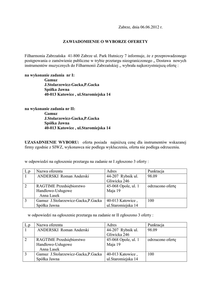 Zabrze, dnia 06.06.2012 r. ZAWIADOMIENIE O WYBORZE OFERETY Filharmonia Zabrzańska 41-800 Zabrze ul. Park Hutniczy 7 informuje, że z przeprowadzonego postępowania o zamówienie publiczne w trybie przetargu nieograniczonego „ Dostawa nowych instrumentów muzycznych do Filharmonii Zabrzańskiej „ wybrała najkorzystniejszą ofertę : na wykonanie zadania nr I: Gamuz J.Stolarzewicz-Gacka,P.Gacka Spółka Jawna 40-013 Katowice , ul.Staromiejska 14 na wykonanie zadania nr II: Gamuz J.Stolarzewicz-Gacka,P.Gacka Spółka Jawna 40-013 Katowice , ul.Staromiejska 14 UZASADNIENIE WYBORU: oferta posiada najniższą cenę dla instrumentów wskazanej firmy zgodnie z SIWZ, wykonawca nie podlega wykluczeniu, oferta nie podlega odrzuceniu. w odpowiedzi na ogłoszenie przetargu na zadanie nr I zgłoszono 3 oferty : L.p 1 Nazwa oferenta ANDERSKI Roman Anderski 2 RAGTIME Przedsiębiorstwo Handlowo-Usługowe Anna Lasek Gamuz J.Stolarzewicz-Gacka,P.Gacka Spółka Jawna 3 Adres 44-207 Rybnik ul. Gliwicka 246 45-068 Opole, ul. 1 Maja 19 Punktacja 98.09 40-013 Katowice , ul.Staromiejska 14 100 odrzucono ofertę w odpowiedzi na ogłoszenie przetargu na zadanie nr II zgłoszono 3 oferty : L.p 1 Nazwa oferenta ANDERSKI Roman Anderski 2 RAGTIME Przedsiębiorstwo Handlowo-Usługowe Anna Lasek Gamuz J.Stolarzewicz-Gacka,P.Gacka Spółka Jawna 3 Adres 44-207 Rybnik ul. Gliwicka 246 45-068 Opole, ul. 1 Maja 19 Punktacja 98.09 40-013 Katowice , ul.Staromiejska 14 100 odrzucono ofertę Żaden z oferentów nie podlega wykluczeniu. Jednocześnie informujemy, że oferta firmy : RAGTIME Przedsiębiorstwo Handlowo-Usługowe Anna Lasek 45-068 Opole, ul. 1 Maja 19 została zgodnie z art. 89 ust.1 pkt. 6 odrzucona , gdyż zawiera błędy w obliczeniu ceny. Uzasadnienie prawne dla odrzucenia oferty firmy Ragtime Przedsiębiorstwo HandlowoUsługowe Anna Lasek 45-068 Opole, ul. 1 Maja 19 Na podstawie art. 89 ust. 1 pkt. 6 odrzuceniu podlegają oferty, które zawierają błędy w obliczeniu ceny. Uzasadnienie faktyczne dla odrzucenia oferty firmy Ragtime Przedsiębiorstwo HandlowoUsługowe Anna Lasek 45-068 Opole, ul. 1 Maja 19 Oferta złożona przez firmę Ragtime nie posiada prawidłowo wyliczonej ceny. Błędy w wyliczeniu wynikają z omyłek rachunkowych. Suma Zadania I i Zadania II, która była wymagana przez Zamawiającego jako wartość zamówienia nie została prawidłowo wyliczona, gdyż nie stanowi sumy poszczególnych zadań. Zamawiający nie jest w stanie stwierdzić, czy zaniżona cena oferty łącznej dla Zadania I i Zadania II zamówienia jest wynikiem błędu w obliczeniach czy też kwota ta jest prawidłowa i błędy są ukryte w wyliczeniu Zadania I i Zadania II. Nie ma tu oczywistej pomyłki którą Zamawiający może sprostować, ponieważ oczywista pomyłka Zgodnie z komentarzem J. Pieróg z lutego 2012 r. „nie podlega odrzuceniu oferta niezgodna z treścią siwz, jeżeli powodem niezgodności są omyłki, które zostały przez zamawiającego poprawione, co spowodowało zgodność treści oferty z treścią siwz. Warunkiem jest prawidłowość takiego poprawienia, polegająca na tym, że poprawki nie mogą powodować istotnych zmian w treści oferty”. W tym przypadku warunek ten jest nie do spełnienia. W tym samym komentarzu: „błędy w obliczeniu ceny charakteryzują się tym, iż nie można ich poprawić, a zatem powodują odrzucenie oferty. Od omyłek, o których mowa w art. 87 ust. 2 pkt 2, różnią się też tym, że nie mają charakteru oczywistego. Nie są więc to z reguły błędy w działaniach matematycznych lub w przepisywaniu liczb, bo jako takie mogą zostać uznane za oczywiste omyłki. Mają raczej charakter trwały, np. przyjęcie wadliwej stawki VAT, albo nie wiadomo, jak je poprawić.” Zamawiający w tym konkretnym przypadku nie wie jak poprawić błąd z oferty. Po otwarciu ofert firma Ragtime ma możliwość poprawić błąd poprzez podniesienie ceny końcowej, gdyż zna już oferty konkurencyjne. W przypadku gdyby ceny oferowane przez konkurentów były wyższe tylko nieznacznie od ceny zamówienia firma Ragtime mogła by wskazać błąd w innej pozycji – dla danego zadania – i w ten sposób utrzymać korzystną cenę. Termin podpisania umowy strony ustalą zgodnie z art. 94 ust. 1 pkt 2 PZP na podstawie daty doręczenia niniejszego zawiadomienia.