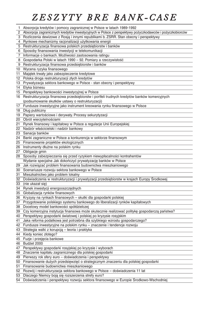 ZESZYTY BRE BANK-CASE 1 2 3 4 5 6 7 8 9 10 11 12 13 14 15 16 17 18 19 20 21 22 23 24 25 26 27 28 29 30 31 32 33 34 35 36 37 38 39 40 41 42 43 44 45 46 47 48 49 50 51 52 53 54 Absorpcja kredytów i pomocy zagranicznej w Polsce w latach 1989-1992 Absorpcja zagranicznych kredytów inwestycyjnych w Polsce z perspektywy pożyczkodawców i pożyczkobiorców Rozliczenia dewizowe z Rosją i innymi republikami b. ZSRR. Stan obecny i perspektywy Rynkowe mechanizmy racjonalizacji użytkowania energii Restrukturyzacja finansowa polskich przedsiębiorstw i banków Sposoby finansowania inwestycji w telekomunikacji Informacje o bankach. Możliwości zastosowania ratingu Gospodarka Polski w latach 1990 – 92. Pomiary a rzeczywistość Restrukturyzacja finansowa przedsiębiorstw i banków Wycena ryzyka finansowego Majątek trwały jako zabezpieczenie kredytowe Polska droga restrukturyzacji złych kredytów Prywatyzacja sektora bankowego w Polsce - stan obecny i perspektywy Etyka biznesu Perspektywy bankowości inwestycyjnej w Polsce Restrukturyzacja finansowa przedsiębiorstw i portfeli trudnych kredytów banków komercyjnych (podsumowanie skutków ustawy o restrukturyzacji) Fundusze inwestycyjne jako instrument kreowania rynku finansowego w Polsce Dług publiczny Papiery wartościowe i derywaty. Procesy sekurytyzacji Obrót wierzytelnościami Rynek finansowy i kapitałowy w Polsce a regulacje Unii Europejskiej Nadzór właścicielski i nadzór bankowy Sanacja banków Banki zagraniczne w Polsce a konkurencja w sektorze finansowym Finansowanie projektów ekologicznych Instrumenty dłużne na polskim rynku Obligacje gmin Sposoby zabezpieczania się przed ryzykiem niewypłacalności kontrahentów Wydanie specjalne Jak dokończyć prywatyzację banków w Polsce Jak rozwiązać problem finansowania budownictwa mieszkaniowego Scenariusze rozwoju sektora bankowego w Polsce Mieszkalnictwo jako problem lokalny Doświadczenia w restrukturyzacji i prywatyzacji przedsiębiorstw w krajach Europy Środkowej (nie ukazał się) Rynek inwestycji energooszczędnych Globalizacja rynków finansowych Kryzysy na rynkach finansowych – skutki dla gospodarki polskiej Przygotowanie polskiego systemu bankowego do liberalizacji rynków kapitałowych Docelowy model bankowości spółdzielczej Czy komercyjna instytucja finansowa może skutecznie realizować politykę gospodarczą państwa? Perspektywy gospodarki światowej i polskiej po kryzysie rosyjskim Jaka reforma podatkowa jest potrzebna dla szybkiego wzrostu gospodarczego? Fundusze inwestycyjne na polskim rynku – znaczenie i tendencje rozwoju Strategia walki z korupcją – teoria i praktyka Kiedy koniec złotego? Fuzje i przejęcia bankowe Budżet 2000 Perspektywy gospodarki rosyjskiej po kryzysie i wyborach Znaczenie kapitału zagranicznego dla polskiej gospodarki Pierwszy rok sfery euro – doświadczenia i perspektywy Finansowanie dużych przedsięwzięć o strategicznym znaczeniu dla polskiej gospodarki Finansowanie budownictwa mieszkaniowego Rozwój i restrukturyzacja sektora bankowego w Polsce – doświadczenia 11 lat Dlaczego Niemcy boją się rozszerzenia strefy euro? Doświadczenia i perspektywy rozwoju sektora finansowego w Europie Środkowo-Wschodniej