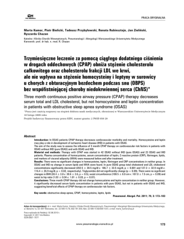 PRACA ORYGINALNA Marta Kumor, Piotr Bielicki, Tadeusz Przybyłowski, Renata Rubinsztajn, Jan Zieliński, Ryszarda Chazan Katedra i Klinika Chorób Wewnętrznych, Pneumonologii i Alergologii Warszawskiego Uniwersytetu Medycznego Kierownik: prof. dr hab. n. med. R. Chazan Trzymiesięczne leczenie za pomocą ciągłego dodatniego ciśnienia w drogach oddechowych (CPAP) obniża stężenie cholesterolu całkowitego oraz cholesterolu frakcji LDL we krwi, ale nie wpływa na stężenie homocysteiny i leptyny w surowicy u chorych z obturacyjnym bezdechem podczas snu (OBPS) bez współistniejącej choroby niedokrwiennej serca (ChNS)* Three month continuous positive airway pressure (CPAP) therapy decreases serum total and LDL cholesterol, but not homocysteine and leptin concentration in patients with obstructive sleep apnea syndrome (OSAS) *Praca jest częścią rozprawy na stopień doktora nauk medycznych, obronionej w Warszawskim Uniwersytecie Medycznym 18 lutego 2009 roku Projekt badawczy finansowany przez KBN, numer grantu: 2 P05B 050 29 Abstract Introduction: In OSAS patients CPAP therapy decreases cardiovascular morbidity and mortality. Homocysteine and leptin may play a role in development of ischaemic heart disease (IHD) in patients with OSAS. The aim of the study was to assess the influence of 3 month CPAP therapy on cardiovascular risk factors in patients with OSAS without IHD (pure OSAS) and with OSAS and IHD. Material and methods: Therapy with CPAP was started in 42 OSAS without IHD (pure OSAS) and 23 OSAS and IHD patients. Plasma concentration of homocysteine, serum concentration of leptin, C-reactive protein (CRP), fibrinogen, lipids, and markers of visceral adiposity (MVA) were measured before and after treatment. Results: There were no significant changes in homocysteine, leptin, fibrinogen and CRP concentrations in neither group. In OSAS and IHD no change in serum lipids and MVA were found. In pure OSAS group total cholesterol and LDL cholesterol concentrations significantly decreased (202.5 ± 38.5 mg/dl v. 186.7 ± 33.5 mg/dl, p = 0.001 and 127.3 ± 32.9 mg/dl v. 116.4 ± 26.9 mg/dl, p = 0.02, respectively). Triglycerides did not significantly change (p = 0.09). There were no significant changes in BMI (30.4 ± 3.8 v. 30.6 ± 3.6, p = 0.5), waist circumference (108.5 ± 8.0 cm v. 107.0 ± 7.5 cm, p = 0.09) and waist to hip ratio (1.03 ± 0.04 v. 1.01 ± 0.03, p = 0.07). Conclusions: Three month CPAP therapy did not change homocysteine and leptin concentration in neither group. However, it significantly decreased serum lipids concentration in patients with pure OSAS, but not in patients with OSAS and IHD, suggesting beneficial effects of CPAP therapy on cardiovascular risk factors. Key words: obstructive sleep apnea, CPAP, homocysteine, leptin, lipids Pneumonol. Alergol. Pol. 2011; 79, 3: 173–183 Adres do korespondencji: dr n. med. Marta Kumor, Katedra i Klinika Chorób Wewnętrznych, Pneumonologii i Alergologii Warszawskiego Uniwersytetu Medycznego, ul. Banacha 1a, 02–097 Warszawa, tel.: 22 599 15 70, 602 791 359, faks: 22 599 15 60/599 15 61, e-mail: [email protected] Praca wpłynęła do Redakcji: 02.08.2010 r. Copyright © 2011 Via Medica ISSN 0867–7077 www.pneumonologia.viamedica.pl 173 Pneumonologia i Alergologia Polska 2011, tom 79, nr 3, strony 173–183 Streszczenie Wstęp: Leczenie za pomocą CPAP zmniejsza zachorowalność i umieralność z przyczyn sercowo-naczyniowych u chorych na OBPS. Homocysteina i leptyna mogą odgrywać rolę w rozwoju choroby niedokrwiennej serca (ChNS) u tych pacjentów. Celem pracy była ocena wpływu 3-miesięcznego leczenia za pomocą CPAP na czynniki ryzyka ChNS u chorych na OBPS bez współistniejącej ChNS (OBPS bez ChNS) oraz na OBPS i ChNS. Materiał i metody: Leczenie za pomocą CPAP rozpoczęto u 42 chorych na OBPS bez ChNS oraz u 23 chorych na OBPS i ChNS. Przed i po 3-miesięcznym leczeniu oznaczano stężenie homocysteiny, leptyny, CRP, fibrynogenu oraz lipidogram i parametry określające otyłość brzuszną. Wyniki: Po 3-miesięcznym leczeniu nie stwierdzono istotnych zmian stężenia homocysteiny, leptyny, fibrynogenu oraz CRP w żadnej z grup. W grupie OBPS i ChNS nie stwierdzono zmian parametrów lipidowych, a także stopnia otyłości. W grupie OBPS bez ChNS stwierdzono istotne zmniejszenie stężenia cholesterolu całkowitego oraz cholesterolu frakcji LDL (202,5 ± ± 38,5 mg/dl v. 186,7 ± 33,5 mg/dl, p = 0,001 oraz 127,3 ± 32,9 mg/dl v. 116,4 ± 26,9 mg/dl, p = 0,02). Podczas obserwacji nie uległy istotnie zmianie BMI (30,4 ± 3,8 v. 30,6 ± 3,6 kg/m2, p = 0,5), ilość tkanki tłuszczowej wisceralnej (obwód w pasie 108,5 ± 8,0 cm v. 107,0 ± 7,5 cm, p = 0,09) ani WHR (1,03 ± 0,04 v. 1,01 ± 0,03, p = 0,07). Wnioski: Trzymiesięczne leczenie CPAP nie wpłynęło na stężenie homocysteiny i leptyny we krwi u chorych na OBPS, ale w istotny sposób obniżyło stężenie parametrów lipidowych w surowicy krwi u chorych na OBPS bez współistniejącej ChNS, co potwierdza korzystny wpływ tej metody leczenia na czynniki ryzyka ChNS. Słowa kluczowe: obturacyjny bezdech podczas snu, CPAP, homocysteina, leptyna, lipidy Pneumonol. Alergol. Pol. 2011; 79, 3: 173–183 Wstęp Obturacyjny bezdech podczas snu (OBPS) jest drugą co do częstości przewlekłą chorobą układu oddechowego [1], a jednocześnie stanowi istotny czynnik ryzyka rozwoju chorób układu sercowonaczyniowego, takich jak nadciśnienie tętnicze, choroba niedokrwienna serca (ChNS), udar mózgu i niewydolność serca [2, 3]. W Polsce na podstawie badań Pływaczewskiego i wsp. przeprowadzonych na 676 osobach powyżej 41. roku życia oszacowano, że OBPS występuje w populacji warszawskiej u 8,7% mężczyzn i 2,5% kobiet [4]. Obturacyjny bezdech podczas snu stanowi niezależny czynnik ryzyka rozwoju nadciśnienia tętniczego, co zostało potwierdzone wynikami badań epidemiologicznych Sleep Heart Health Study (n = 6424) i Wisconsin Sleep Cohort Study (n 