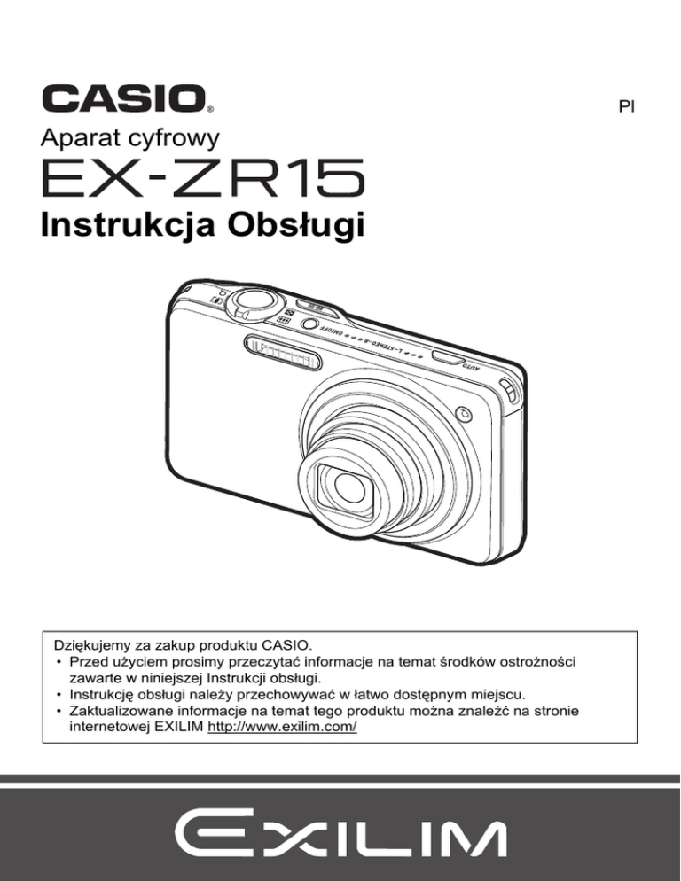 Pl Aparat cyfrowy Instrukcja Obsługi Dziękujemy za zakup produktu CASIO. • Przed użyciem prosimy przeczytać informacje na temat środków ostrożności zawarte w niniejszej Instrukcji obsługi. • Instrukcję obsługi należy przechowywać w łatwo dostępnym miejscu. • Zaktualizowane informacje na temat tego produktu można znaleźć na stronie internetowej EXILIM http://www.exilim.com/ Rozpakowanie Po rozpakowaniu aparatu, sprawdź czy wszystkie przedstawione poniżej akcesoria znajdują się w komplecie. Jeżeli zauważysz braki w wyposażeniu, skontaktuj się z punktem sprzedaży. Aparat cyfrowy Akumulator litowo-jonowy (NP-110) Zasilacz USB-AC (AD-C53U) * Kształt wtyczki przewodu zasilającego różni się w zależności od kraju lub obszaru geograficznego. Przewód zasilający Kabel USB 2 Skrócona instrukcja obsługi Koniecznie przeczytaj! • Treść niniejszego podręcznika może ulec zmianie bez powiadomienia. • Treść niniejszego podręcznika została skontrolowana na każdym etapie procesu produkcji. W przypadku zauważenia fragmentów budzących wątpliwości, błędów, itp., prosimy o kontakt. • Kopiowanie treści niniejszej Instrukcji obsługi, we fragmentach lub w całości, jest zabronione. Z wyjątkiem wykorzystania do celów osobistych, inne wykorzystanie treści tego podręcznika bez pozwolenia CASIO COMPUTER CO., LTD. jest zabronione na mocy praw autorskich. • CASIO COMPUTER CO., LTD. nie ponosi odpowiedzialności za wszelkie szkody lub utracone dochody poniesione przez nabywcę lub strony trzecie związane z użytkowaniem lub wadliwym działaniem niniejszego produktu. • CASIO COMPUTER CO., LTD. nie ponosi odpowiedzialności za wszelkie szkody, utraty dochodów oraz roszczenia poniesione przez nabywcę lub strony trzecie związane z użytkowaniem Photo Transport, Dynamic Photo Manager lub YouTube Uploader for CASIO. • CASIO COMPUTER CO., LTD. nie ponosi odpowiedzialności za wszelkie szkody lub utracone dochody spowodowane skasowaniem zawartości pamięci na skutek wadliwego działania, naprawy lub jakiegokolwiek innego powodu. • Prosimy pamiętać, że przykładowe ekrany i ilustracje produktu zamieszczone w niniejszej Instrukcji obsługi mogą różnić się nieznacznie od ekranów i konfiguracji prawdziwego aparatu. Monitor LCD Panel ciekłokrystaliczny ekranu monitora wykorzystuje wysokoprecyzyjną technologię, która zapewnia wydajność pikseli na poziomie ponad 99,99%. Oznacza to, że bardzo niewielka liczba pikseli może nie świecić się lub może świecić się przez cały czas. Wynika to z właściwości panelu ciekłokrystalicznego i nie oznacza wadliwego działania. Wykonaj próbne zdjęcia Przed zrobieniem końcowego zdjęcia, wykonaj zdjęcie próbne, aby sprawdzić czy aparat nagrywa poprawnie. 3 Spis treści Rozpakowanie . . . . . . . . . . . . . . . . . . . . . . . . . . . . . . . . . . . . . . . . . . . . . . Koniecznie przeczytaj! . . . . . . . . . . . . . . . . . . . . . . . . . . . . . . . . . . . . . . . . Informacje ogólne . . . . . . . . . . . . . . . . . . . . . . . . . . . . . . . . . . . . . . . . . . . Zawartość ekranu monitora . . . . . . . . . . . . . . . . . . . . . . . . . . . . . . . . . . . . Włączanie i wyłączanie informacji na wyświetlaczu . . . . . . . . . . . . .(Info.) ... 2 ... 3 ... 9 . . 10 . . 12 ❚❙ Szybki start 13 Co to jest aparat cyfrowy? . . . . . . . . . . . . . . . . . . . . . . . . . . . . . . . . . . . . . . . 13 Co można robić za pomocą aparatu CASIO . . . . . . . . . . . . . . . . . . . . . . . . . 14 Po pierwsze, przed użyciem naładuj akumulator. . . . . . . . . . . . . . . . . . . . . . 16 ❚ Aby włożyć akumulator . . . . . . . . . . . . . . . . . . . . . . . . . . . . . . . . . . . . . . . . . . . . 16 ❚ Naładuj akumulator . . . . . . . . . . . . . . . . . . . . . . . . . . . . . . . . . . . . . . . . . . . . . . . 17 Konfigurowanie podstawowych ustawień przy pierwszym włączeniu aparatu . . . . . . . . . . . . . . . . . . . . . . . . . . . . . . . . . . . . . . . . . . . . . 22 Przygotowanie karty pamięci . . . . . . . . . . . . . . . . . . . . . . . . . . . . . . . . . . . . . 23 ❚ Obsługiwane karty pamięci . . . . . . . . . . . . . . . . . . . . . . . . . . . . . . . . . . . . . . . . . 23 ❚ Aby włożyć kartę pamięci . . . . . . . . . . . . . . . . . . . . . . . . . . . . . . . . . . . . . . . . . . 24 ❚ Aby sformatować nową kartę pamięci . . . . . . . . . . . . . . . . . . . . . . . . . . . . . . . . 25 Włączanie i wyłączanie zasilania aparatu . . . . . . . . . . . . . . . . . . . . . . . . . . . 26 ❚ Aby włączyć zasilanie . . . . . . . . . . . . . . . . . . . . . . . . . . . . . . . . . . . . . . . . . . . . . 26 ❚ Aby wyłączyć aparat . . . . . . . . . . . . . . . . . . . . . . . . . . . . . . . . . . . . . . . . . . . . . . 26 Prawidłowe trzymanie aparatu. . . . . . . . . . . . . . . . . . . . . . . . . . . . . . . . . . . . 27 Aby zrobić zdjęcie . . . . . . . . . . . . . . . . . . . . . . . . . . . . . . . . . . . . . . . . . . . . . 28 ❚ Wybór trybu automatycznego nagrywania . . . . . . . . . . . . . . . . . . . . . . . . . . . . . 28 ❚ Aby zrobić zdjęcie . . . . . . . . . . . . . . . . . . . . . . . . . . . . . . . . . . . . . . . . . . . . . . . . 29 ❚ Rejestrowanie pięknych portretów . . . . . . . . . . . . . . . . . . (funkcja Makijaż) . . . 30 Przeglądanie zdjęć . . . . . . . . . . . . . . . . . . . . . . . . . . . . . . . . . . . . . . . . . . . . 32 Usuwanie zdjęć i filmów. . . . . . . . . . . . . . . . . . . . . . . . . . . . . . . . . . . . . . . . . 33 ❚ Aby usunąć pojedynczy plik . . . . . . . . . . . . . . . . . . . . . . . . . . . . . . . . . . . . . . . . 33 ❚ Aby usunąć wybrane pliki . . . . . . . . . . . . . . . . . . . . . . . . . . . . . . . . . . . . . . . . . . 34 ❚ Aby usunąć wszystkie pliki . . . . . . . . . . . . . . . . . . . . . . . . . . . . . . . . . . . . . . . 