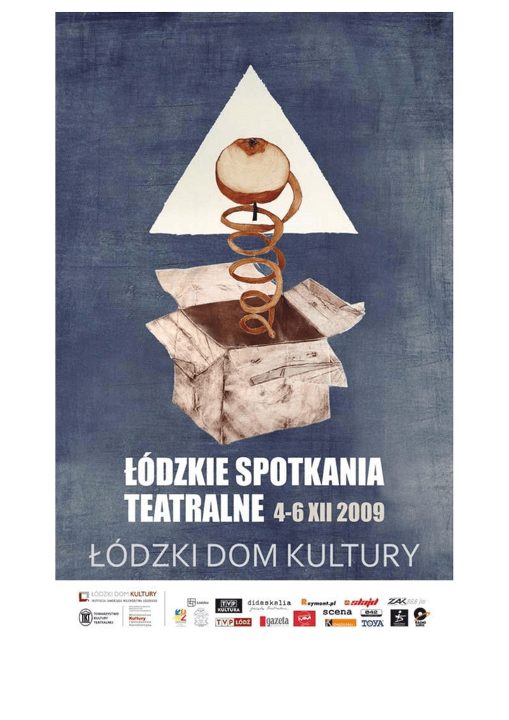 JURY Lech Śliwonik prezes Towarzystwa Kultury Teatralnej Zarządu Głównego w Warszawie, Dziekan Wydziału Wiedzy o Teatrze Akademii Teatralnej w Warszawie Ewa Wójciak aktorka, Dyrektor Teatru Ósmego Dnia w Poznaniu Paweł Passini reżyser Jury z wielką serdecznością i prawdziwym szacunkiem dziękuje Marianowi Glinkowskiemu. Tegorocznym Festiwalem postanowił on zamknąć 18-letni czyn artystyczny, który powołał do życia i przeprowadził przez trudne wiraże, ale także oazy piękna, dobra i prawdy. Łódź, 6 grudnia 2009 r. NAGRODY NAGRODY (równorzędne) Teatr Soliloquium z Łodzi za wysokiej próby aktorstwo w podejmującym istotny problem w spektaklu Spal mnie! Teatr Uhuru z Gryfina za spontaniczność i energie spektaklu Pierogi Teatr Palmera Eldritcha z Poznania za dojrzałość estetyczną i precyzyjną konstrukcję spektaklu Jarzenie NAGRODY SPECJALNE Jan Kasper za scenariusz spektaklu Czarna skrzynka Teatr Prób z Wągrowca Marta Pietruszka i Paulina Wysocka za wykonanie spektaklu 1287 Teatr Gestu i Ruchu z Krakowa. Nagrody ufundowało Ministerstwo Kultury i Dziedzictwa Narodowego SPEKTAKLE * gość ŁST ** prezentacje *** konkurs 1. Teatr Lustra Strona Druga (Sopot) Misja: WIOSNA *** 2. Akademia Ruchu (Warszawa) Esej III ** 3. Teatr Klinika (Bytom) Shoah *** 4. Stajnia Pegaza (Sopot) Była Żydówka, nie ma Żydówki ** 5. Teatr Soliloquium (Łódź) Spal mnie! *** 6. Teatr UHURU (Gryfino) Pierogi *** 7. Teatr Palmera Eldritcha (Poznań) Jarzenie *** 8. Teatr W Krzywym Zwierciadle (Stepnica) Puzzle *** 9. Manifestacja teatralna z udziałem Teatrów: Stajnia Pegaza, Brama, Kreatury, Rondo 10. Manifestacja teatralna z udziałem: Komuny Otwock, Teatrów: Realistycznego, Zielony Wiatrak, Art.51 11. Teatr Amareya (Gdańsk) Teatr anatomiczny *** 12. Teatr Porywacze Ciał (Poznań) More Heart Core! *** 13. Teatr Gestu i Ruchu (Kraków) 1278 *** 14. Teatr Prób (Wągrowiec) Czarna skrzynka *** 15. Komuna Otwock (Warszawa) Mill/Maslow ** 16. Teatr Dada von Bzdülöw (Gdańsk) Caffe Latte ** 17. Teatr Maisternia Pisni (Ukraina) On Sunday Morning * 18. Handa Gote (Czechy) Mushrooms * IMPREZY TOWARZYSZĄCE 1. Warszt teatralny Akademia Ruchu Prowadzenie: Jolanta Krukowska Świadomość ciała i trening ruchowy w pracy aktora 2. Seminarium Czy dzisiaj teatr ma język Prelegenci: Piotr Olkusz (dr Uniwersytetu Łódzkiego) Paweł Sztarbowski Joanna Dekarczew 3. Spotkanie Lech Raczak 4. Forum dyskusyjne: rozmowy o Północy, Popołudniowe (z udziałem twórców, krytyków, publiczności i jurorów - trzydniowe) ŁST 2009 zrealizowano z udziałem środków Ministra Kultury i Dziedzictwa Narodowego