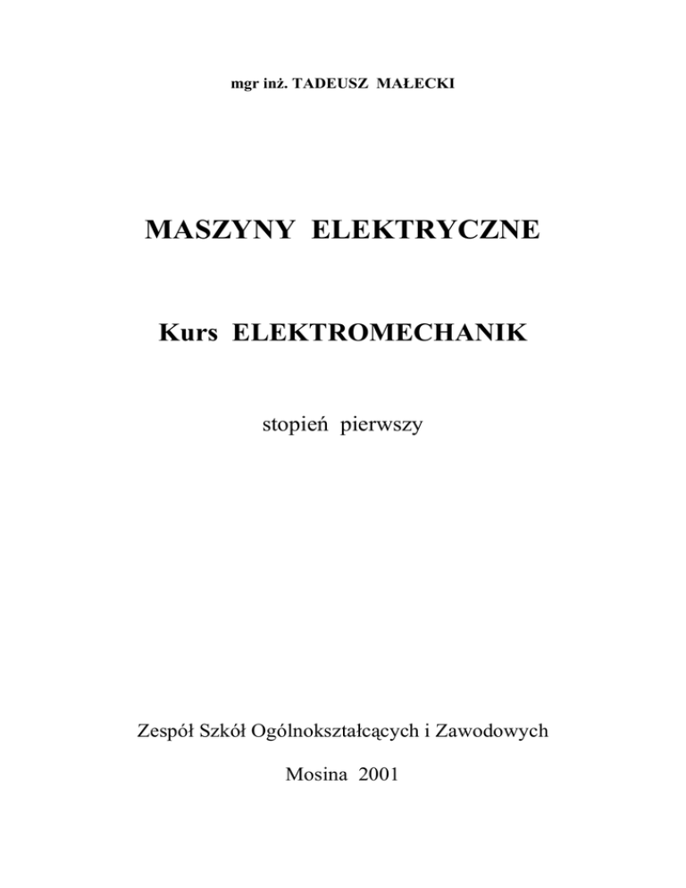 mgr inŜ. TADEUSZ MAŁECKI MASZYNY ELEKTRYCZNE Kurs ELEKTROMECHANIK stopień pierwszy Zespół Szkół Ogólnokształcących i Zawodowych Mosina 2001 Od autora Niniejszy skrypt został opracowany na podstawie rozkładu materiału nauczania obowiązującego dla przedmiotu maszyny elektryczne w zawodzie ELEKTROMECHANIK dla kursów pierwszego stopnia. Wobec braku podręcznika opartego na materiale programowym, skrypt ten będzie bardzo pomocny uczniom tak w opanowaniu przez nich wiedzy na lekcjach, jak i jej utrwalaniu w domu. Ze względu na bardzo zwięzłe rozwinięcie merytoryczne poszczególnych tematów lekcji, skrypt ten nie moŜe być uŜywany jako podręcznik do samokształcenia, ale moŜe stanowić przewodnik do samodzielnego zdobywania wiedzy, na co pozwala metodyczny układ treści. W oparciu o wytyczne zawarte w skrypcie, uczniowie mogą sami przygotowywać niektóre tematy lekcji. Posiadanie przez uczniów tego opracowania pozwoli na bardziej racjonalne wykorzystanie czasu przeznaczonego na lekcję. Strona 2 Spis treści Temat: Zasada działania prądnicy......................................................................... 3 Temat: Zasada działania silnika elektrycznego..................................................... 4 Temat: Budowa maszyny prądu stałego................................................................ 5 Temat: Oznaczenie uzwojeń maszyn prądu stałego.............................................. 6 Temat: Prądnica prądu stałego .............................................................................. 7 Temat: Prądnica obcowzbudna prądu stałego....................................................... 8 Temat: Charakterystyka zewnętrzna prądnicy obcowzbudnej.............................. 9 Temat: Prądnica samowzbudna prądu stałego .................................................... 10 Temat: ObciąŜenie prądnicy samowzbudnej prądu stałego................................ 11 Temat: Moment obrotowy silnika ....................................................................... 12 Temat: Silnik bocznikowy prądu stałego............................................................ 13 Temat: Charakterystyka mechaniczna silnika bocznikowego prądu stałego...... 14 Temat: Silnik szeregowy prądu stałego .............................................................. 15 Temat: Charakterystyka mechaniczna silnika szeregowego prądu stałego ........ 16 Temat: Rozruch silników prądu stałego.............................................................. 17 Temat: Rozruch silnika bocznikowego prądu stałego ........................................ 18 Temat: Rozruch silnika szeregowego prądu stałego........................................... 19 Temat: Regulacja obrotów silnika bocznikowego prądu stałego ....................... 20 Temat: Regulacja obrotów silnika szeregowego prądu stałego .......................... 21 Temat: Zmiana kierunku obrotów silnika bocznikowego prądu stałego ............ 22 Temat: Zmiana kierunku obrotów silnika szeregowego prądu stałego .............. 23 Temat: Zasada działania transformatora. ............................................................ 24 Temat: Budowa transformatora........................................................................... 25 Temat: Stan pracy jałowej transformatora. ......................................................... 26 Temat: Stan obciąŜenia transformatora............................................................... 27 Maszyny elektryczne - kurs pierwszego stopnia - ELEKTROMECHANIK Strona 3 Temat: Zasada działania prądnicy W prądnicach odbywa się proces przetwarzania energii mechanicznej w energię elektryczną. ENERGIA MECHANICZNA PRĄDNICA ENERGIA ELEKTRYCZNA Prądnica prądu stałego działa na zasadzie indukowania siły elektromotorycznej (sem) w przewodzie poruszającym się w polu magnetycznym. Przewód musi przecinać linie sił pola magnetycznego. Wartość siły elektromotorycznej obliczamy z wzoru E=B·l·v E - siła elektromotoryczna indukowana w poruszającym się przewodzie B - indukcja magnetyczna wytworzona przez bieguny N i S stojana l - długość przewodu objęta polem magnetycznym v - prędkość poruszania się przewodu Kierunek i zwrot indukowanej siły elektromotorycznej określamy za pomocą reguły prawej dłoni, która podaje: jeŜeli linie sił pola magnetycznego wchodzą w otwartą prawą dłoń, a odchylony kciuk wskazuje kierunek ruchu przewodu, to kierunek i zwrot indukowanej siły elektromotorycznej wyznaczają cztery wyprostowane palce. Maszyny elektryczne - kurs pierwszego stopnia - ELEKTROMECHANIK Strona 4 Temat: Zasada działania silnika elektrycznego W silnikach elektrycznych odbywa się proces przetwarzania energii elektrycznej w energię mechaniczną. ENERGIA ELEKTRYCZNA SILNIK ELEKTRYCZNY ENERGIA MECHANICZNA Działanie silnika elektrycznego oparte jest na wykorzystaniu prawa fizyki, które mówi, Ŝe na przewód w którym płynie prąd elektryczny umieszczony w polu magnetycznym działa siła mogąca wprawić go w ruch. Wartość siły działającej na przewód obliczamy z wzoru F=B·J·l F - siła działającej na przewód umieszczony w polu magnetycznym B - indukcja magnetyczna wytworzona przez bieguny N i S stojana J - prąd elektryczny płynący w przewodzie l - długość przewodu objęta polem magnetycznym Kierunek i zwrot siły działającej na przewód określamy za pomocą reguły lewej dłoni, która podaje: jeŜeli linie sił pola magnetycznego wchodzą w otwartą lewą dłoń, a cztery wyprostowane palce wskazują kierunek przepływu prądu, to odchylony kciuk określa kierunek i zwrot siły działającej na przewód. Maszyny elektryczne - kurs pierwszego stopnia - ELEKTROMECHANIK Strona 5 Temat: Budowa maszyny prądu stałego Maszyna prądu stałego składa się z następujących podstawowych elementów: 1. stojan 2. wirnik 3. komutator 4. urządzenie szczotkowe 5. osłony boczne z łoŜyskami Wirnik