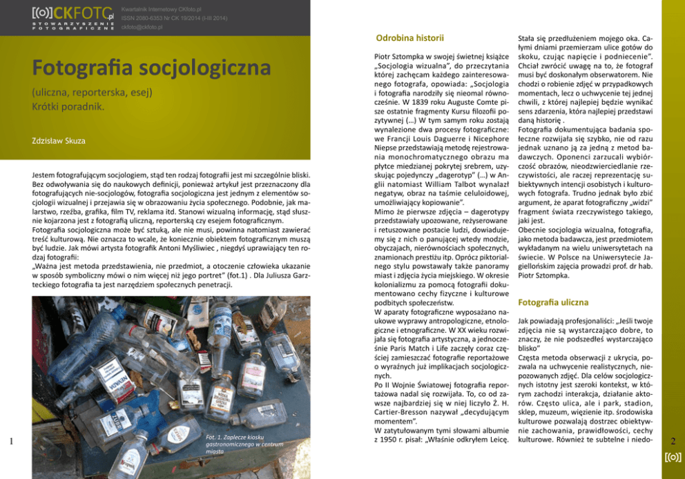 Kwartalnik Internetowy CKfoto.pl ISSN 2080-6353 Nr CK 19/2014 (I-III 2014) [email protected] Odrobina historii Fotografia socjologiczna (uliczna, reporterska, esej) Krótki poradnik. Zdzisław Skuza Jestem fotografującym socjologiem, stąd ten rodzaj fotografii jest mi szczególnie bliski. Bez odwoływania się do naukowych definicji, ponieważ artykuł jest przeznaczony dla fotografujących nie-socjologów, fotografia socjologiczna jest jednym z elementów socjologii wizualnej i przejawia się w obrazowaniu życia społecznego. Podobnie, jak malarstwo, rzeźba, grafika, film TV, reklama itd. Stanowi wizualną informację, stąd słusznie kojarzona jest z fotografią uliczną, reporterską czy esejem fotograficznym. Fotografia socjologiczna może być sztuką, ale nie musi, powinna natomiast zawierać treść kulturową. Nie oznacza to wcale, że koniecznie obiektem fotograficznym muszą być ludzie. Jak mówi artysta fotografik Antoni Myśliwiec , niegdyś uprawiający ten rodzaj fotografii: „Ważna jest metoda przedstawienia, nie przedmiot, a otoczenie człowieka ukazanie w sposób symboliczny mówi o nim więcej niż jego portret” (fot.1) . Dla Juliusza Garzteckiego fotografia ta jest narzędziem społecznych penetracji. 1 Fot. 1. Zaplecze kiosku gastronomicznego w centrum miasta Piotr Sztompka w swojej świetnej książce „Socjologia wizualna”, do przeczytania której zachęcam każdego zainteresowanego fotografa, opowiada: „Socjologia i fotografia narodziły się nieomal równocześnie. W 1839 roku Auguste Comte pisze ostatnie fragmenty Kursu filozofii pozytywnej (…) W tym samym roku zostają wynalezione dwa procesy fotograficzne: we Francji Louis Daguerre i Nicephore Niepse przedstawiają metodę rejestrowania monochromatycznego obrazu ma płytce miedzianej pokrytej srebrem, uzyskując pojedynczy „dagerotyp” (…) w Anglii natomiast William Talbot wynalazł negatyw, obraz na taśmie celuloidowej, umożliwiający kopiowanie”. Mimo że pierwsze zdjęcia – dagerotypy przedstawiały upozowane, reżyserowane i retuszowane postacie ludzi, dowiadujemy się z nich o panującej wtedy modzie, obyczajach, nierównościach społecznych, znamionach prestiżu itp. Oprócz piktorialnego stylu powstawały także panoramy miast i zdjęcia życia miejskiego. W okresie kolonializmu za pomocą fotografii dokumentowano cechy fizyczne i kulturowe podbitych społeczeństw. W aparaty fotograficzne wyposażano naukowe wyprawy antropologiczne, etnologiczne i etnograficzne. W XX wieku rozwijała się fotografia artystyczna, a jednocześnie Paris Match i Life zaczęły coraz częściej zamieszczać fotografie reportażowe o wyraźnych już implikacjach socjologicznych. Po II Wojnie Światowej fotografia reportażowa nadal się rozwijała. To, co od zawsze najbardziej się w niej liczyło Ż. H. Cartier-Bresson nazywał „decydującym momentem”. W zatytułowanym tymi słowami albumie z 1950 r. pisał: „Właśnie odkryłem Leicę. Stała się przedłużeniem mojego oka. Całymi dniami przemierzam ulice gotów do skoku, czując napięcie i podniecenie”. Chciał zwrócić uwagę na to, że fotograf musi być doskonałym obserwatorem. Nie chodzi o robienie zdjęć w przypadkowych momentach, lecz o uchwycenie tej jednej chwili, z której najlepiej będzie wynikać sens zdarzenia, która najlepiej przedstawi daną historię . Fotografia dokumentująca badania społeczne rozwijała się szybko, nie od razu jednak uznano ją za jedną z metod badawczych. Oponenci zarzucali wybiórczość obrazów, nieodzwierciedlanie rzeczywistości, ale raczej reprezentację subiektywnych intencji osobistych i kulturowych fotografa. Trudno jednak było zbić argument, że aparat fotograficzny „widzi” fragment świata rzeczywistego takiego, jaki jest. Obecnie socjologia wizualna, fotografia, jako metoda badawcza, jest przedmiotem wykładanym na wielu uniwersytetach na świecie. W Polsce na Uniwersytecie Jagiellońskim zajęcia prowadzi prof. dr hab. Piotr Sztompka. Fotografia uliczna Jak powiadają profesjonaliści: „Jeśli twoje zdjęcia nie są wystarczająco dobre, to znaczy, że nie podszedłeś wystarczająco blisko” Częsta metoda obserwacji z ukrycia, pozwala na uchwycenie realistycznych, niepozowanych zdjęć. Dla celów socjologicznych istotny jest szeroki kontekst, w którym zachodzi interakcja, działanie aktorów. Często ulica, ale i park, stadion, sklep, muzeum, więzienie itp. środowiska kulturowe pozwalają dostrzec obiektywnie zachowania, prawidłowości, cechy kulturowe. Również te subtelne i niedo- 2 telefony komórkowe, pozwalają na uzyskanie dostatecznie dobrych technicznie zdjęć o wystarczającej rozdzielczości. Pozostaje dylemat etyczny i prawny „fotograficznego podglądania”. Można spotkać się z opinią, że fotografia z ukrycia jest tchórzliwa i nie zasługuje na miano „street photo”. Bywają porady na internetowych forach fotograficznych, jak reagować na zdemaskowanie przez fotografowanego np. „Robisz zdjęcie a jak ktoś ma jakieś „ale” to cytujesz znanych ludzi i mówisz „Spieprzaj dziadu””. Trudno polecać tę metodę, podobnie jak cytowaną w literaturze przedmiotu strategię siłową „strzelaj fleszem i w nogi” . W aspekcie prawnym, bez wchodzenia w zawiłości przepisów, najogólniej mówi o tym doświadczony i uznany reportażysta Włodzimierz Barchacz: „Fotografować można wszystkich, jeśli nie zaburza się porządku publicznego. Publikować można za zgodą (także ustną – są przecież różne sytuacje i różni ludzie). Jeśli osoba stanowi szczegół całości – bez zgody. Także osoby publiczne w trakcie wykonywania obowiązków zawodowych. Naturalnie, jeśli nie ośmieszymy danej osoby”. Jak uzyskać zgodę na fotografowanie osoby? Autorka „Zapisu socjologicznego” z lat siedemdziesiątych ubiegłego wieku, Zofia Rydet stosowała socjotechnikę. Wybierając najstarsze chałupy do sfotografowania, mówiła: 