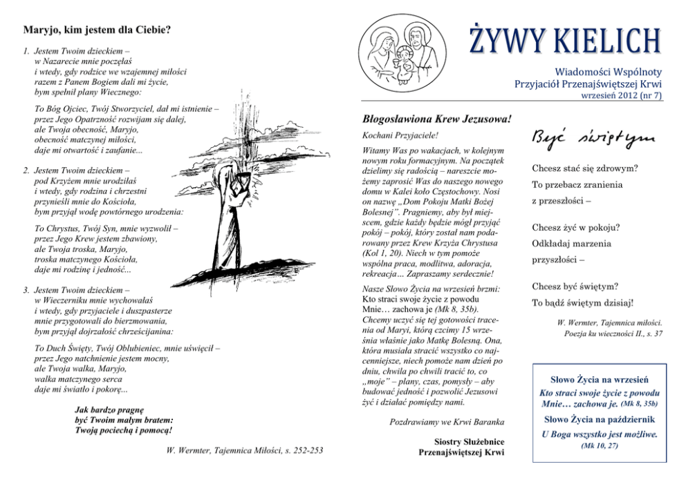 ŻYWY KIELICH Maryjo, kim jestem dla Ciebie? 1. Jestem Twoim dzieckiem – w Nazarecie mnie poczęłaś i wtedy, gdy rodzice we wzajemnej miłości razem z Panem Bogiem dali mi życie, bym spełnił plany Wiecznego: To Bóg Ojciec, Twój Stworzyciel, dał mi istnienie – przez Jego Opatrzność rozwijam się dalej, ale Twoja obecność, Maryjo, obecność matczynej miłości, daje mi otwartość i zaufanie... 2. Jestem Twoim dzieckiem – pod Krzyżem mnie urodziłaś i wtedy, gdy rodzina i chrzestni przynieśli mnie do Kościoła, bym przyjął wodę powtórnego urodzenia: To Chrystus, Twój Syn, mnie wyzwolił – przez Jego Krew jestem zbawiony, ale Twoja troska, Maryjo, troska matczynego Kościoła, daje mi rodzinę i jedność... 3. Jestem Twoim dzieckiem – w Wieczerniku mnie wychowałaś i wtedy, gdy przyjaciele i duszpasterze mnie przygotowali do bierzmowania, bym przyjął dojrzałość chrześcijanina: To Duch Święty, Twój Oblubieniec, mnie uświęcił – przez Jego natchnienie jestem mocny, ale Twoja walka, Maryjo, walka matczynego serca daje mi światło i pokorę... Jak bardzo pragnę być Twoim małym bratem: Twoją pociechą i pomocą! W. Wermter, Tajemnica Miłości, s. 252-253 Wiadomości Wspólnoty Przyjaciół Przenajświętszej Krwi wrzesień 2012 (nr 7) Błogosławiona Krew Jezusowa! Kochani Przyjaciele! Witamy Was po wakacjach, w kolejnym nowym roku formacyjnym. Na początek dzielimy się radością – nareszcie możemy zaprosić Was do naszego nowego domu w Kalei koło Częstochowy. Nosi on nazwę „Dom Pokoju Matki Bożej Bolesnej”. Pragniemy, aby był miejscem, gdzie każdy będzie mógł przyjąć pokój – pokój, który został nam podarowany przez Krew Krzyża Chrystusa (Kol 1, 20). Niech w tym pomoże wspólna praca, modlitwa, adoracja, rekreacja… Zapraszamy serdecznie! Nasze Słowo Życia na wrzesień brzmi: Kto straci swoje życie z powodu Mnie… zachowa je (Mk 8, 35b). Chcemy uczyć się tej gotowości tracenia od Maryi, którą czcimy 15 września właśnie jako Matkę Bolesną. Ona, która musiała stracić wszystko co najcenniejsze, niech pomoże nam dzień po dniu, chwila po chwili tracić to, co „moje” – plany, czas, pomysły – aby budować jedność i pozwolić Jezusowi żyć i działać pomiędzy nami. Pozdrawiamy we Krwi Baranka Siostry Służebnice Przenajświętszej Krwi Chcesz stać się zdrowym? To przebacz zranienia z przeszłości – Chcesz żyć w pokoju? Odkładaj marzenia przyszłości – Chcesz być świętym? To bądź świętym dzisiaj! W. Wermter, Tajemnica miłości. Poezja ku wieczności II., s. 37 Słowo Życia na wrzesień Kto straci swoje życie z powodu Mnie… zachowa je. (Mk 8, 35b) Słowo Życia na październik U Boga wszystko jest możliwe. (Mk 10, 27) Godzina pytań Jak zostać świętym w naszych czasach? Stać się świętym – to w ogóle nie brzmi atrakcyjnie! W oczach wielu wygląda to jak coś przesadnego, głupiego. „To świętoszek!” – takie określenie ma wydźwięk negatywny. To jednak jest wielka pomyłka, bo właściwie „być świętym” nie znaczy nic innego niż być prawdziwym człowiekiem, który żyje w jedności z Panem Bogiem – być pełnym człowiekiem, być sobą według miary człowieczeństwa, według chrztu świętego, według Pisma świętego. Żyć tym, co dał nam Jezus. To jest świętość. I jak to robić, aby stać się świętym? Niedawno na skupieniu dla dzieci było podobne pytanie i podałem dzieciom takie trzy punkty. Po pierwsze, staraj się być przyjacielem Chrystusa. Nie wystarczy być w porządku wobec Niego – być przyjacielem to znaczy nie tylko robić to, co musi być zrobione, ale też to, co Jemu się bardziej podoba. Jeżeli ciągle na nowo stawiasz sobie to pytanie, gdy musisz wybierać albo decydować: „Co Jemu bardziej się podoba?” – wtedy stajesz się przyjacielem Chrystusa. Po drugie – szanować każdy Krzyż. Jasne, że jeżeli jesteś przyjacielem Chrystusa, to ważne staje się dla ciebie to, co jest ważne dla Jezusa. Dla Niego istotny jest krzyż. Na krzyżu nas zbawił, na krzyżu też mnie znosił i kochał – kochał aż do Krwi. I krzyżem, który spotykam w swoim życiu, może być brzydka pogoda, nieporozumienie z mamą, kłótnia z kolegą. Może to być niesprawiedliwość ze strony nauczyciela, niezręczna sytuacja, choroba albo coś podobnego. Mamy szanować, a nawet całować każdy swój krzyż. Całujemy czasami krzyż symbolicznie – w czasie osobistej modlitwy albo w kościele, np. w Wielki Piątek. Całujemy go uroczyście, ale rozumiemy, że nie tylko o to chodzi. Właściwy sens jest w życiu. Całować swój krzyż w codziennym życiu znaczy więcej niż tylko go znosić. I trzeci punkt – stworzyć jedność. W każdej nowej sytuacji trzeba robić to, co bardziej tworzy jedność, co zjednoczy wszystkich. Rozwijać w sobie wyczucie jedności. Człowiek pierwszy zaczyna szukać tego, co bardziej zjednoczy z kimkolwiek – jadąc samochodem albo w klasie, w rodzinie, przy stole, w kościele, śpiewając, na spacerze… Na tym polega tajemnica nieba, bo w niebie jedność będzie pełna. I zjednoczyć się – to zazwyczaj znaczy dopasować się. Jeżeli dwie pięści są zamknięte, wtedy to boli, gdy się zderzają i to nie jest żadna jedność. Jedność powstaje wtedy, jeżeli przynajmniej jedna dłoń się otwiera, aby ogrzać drugą. To już o wiele lepiej – już mniej boli, jest cieplej. Ale to też jeszcze nie jest pełna jedność. Pełna jedność powstaje wtedy, gdy otwiera się jedna i druga dłoń, i najpełniejsza jest wtedy, gdy razem modlą się do Pana Boga. To właśnie dzieje się między nami przez to, że daję ciepło, otwieram się na drugiego, chociaż ma swoje trudne strony, aż możemy wspólnie modlić się i w Panu Bogu naprawdę znaleźć pełną jedność, która się trzyma i którą trudno rozerwać. W tych trzech punktach można podsumować całą naszą duchową dro