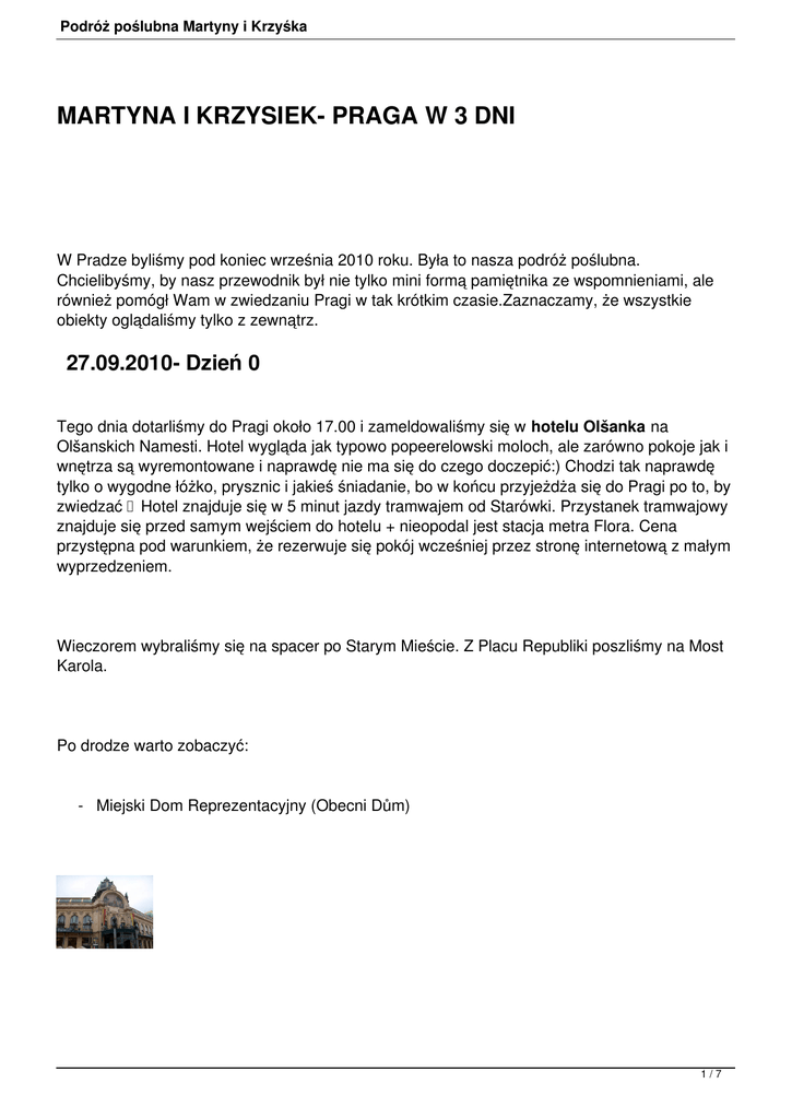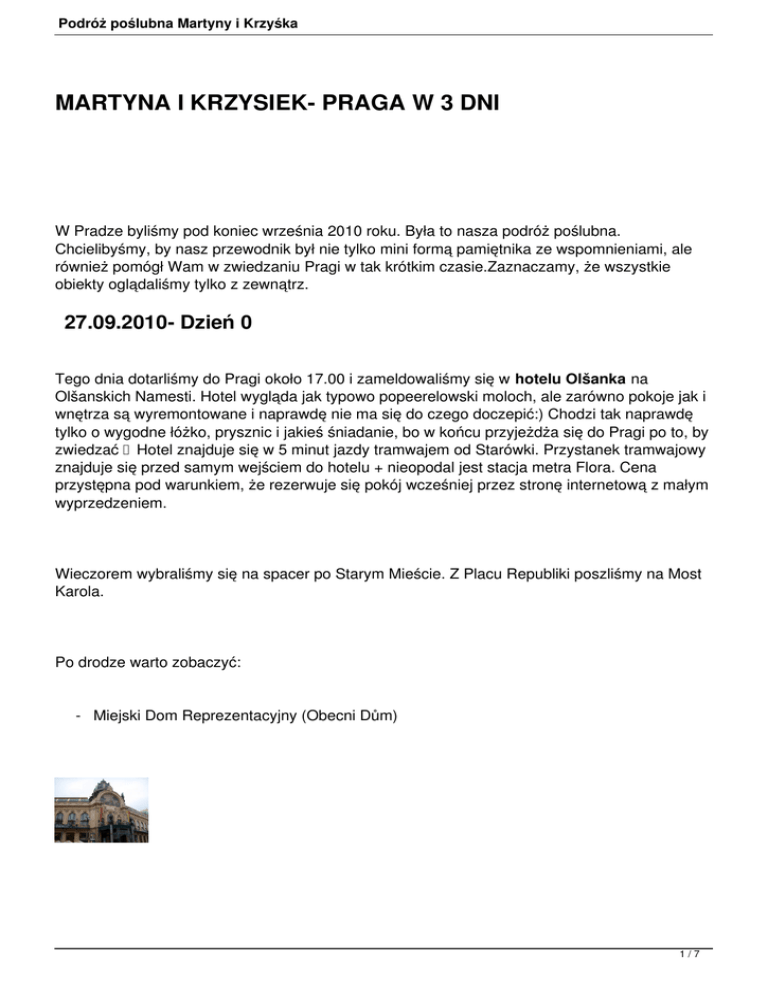 Podróż poślubna Martyny i Krzyśka MARTYNA I KRZYSIEK- PRAGA W 3 DNI W Pradze byliśmy pod koniec września 2010 roku. Była to nasza podróż poślubna. Chcielibyśmy, by nasz przewodnik był nie tylko mini formą pamiętnika ze wspomnieniami, ale również pomógł Wam w zwiedzaniu Pragi w tak krótkim czasie.Zaznaczamy, że wszystkie obiekty oglądaliśmy tylko z zewnątrz. 27.09.2010- Dzień 0 Tego dnia dotarliśmy do Pragi około 17.00 i zameldowaliśmy się w hotelu Olšanka na Olšanskich Namesti. Hotel wygląda jak typowo popeerelowski moloch, ale zarówno pokoje jak i wnętrza są wyremontowane i naprawdę nie ma się do czego doczepić:) Chodzi tak naprawdę tylko o wygodne łóżko, prysznic i jakieś śniadanie, bo w końcu przyjeżdża się do Pragi po to, by zwiedzać ☺ Hotel znajduje się w 5 minut jazdy tramwajem od Starówki. Przystanek tramwajowy znajduje się przed samym wejściem do hotelu + nieopodal jest stacja metra Flora. Cena przystępna pod warunkiem, że rezerwuje się pokój wcześniej przez stronę internetową z małym wyprzedzeniem. Wieczorem wybraliśmy się na spacer po Starym Mieście. Z Placu Republiki poszliśmy na Most Karola. Po drodze warto zobaczyć: - Miejski Dom Reprezentacyjny (Obecni Dům) 1/7 Podróż poślubna Martyny i Krzyśka - Bramę Prochową - Kościół Najświętszej Marii Panny przed Tynem na Rynku Starego Miasta - Zegar Orloj na Ratuszu 2/7 Podróż poślubna Martyny i Krzyśka - Most Karola z Bramą Staromiejską i Bramą Malostranską knajpy Jak zrobić lewo w zwychodzą pasaż autorka tarasu handlowy widokowego strony fajne fotki. i przed zaraz na na bulwarach za pasażem najładniejsze wełtawskich. wBramą prawo. zdjęcia Na Przed Mostu końcu Bramą Karola deptaka Staromiejską nocą jest iknajpka Hradczan skręca i sprzed można się w - już Muzeum Tortur pamiątkami. (jest wspomniałam spory szyld I zaraz informacyjny). wyżej, powspomniała, wejściu Staromiejską ten pasaż, po prawej jest stronie pasaż znajduje handlowy się z kiczowatymi Muzeum Tortur 28.09.2010- Dzień 1 - Kościół Św. Ludwiki na Vinohradah (nad stacją metra Namesti Miru) - Vaclavskie Namesti z górującym gmachem Muzeum Narodowego - Żydowskie miasto- dzielnica Josefov 3/7 Podróż poślubna Martyny i Krzyśka - Synagoga Staronowa i Muzeum Żydowskie ( w tle) - klientów Synagoga Hiszpańska Możemy polecić knajpę Tkalcovsky Dvur, Urquell U mało Lužického i Kozela), wygłodniałym semináře (może no idlatego, przede 28. oczekującym Mawszystkim że ona nieklimatyczny jest szybciej. smacznie aż gdzie tak wystrój, zauważalna), ( wzjeść. miarę kolejną Knajpa tanio alezaletą można znajduje dziękijest napić temu się to, dania się że na knajpa Malej piwa są (Pillsner Strane, ma ww w.tkalcovskydvur.com )podawane - Park Vojana Park znajduje się nieopodal naszej „stołówki”Tkalvovskyego. - ten Ogrody Walensteina Piękny pawie albinosy zespół pałacowoz chęcią pozują parkowy do ze zdjęć ścianą ☺ arktyczną. W pałacyku znajduje się czeski Senat, a 4/7 Podróż poślubna Martyny i Krzyśka -Hradczanach Hradczany przypałacowe. Na „następny raz” zostawiliśmy widzieliśmysobie Zamek Złotą Królewski, uliczkę (może Katedrę jużŚw. będzie Wita,otwarta) Bazylikęoraz Św.ogrody Andrzeja. Na 29.09.2010- Dzień 2 - Synagoga Jubileuszowa (Wielka) 5/7 Podróż poślubna Martyny i Krzyśka Zbudowana Stiassnego islamskiej. wwŚw. mieszanym 1906 roku, przy stylu ulicy secesji Jerozolimskiej oraz mauretańskiego, w linową. Nowym Mieście, z domieszkami według projektu Wilhelma Wzgórze Petrin a Ponieważ potem przeszliśmy było zimno, się wjechaliśmy wokół Kościoła na Św.stylu Michała kolejką Archanioła. Najpierw weszliśmy nasztuki Rozhledną, - Rozhledna (wieża widokowa zbudowana na wzór Wieży Eiffla) Kościół Michała Archanioła i Petrin fragment Muru Głodowego Niestety niestatkiem widzieliśmy Luster anidoObserwatorium - Rejs spodLabiryntu Mostu Czechowa Wyszehradu i zAstronomicznego:( powrotem byliśmy Decydując innej nastacją się górze. na taki Widzieliśmy od rejs, strony macie Wełtawy. jei Starym tylko okazję zWzgórze pokładu zobaczyć Wyszehradzkie statku. praskie mostyTarg. jest oraz piękne. StareOwocowym iNiestety, Nowe Miasto nie z - perspektywy, Owocny Trh iTeatr Teatr Stanów Pomiędzy swoją siedzibę ma metra Mustek Stanów. Miastem jest Owocowy Przy Targu 30.09.2010- Dzień 3 - Rudolfinum 6/7 Podróż poślubna Martyny i Krzyśka - Pomnik Jana Husa na Rynku Starego Miasta Ten mini przewodnik wzbogaciliśmy naszymi fotkami. Mamy nadzieję, że będzie on służył dobrze innym. Niektórych obiektów nie opisywaliśmy, bo i tak nasz przewodnik zajął bardzo dużo, a na stronie Złotej Pragi wiele z obiektów jest opisanych dokładnie.. ☺ Pozdrawiamy ☺ Martyna i Krzysiek 7/7