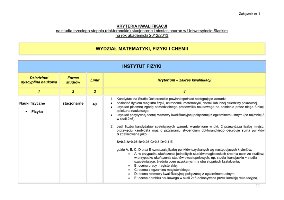 Załącznik nr 1 KRYTERIA KWALIFIKACJI na studia trzeciego stopnia (doktoranckie) stacjonarne i niestacjonarne w Uniwersytecie Śląskim na rok akademicki 2012/2013 WYDZIAŁ MATEMATYKI, FIZYKI I CHEMII INSTYTUT FIZYKI Dziedzina/ dyscyplina naukowa Forma studiów Limit Kryterium – zakres kwalifikacji 1 2 3 4 Nauki fizyczne Fizyka stacjonarne 40 1. Kandydaci na Studia Doktoranckie powinni spełniać następujące warunki: posiadać dyplom magistra fizyki, astronomii, matematyki, chemii lub innej dziedziny pokrewnej, uzyskać pisemną zgodę samodzielnego pracownika naukowego na pełnienie przez niego funkcji opiekuna naukowego, uzyskać pozytywną ocenę rozmowy kwalifikacyjnej połączonej z egzaminem ustnym (co najmniej 3 w skali 2÷5). 2. Jeśli liczba kandydatów spełniających warunki wymienione w pkt. 2 przewyższa liczbę miejsc, o przyjęciu kandydata oraz o przyznaniu stypendium doktoranckiego decyduje suma punktów S zdefiniowana jako: S=0.3 A+0.05 B+0.05 C+0.5 D+0.1 E gdzie A, B, C, D oraz E oznaczają liczbę punktów uzyskanych wg następujących kryteriów: A: w przypadku ukończenia jednolitych studiów magisterskich średnia ocen ze studiów; w przypadku ukończenia studiów dwustopniowych, np. studia licencjackie + studia uzupełniające, średnia ocen uzyskanych na obu stopniach kształcenia; B: ocena pracy magisterskiej; C: ocena z egzaminu magisterskiego; D: ocena rozmowy kwalifikacyjnej połączonej z egzaminem ustnym; E: ocena dorobku naukowego w skali 2÷5 dokonywana przez komisję rekrutacyjną. 11 Załącznik nr 1 3. Przedmiotem egzaminu ustnego, o którym mowa w punktach 1 i 2, jest wiedza zawarta w dwóch wykładach, wybranych przez kandydata na studia doktoranckie spośród następujących wykładów: Wstęp do fizyki atomowej i molekularnej Wstęp do fizyki jądra atomowego Wstęp do fizyki fazy skondensowanej Wstęp do fizyki cząstek elementarnych Wstęp do astrofizyki Wstęp do teorii ciała stałego Chemia organiczna Chemia nieorganiczna Chemia analityczna Chemia fizyczna i spektroskopia molekularna 4. Osoby ze stopniem magistra zakwalifikowane w drodze konkursu do udziału w polskich lub międzynarodowych projektach naukowych mogą zostać przyjęte na studia doktoranckie w IF UŚ bez dodatkowego postępowania kwalifikacyjnego. PhD in Physics stacjonarne 5 5. W przypadku obcokrajowców ustalona będzie oddzielna lista rankingowa, o przyjęciu na studia doktoranckie decydować będą następujące zasady szczegółowe. Kandydaci muszą spełnić następujące warunki: -posiadać dyplom magistra fizyki, astronomii, matematyki, chemii lub innej dziedziny pokrewnej, -posługiwać się językiem angielskim w stopniu umożliwiającym studiowanie i prowadzenie badań naukowych w tym języku, -przedstawić list rekomendacyjny od opiekuna naukowego pracy magisterskiej oraz list rekomendacyjny od pracownika samodzielnego uczelni macierzystej kandydata, -uzyskać pisemną zgodę samodzielnego pracownika naukowego Instytutu Fizyki na pełnienie przez niego funkcji opiekuna naukowego, -przedstawić CV, -zdać egzamin z podstaw fizyki na poziomie studiów magisterskich II stopnia. 12 Załącznik nr 1 INSTYTUT MATEMATYKI Dziedzina / dyscyplina naukowa Forma studiów stacjonarne Limit 10 Nauki matematyczne: Matematyka niestacjonarne 10 Kryteria – zakres kwalifikacji 1. Proces kwalifikacyjny prowadzić będzie komisja powołana przez Dziekana na wniosek Rady Instytutu Matematyki UŚ, spośród swoich członków. Obejmować on będzie rozmowę kwalifikacyjną, podczas której kandydat przedstawi swoje plany dotyczące uzyskania stopnia doktora oraz egzamin ustny z jednej (do wyboru) z dziedzin matematycznych reprezentowanej w UŚ. I. Przedmiotem egzaminu ustnego może być: algebra, analiza matematyczna, informatyka, rachunek prawdopodobieństwa, topologia i podstawy matematyki, równania różniczkowe. II: Ocena rozmowy kwalifikacyjnej oraz ocena egzaminu ustnego przedstawiona zostaje w zwyczajowej skali liczbowej 2 ÷ 5. III. W przypadku rozmowy kwalifikacyjnej oceniana będzie perspektywa uzyskania stopnia doktora i przydatność kandydata dla Instytutu Matematyki UŚ. IV. Obie wspomniane powyżej oceny umieszczone zostaną w protokole procesu kwalifikacyjnego. 2. Warunkiem koniecznym przyjęcia na studia doktoranckie z matematyki w UŚ będzie: I. Przedstawienie w terminie wszystkich wymaganych dokumentów, a w szczególności dyplomu i opinii wraz z deklaracją opieki naukowej. Dotyczy to kandydatów na studia stacjonarne i niestacjonarne. II. Pozytywna (przynajmniej dostateczna) ocena rozmowy kwalifikacyjnej i pozytywna ocena egzaminu ustnego. III. W przypadku gdy liczba kandydatów spełniających powyższe warunki (I) oraz (II) przewyższa liczbę miejsc na studiach doktoranckich o przyjęciu oraz ewentualnym przyznaniu stypendium, decydować będzie suma punktów: S = A+ 2B+ C gdzie A to ocena z dyplomu jednolitych studiów magisterskich lub średnia ocen z dyplomu licencjackiego i studiów uzupełniających; B ocena z egzaminu ustnego; C ocena rozmowy kwalifikacyjnej. 13