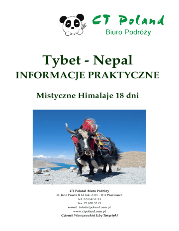 Tybet - Nepal INFORMACJE PRAKTYCZNE Mistyczne Himalaje 18 dni CT Poland Biuro Podróży al. Jana Pawła II 61 lok. 2, 01 – 031 Warszawa tel. 22 654 51 33 fax: 22 620 52 71 e-mail: [email protected] www.ctpoland.com.pl Członek Warszawskiej Izby Turystyki CHARAKTERYSTYKA TRASY Trasa Mistyczne Himalaje 18 dni to jedna z najpiękniejszych widokowo tras w ofercie CT Poland. Trasa obejmuje zwiedzanie najważniejszych miejsc w Tybecie, związanych z religią, historią i kulturą Tybetu jak Pałac Potala, świątynię Jokhang czy klasztor Sakya. Po mistycznym i surowym Tybecie zabierzemy Państwa do gorącego, kipiącego roślinnością Nepalu, gdzie przy odrobinie szczęścia ośnieżony szczyt Annapurny ukaże się o wschodzie słońca. Trasa łączy dwa państwa, dwie kultury, dwie religie. Wspólnym mianownikiem będą Himalaje, których szczyty górują nad Tybetem i stanowią równocześniej granicę Nepalu. PRZELOTY MIĘDZYNARODOWE Przeloty odbywają się samolotami rejsowymi z międzylądowaniem w jednym z europejskich portów lotniczych. Dokładne informacje o godzinach przelotów i zbiórce otrzymają Państwo w liście przewodnim. Podczas niektórych lotów na terenie Europy, linie lotnicze nie zapewniają posiłku oraz napojów. Wówczas istnieje możliwość kupienia kanapki na pokładzie za ok. 5 EUR/szt. Podczas długich rejsów do i z Azji serwowane będą dwa posiłki, w tym co najmniej jeden ciepły oraz zimne i ciepłe napoje. Wybór miejsca w samolocie możliwy jest tylko podczas odprawy na lotnisku. DOKUMENTY PODRÓŻY Podczas spotkania na lotnisku pilot przekaże Państwu dokumenty podróży: paszport (jeśli nie odebrali go Państwo wcześniej z biura), wydruk biletu elektronicznego na przelot międzynarodowy oraz polisę ubezpieczeniową. Pilot wręczy Państwu również zawieszki na bagaże. Dokumenty te zostaną wydane po okazaniu dowodu osobistego lub kopii umowy z naszym biurem. Bilety na wszystkie przeloty wewnętrzne w Chinach i Nepalu będzie miał ze sobą lokalny przewodnik. UWAGA: Po odprawie prosimy nie wyrzucać wydruku biletu elektronicznego. Może okazać się on niezbędny podczas powrotnego lotu do Polski. Zgodnie z obowiązującymi przepisami w przypadku opóźnienia lub odwołania lotu linia lotnicza zapewnia przelot w późniejszym terminie, a jeśli to konieczne także nocleg i wyżywienie. BAGAŻ PODCZAS PRZELOTÓW MIĘDZYNARODOWYCH I WEWNĄTRZ CHIN I NEPALU Bagaż główny: Każdy pasażer może mieć jedną sztukę bagażu głównego. Waga bagażu nadanego przez 1 osobę w trakcie odprawy biletowo-bagażowej nie powinna przekraczać 20 kg lub 23 kg (w zależności od linii lotniczej). Dla dwóch lub więcej osób posiadających jedną sztukę wspólnego bagażu, waga bagażu nie może przekroczyć również 20 kg lub 23 kg. Informacje o przewoźniku oraz o limicie bagażowym znajdą Państwo w liście, który prześlemy na ok. dwa tygodnie przed wylotem. Podczas przelotów wewnątrz Chin i Nepalu ciężar nadanego bagażu nie może przekroczyć 20 kg/os. Każda linia lotnicza ma własny taryfikator opłat za nadbagaż (np. KLM, Finnair ok. 80 EUR za kolejny bagaż o wadze do 23 kg, w Chinach ok. 10 RMB za każdy dodatkowy kilogram nadawanego bagażu). UWAGA: Prosimy pamiętać o podpisaniu bagażu i zapięciu na szyfr lub kłódkę. Nasze firmowe zawieszki otrzymają Państwo z rąk pilota na lotnisku. Warto zaopatrzyć się w kłódki z certyfikatem TSA (Transportation Security Administration). Służby celne mają prawo otworzyć walizkę w celach kontroli bezpieczeństwa. Tylko takie kłódki mogą być otwarte przez służby celne bez uszkadzania ich. Pozostałe po otwarciu nie nadają się już do użytku. Tyczy się to jednak tylko służb celnych w Europie i USA. Bagaż podręczny: 1 sztuka, nieprzekraczająca wymiarami sześcianu o wymiarach 55cm / 40cm / 20cm i nie cięższą niż 5-7 kg (zależnie od linii lotniczych); a także płaszcz, parasol, niewielkich rozmiarów torebkę i niewielką ilość materiałów do czytania na pokładzie samolotu. Wszystkich pasażerów obowiązują przepisy dot. przewozu bagażu, np. zakaz przewozu przedmiotów niebezpiecznych oraz przepisy celne i graniczne. PAKOWANIE BAGAŻU GŁÓWNEGO Z uwagi na charakter wycieczki najwygodniejszym bagażem będzie walizka na kółkach o niewielkich rozmiarach. Podczas pakowania przydatne okażą się duże plastikowe torby. Może się zdarzyć, że w trakcie podróży część ubrań zamoknie od deszczu czy wilgoci w powietrzu. W wilgotnym klimacie ubrania schną wiele dni i przełożenie ich do oddzielnych plastikowych toreb pozwoli oddzielić je od reszty suchych ubrań. Zdarza się, że podczas lotu kosmetyki tracą szczelność i rozlewają się w bagażu. Dobrze jest je również zapakować w oddzielne plastikowe woreczki. Jeśli podróżujemy z drugą osobą, mając do dyspozycji dwie walizki, dobrze jest spakować część rzeczy każdej z osób do jednej, pozostałe do drugiej. W przypadku zagubienia jednego bagażu przez linie lotnicze, co zdarza się bardzo rzadko, pozwoli to komfortowo doczekać momentu dostarczenia przez linię zagubionego bagażu. Podczas wycieczki usługi bagażowe w hotelach, na lotnisku czy na granicy chińsko-nepalskiej nie są objęte ceną wycieczki, w niektórych miejscach nie są one w ogóle dostępne. Może się zdarzyć, że będą Państwo musieli sami przenieść bagaż z autokaru do hali odlotów lub z jednej granicy na drugą. PAKOWANIE BAGAŻU PODRĘCZNEGO Bagaż podręczny nie powinien być zbyt duży i ciężki. Warto trzymać dokumenty lub pieniądze w oddzielnych saszetkach, dodatkowo w plastikowych torbach, co ochroni jest przed kurzem czy wilgocią. Tyczy się to głównie paszportu, biletów lotniczych czy pieniędzy. Ze względu na przelot samolotem (zarówno podczas przelotów międzynarodowych, jak i wewnątrz Chin i Nepalu) w bagażu podręcznym nie wolno przewozić przedmiotów zaliczanych do niebezpiecznych