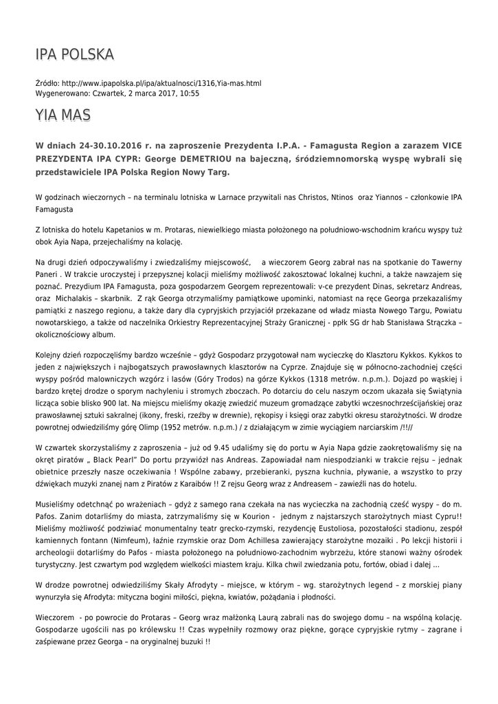 IPA POLSKA Źródło: http://www.ipapolska.pl/ipa/aktualnosci/1316,Yia-mas.html Wygenerowano: Czwartek, 2 marca 2017, 10:55 YIA MAS W dniach 24-30.10.2016 r. na zaproszenie Prezydenta I.P.A. - Famagusta Region a zarazem VICE PREZYDENTA IPA CYPR: George DEMETRIOU na bajeczną, śródziemnomorską wyspę wybrali się przedstawiciele IPA Polska Region Nowy Targ. W godzinach wieczornych – na terminalu lotniska w Larnace przywitali nas Christos, Ntinos oraz Yiannos – członkowie IPA Famagusta Z lotniska do hotelu Kapetanios w m. Protaras, niewielkiego miasta położonego na południowo-wschodnim krańcu wyspy tuż obok Ayia Napa, przejechaliśmy na kolację. Na drugi dzień odpoczywaliśmy i zwiedzaliśmy miejscowość, a wieczorem Georg zabrał nas na spotkanie do Tawerny Paneri . W trakcie uroczystej i przepysznej kolacji mieliśmy możliwość zakosztować lokalnej kuchni, a także nawzajem się poznać. Prezydium IPA Famagusta, poza gospodarzem Georgem reprezentowali: v-ce prezydent Dinas, sekretarz Andreas, oraz Michalakis – skarbnik. Z rąk Georga otrzymaliśmy pamiątkowe upominki, natomiast na ręce Georga przekazaliśmy pamiątki z naszego regionu, a także dary dla cypryjskich przyjaciół przekazane od władz miasta Nowego Targu, Powiatu nowotarskiego, a także od naczelnika Orkiestry Reprezentacyjnej Straży Granicznej - ppłk SG dr hab Stanisława Strączka – okolicznościowy album. Kolejny dzień rozpoczęliśmy bardzo wcześnie – gdyż Gospodarz przygotował nam wycieczkę do Klasztoru Kykkos. Kykkos to jeden z największych i najbogatszych prawosławnych klasztorów na Cyprze. Znajduje się w północno-zachodniej części wyspy pośród malowniczych wzgórz i lasów (Góry Trodos) na górze Kykkos (1318 metrów. n.p.m.). Dojazd po wąskiej i bardzo krętej drodze o sporym nachyleniu i stromych zboczach. Po dotarciu do celu naszym oczom ukazała się Świątynia licząca sobie blisko 900 lat. Na miejscu mieliśmy okazję zwiedzić muzeum gromadzące zabytki wczesnochrześcijańskiej oraz prawosławnej sztuki sakralnej (ikony, freski, rzeźby w drewnie), rękopisy i księgi oraz zabytki okresu starożytności. W drodze powrotnej odwiedziliśmy górę Olimp (1952 metrów. n.p.m.) / z działającym w zimie wyciągiem narciarskim /!!// W czwartek skorzystaliśmy z zaproszenia – już od 9.45 udaliśmy się do portu w Ayia Napa gdzie zaokrętowaliśmy się na okręt piratów „ Black Pearl” Do portu przywiózł nas Andreas. Zapowiadał nam niespodzianki w trakcie rejsu – jednak obietnice przeszły nasze oczekiwania ! Wspólne zabawy, przebieranki, pyszna kuchnia, pływanie, a wszystko to przy dźwiękach muzyki znanej nam z Piratów z Karaibów !! Z rejsu Georg wraz z Andreasem – zawieźli nas do hotelu. Musieliśmy odetchnąć po wrażeniach – gdyż z samego rana czekała na nas wycieczka na zachodnią cześć wyspy – do m. Pafos. Zanim dotarliśmy do miasta, zatrzymaliśmy się w Kourion - jednym z najstarszych starożytnych miast Cypru!! Mieliśmy możliwość podziwiać monumentalny teatr grecko-rzymski, rezydencję Eustoliosa, pozostałości stadionu, zespół kamiennych fontann (Nimfeum), łaźnie rzymskie oraz Dom Achillesa zawierający starożytne mozaiki . Po lekcji historii i archeologii dotarliśmy do Pafos - miasta położonego na południowo-zachodnim wybrzeżu, które stanowi ważny ośrodek turystyczny. Jest czwartym pod względem wielkości miastem kraju. Kilka chwil zwiedzania potu, fortów, obiad i dalej … W drodze powrotnej odwiedziliśmy Skały Afrodyty – miejsce, w którym – wg. starożytnych legend – z morskiej piany wynurzyła się Afrodyta: mityczna bogini miłości, piękna, kwiatów, pożądania i płodności. Wieczorem - po powrocie do Protaras – Georg wraz małżonką Laurą zabrali nas do swojego domu – na wspólną kolację. Gospodarze ugościli nas po królewsku !! Czas wypełniły rozmowy oraz piękne, gorące cypryjskie rytmy – zagrane i zaśpiewane przez Georga – na oryginalnej buzuki !! Ostatni dzień pobytu spędziliśmy na lokalnych, znanych od wielu lat - plażach pokrytych złocistym piaskiem. Wieczorem – w hotelu odwiedził nas Yiannos z małżonką oraz dziećmi – których mieliśmy przyjemność gościć w roku 2015 w ramach … FRIENDSHIP WEEK with IPA Cyprus 2015. Składamy podziękowania dla WSZYSTKICH – dzięki którym FRIENDSHIP WEEK with IPA Cyprus 24-30.10.2016 mógł być zrealizowany – Przyjaciołom z IPA Famagusta – a przede wszystkim organizatorowi: George DEMETRIOU. THA TA PÚME SÍNDOMA!! tekst: M. Kapołka fot: M. Kapołka Ocena: 0/5 (0) Tweetnij