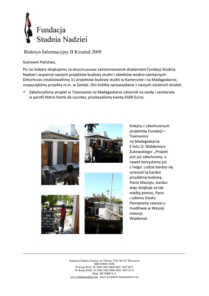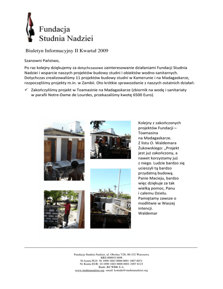 Biuletyn Informacyjny II Kwartał 2009 Szanowni Państwo, Po raz kolejny dziękujemy za dotychczasowe zainteresowanie działaniami Fundacji Studnia Nadziei i wsparcie naszych projektów budowy studni i obiektów wodno-sanitarnych. Dotychczas zrealizowaliśmy 11 projektów budowy studni w Kamerunie i na Madagaskarze, rozpoczęliśmy projekty m.in. w Zambii. Oto krótkie sprawozdanie z naszych ostatnich działań: Zakończyliśmy projekt w Toamasinie na Madagaskarze (zbiornik na wodę i sanitariaty w parafii Notre-Dame de Lourdes, przekazaliśmy kwotę 6500 Euro). Kolejny z zakończonych projektów Fundacji – Toamasina na Madagaskarze. Z listu O. Waldemara Żukowskiego: „Projekt jest już zakończony, a nawet korzystamy już z niego. Ludzie bardzo się ucieszyli tą bardzo przydatną budową. Panie Macieju, bardzo więc dziękuje za tak wielką pomoc, Panu i całemu Dziełu. Pamiętamy zawsze o modlitwie w Waszej intencji. Waldemar _____________________________________________________________________________ Fundacja Studnia Nadziei, ul. Oboźna 7/28, 00-332 Warszawa KRS 0000313698 Nr konta PLN: 56 1090 1883 0000 0001 1007 8071 Nr Konta EUR: 10 1090 1883 0000 0001 1007 8123 Bank: BZ WBK S.A. www.studnianadziei.org email: [email protected] Biuletyn Informacyjny II Kwartał 2009 Toamasina w Parafii Notre-Dame de Lourdes na Madagaskarze Projekty w trakcie realizacji: o Nowy projekt w Mumbwa w Zambii. Z listów Ks. Jakuba Rostworowskiego: „Serdecznie pozdrawiam z Mumbwa. Dziękuję za możliwość pomocy w wykopaniu studni, mamy na liście około 600 pacjentów i ponad 100 sierot. Koszt takiego projektu zamknąłby się w granicach 1000 Euro. Jestem wzruszony że narodziła się ta idea bo ta studnia pomoże w hodowli warzyw dla sierot i chorych na AIDS. Miejsce jest blisko naszego kościoła. Z wdzięczną modlitwą Ks. Jakub Rostworowski SI” o Dwa projekty studni w Kamerunie w toku, dotychczas przekazaliśmy 4000 Euro. _____________________________________________________________________________ Fundacja Studnia Nadziei, ul. Oboźna 7/28, 00-332 Warszawa KRS 0000313698 Nr konta PLN: 56 1090 1883 0000 0001 1007 8071 Nr Konta EUR: 10 1090 1883 0000 0001 1007 8123 Bank: BZ WBK S.A. www.studnianadziei.org email: [email protected] Biuletyn Informacyjny II Kwartał 2009 o Projekt w Botswanie – czasowo wstrzymany ze względu na trudności organizacyjne. Mamy nadzieję że wkrótce uda się uruchomić nasze przedsięwzięcie, jesteśmy gotowi do przekazania środków. Ojciec Marek Marciniak, Misjonarz Werbista, w planach ma do wykonania 6 studni. Kontynuujemy uruchomiony na wiosnę Program „50 Złotych”. Już sporo polskich rodzin zadeklarowało comiesięczne wpłaty - dzięki 50 złotym wpłacanym co miesiąc przez 3 lata, każdy może sam zapewnić stały dostęp do czystej wody pitnej dla co najmniej 100 osób, również przez wiele lat po wybudowaniu studni. Wszystkich chętnych ofiarodawców prosimy o wypełnienie deklaracji na naszych stronach www.studnianadziei.org zlecenie bankowi comiesięcznych wpłat kwoty 50 złotych na konto Fundacji. Prosimy o przekazanie informacji o Programie „50 Złotych” innym zainteresowanym osobom! 7 czerwca posiedzenie Rady Fundatorów przyjęło sprawozdanie za rok 2008, w którym na rzecz projektów Fundacji przekazaliśmy łącznie kwotę 22 tysięcy złotych. W pierwszym półroczu 2009 roku przekazaliśmy kwotę 49 tysięcy złotych. Z życia misji w Ambodibonara na Madagaskarze _____________________________________________________________________________ Fundacja Studnia Nadziei, ul. Oboźna 7/28, 00-332 Warszawa KRS 0000313698 Nr konta PLN: 56 1090 1883 0000 0001 1007 8071 Nr Konta EUR: 10 1090 1883 0000 0001 1007 8123 Bank: BZ WBK S.A. www.studnianadziei.org email: [email protected]