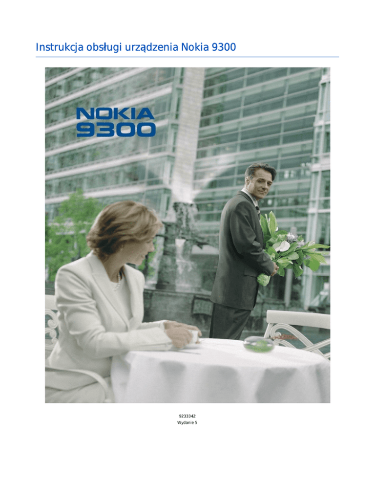 Instrukcja obsługi urządzenia Nokia 9300 9233342 Wydanie 5 DEKLARACJA ZGODNOŚCI Niniejszym, NOKIA CORPORATION, oświadcza, że RAE-6 jest zgodny z zasadniczymi wymogami oraz pozostałymi stosownymi postanowieniami Dyrektywy 1999/5/WE. Kopię “Deklaracji zgodności” znajdziesz pod adresem http://www.nokia.com/phones/declaration_of_conformity/. Copyright © 2004-2005 Nokia. Wszelkie prawa zastrzeżone. To urządzenie jest oznaczone zgodnie z Dyrektywą Europejską 2002/96/WE oraz polską Ustawą o zużytym sprzęcie elektrycznym i elektronicznym symbolem przekreślonego kontenera na odpady. Takie oznakowanie informuje, że sprzęt ten, po okresie jego użytkowania nie może być umieszczany łącznie z innymi odpadami pochodzącymi z gospodarstwa domowego. Użytkownik jest zobowiązany do oddania go prowadzącym zbieranie zużytego sprzętu elektrycznego i elektronicznego. Prowadzący zbieranie, w tym lokalne punkty zbiórki, sklepy oraz gminne jednostki, tworzą odpowiedni system umożliwiający oddanie tego sprzętu. Właściwe postępowanie ze zużytym sprzętem elektrycznym i elektronicznym przyczynia się do uniknięcia szkodliwych dla zdrowia ludzi i środowiska naturalnego konsekwencji, wynikających z obecności składników niebezpiecznych oraz niewłaściwego składowania i przetwarzania takiego sprzętu. Szczegółowe dane dotyczące masy sprzętu marki Nokia znajdują się na stronie internetowej: www.nokia.com.pl Powielanie, przekazywanie, dystrybucja oraz przechowywanie elektronicznej kopii części lub całości tego dokumentu w jakiejkolwiek formie bez uprzedniej pisemnej zgody firmy Nokia są zabronione. Nokia, Nokia Connecting People, X-press-on i Pop-Port są znakami towarowymi lub zarejestrowanymi znakami towarowymi firmy Nokia Corporation. Inne nazwy produktów i firm wymienione w niniejszym dokumencie mogą być znakami towarowymi lub nazwami handlowymi ich właścicieli. Nokia tune jest znakiem towarowym firmy Nokia Corporation. Produkt ten zawiera oprogramowanie licencjonowane przez firmę Symbian Software Ltd (c) 1998-2004. Symbian i Symbian OS są znakami towarowymi firmy Symbian Ltd. This software is based in part of the work of the FreeType Team. This product is covered by one or more of the following patents: United States Patent 5,155,805, United States Patent 5,325,479, United States Patent 5,159,668, United States Patent 2232861 and France Patent 90 05712. Java i wszystkie znaki związane z technologią Java są znakami towarowymi lub zarejestrowanymi znakami towarowymi firmy Sun Microsystems, Inc. This product is licensed under the MPEG-4 Visual Patent Portfolio License (i) for personal and noncommercial use in connection with information which has been encoded in compliance with the MPEG-4 Visual Standard by a consumer engaged in a personal and noncommercial activity and (ii) for use in connection with MPEG-4 video provided by a licensed video provider. No license is granted or shall be implied for any other use. Additional information, including that related to promotional, internal, and commercial uses, may be obtained from MPEG LA, LLC. See http:// www.mpegla.com. Ten produkt podlega licencji MPEG-4 Visual Patent Portfolio, która upoważnia do (i) korzystania z niego w prywatnych i niekomercyjnych celach w związku z informacjami zakodowanymi zgodnie ze standardem MPEG-4 przez konsumenta w toku jego działań o charakterze prywatnym i niekomercyjnym oraz do (ii) używania go w związku z nagraniami wideo w formacie MPEG-4, dostarczonymi przez licencjonowanego dostawcę takich nagrań. Na wykorzystanie produktu w innym zakresie licencja nie jest udzielana ani nie może być domniemywana. Dodatkowe informacje, w tym dotyczące zastosowań produktu w celach promocyjnych, wewnętrznych i komercyjnych, można otrzymać od firmy MPEG LA, LLC. Patrz http://www.mpegla.com. Firma Nokia promuje politykę nieustannego rozwoju. Firma Nokia zastrzega sobie prawo do wprowadzania zmian i usprawnień we wszelkich produktach opisanych w tym dokumencie bez uprzedniego powiadomienia. W żadnych okolicznościach firma Nokia nie ponosi odpowiedzialności za jakąkolwiek utratę danych lub zysków czy też za wszelkie szczególne, przypadkowe, wynikowe lub pośrednie szkody spowodowane w dowolny sposób. Zawartość tego dokumentu przedstawiona jest "tak jak jest - as is". Nie udziela się jakichkolwiek gwarancji, zarówno wyraźnych jak i dorozumianych, włączając w to, lecz nie ograniczając tego do, jakichkolwiek dorozumianych gwarancji użyteczności handlowej lub przydatności do określonego celu, chyba że takowe wymagane są przez przepisy prawa. Firma Nokia zastrzega sobie prawo do dokonywania zmian w tym dokumencie lub wycofania go w dowolnym czasie bez uprzedniego powiadomienia. Dostępność poszczególnych produktów może się różnić w zależności od regionu. Szczegóły można uzyskać u najbliższego sprzedawcy firmy Nokia. Kontrola eksportowa Produkt ten zawiera w sobie elementy i technologię, i (lub) oprogramowanie wyeksportowane z USA zgodnie z obowiązującymi w tym kraju przepisami. Nieprzestrzeganie tych przepisów podlega przewidzianym w prawie karom. UWAGA DOTYCZĄCA FCC/INDUSTRY CANADA To urządzenie może powodować zakłócenia sygnału telewizyjnego lub radiowego (na przykład w przypadku korzystania z telefonu w bliskim otoczeniu odbiornika). W przypadku braku możliwości wyeliminowania tego typu zakłóceń FCC lub Industry Canada mogą nakazać zaprzestania korzystania z tego telefonu. Jeśli konieczna będzie pomoc, należy skontaktować się z lokalnym serwisem. Urządzenie to spełnia warunki ujęte w części 15 przepisów FCC. Oznacza to, że nie zakłóca ono działania innych urządzeń radiowych. 9233342/Wydanie 5 Spis treści Dla własnego bezpieczeństwa.................................................6 URZĄDZENIE — INFORMACJE....................................................................6 USŁUGI SIECIOWE.....