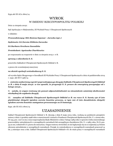 Sygn.akt III AUa 1800/14 WYROK W IMIENIU RZECZYPOSPOLITEJ POLSKIEJ Dnia 12 sierpnia 2015r. Sąd Apelacyjny w Białymstoku, III Wydział Pracy i Ubezpieczeń Społecznych w składzie: Przewodniczący: SSA Bożena Szponar - Jarocka (spr.) Sędziowie: SA Dorota Elżbieta Zarzecka SA Barbara Orechwa-Zawadzka Protokolant: Agnieszka Charkiewicz po rozpoznaniu na rozprawie w dniu 12 sierpnia 2015 r. w B. sprawy z odwołania S. S. przeciwko Zakładowi Ubezpieczeń Społecznych Oddział w B. o prawo do wcześniejszej emerytury na skutek apelacji wnioskodawcy S. S. od wyroku Sądu Okręgowego w Suwałkach III Wydziału Pracy i Ubezpieczeń Społecznych z dnia 16 października 2014 r. sygn. akt III U 358/14 I. zmienia zaskarżony wyrok i poprzedzającą go decyzję Zakładu Ubezpieczeń Społecznych Oddział w B. z dnia 8 maja 2013r. w ten sposób, że przyznaje S. S. prawo do emerytury poczynając od 1 lutego 2013r., II. ustala, że organ rentowy nie ponosi odpowiedzialności za nieustalenie ostatniej okoliczności niezbędnej do wydania decyzji, III. zasądza od Zakładu Ubezpieczeń Społecznych Oddział w B. na rzecz S. S. kwotę 150 zł (sto pięćdziesiąt złotych) tytułem zwrotu kosztów procesu, w tym 120 zł (sto dwadzieścia złotych) tytułem zwrotu kosztów zastępstwa procesowego za II instancję. Sygn. akt III AUa 1800/14 UZASADNIENIE Zakład Ubezpieczeń Społecznych Oddział w B. decyzją z dnia 8 maja 2013 roku, wydaną na podstawie przepisów ustawy z dnia 17 grudnia 1998 roku o emeryturach i rentach z Funduszu Ubezpieczeń Społecznych (Dz. U. z 2009 roku, Nr 153, poz. 1227 ze zm.) oraz rozporządzenia Rady Ministrów z dnia 7 lutego 1983 roku w sprawie wieku emerytalnego pracowników zatrudnionych w szczególnych warunkach lub szczególnym charakterze (Dz. U. z 1983 roku, Nr 8, poz. 43 ze zm.) odmówił S. S. prawa do emerytury. Organ rentowy stwierdził, że nie legitymuje się on co najmniej 15-letnim okresem zatrudnienia w szczególnych warunkach. Przyjął, że wnioskodawca w szczególnych warunkach pracował 14 lat, 3 miesiące oraz 2 dni. Zakład Ubezpieczeń Społecznych Oddział w B. do stażu pracy w szczególnych warunkach nie zaliczył wnioskodawcy okresu zatrudnienia od dnia 14 kwietnia 1998 roku do dnia 31 grudnia 1998 roku w (...) Spółce z ograniczoną odpowiedzialnością w R. S. S. w odwołaniu od powyższej decyzji domagał się przyznania prawa do emerytury po uprzednim zaliczeniu do stażu pracy wykonywanej w warunkach szczególnych zakwestionowanego przez ZUS okresu zatrudnienia oraz okresu odbywania zasadniczej służby wojskowej w Jednostce Wojskowej w H. od dnia 6 października 1975 roku do dnia 8 października 1976 roku. Sąd Okręgowy w Suwałkach po rozpoznaniu powyższego odwołania, wyrokiem z dnia 2 października 2013 roku odwołanie oddalił. Sąd I instancji wskazał, że bezsporny staż pracy wnioskodawcy uznany przez organ rentowy wynosi 14 lat, 3 miesiące oraz 2 dni. Na okres ten składają się: okres zatrudnienia od dnia 18 października 1976 roku do dnia 19 stycznia 1981 roku w Spółdzielni Kółek Rolniczych w W., Zakładzie Usług (...) w R.na stanowisku traktorzysty oraz od dnia 3 sierpnia 1981 roku do dnia 31 lipca 1991 roku w Przedsiębiorstwie (...) w W. w charakterze kierowcy samochodu ciężarowego. Przedmiotem sporu było ustalenie, czy wnioskodawca legitymuje się wymaganym do nabycia prawa do emerytury 15-letnim okresem zatrudnienia w warunkach szczególnych. Po dopuszczeniu dowodu z zeznań świadka B. A. oraz informacyjnym wysłuchaniu wnioskodawcy Sąd Okręgowy stwierdził, że sporny okres zatrudnienia od dnia 14 kwietnia 1998 roku do dnia 31 grudnia 1998 roku w (...) Spółce z ograniczoną odpowiedzialnością w R.na stanowisku ostrzacz-mechanik nie podlega uwzględnieniu do stażu pracy w szczególnych warunkach. Sąd I instancji odmówił także uznania za okres pracy w szczególnych warunkach okresu odbywania przez wnioskodawcę zasadniczej służby wojskowej od dnia 6 października 1975 roku do dnia 8 października 1976 roku (podczas której pracował on na stanowisku murarz-betoniarz), wskazując, że okres zatrudnienia w wojsku nie jest zaliczany do pracy w warunkach szczególnych. Sąd Okręgowy, opierając się na świadectwie wykonywania prac w szczególnych warunkach, uznał natomiast, że okres zatrudnienia S. S. od dnia 20 maja 1996 roku do dnia 16 lipca 1996 roku w Przedsiębiorstwie (...) w charakterze kierowcy samochodu ciężarowego o dopuszczalnym ciężarze całkowitym powyżej 3,5 tony podlega zaliczeniu do stażu pracy w warunkach szczególnych (jako praca, o której mowa w dziale VIII, poz. 2, pkt. 2 wykazu A załącznika nr 1 do zarządzenia Ministra Budownictwa i Przemysłu Materiałów Budowlanych nr 9 z dnia 1 sierpnia 1983 roku w sprawie wykazu stanowisk pracy w zakładach pracy nadzorowanych przez Ministra Budownictwa i Przemysłu Materiałów Budowlanych, na których są wykonywane prace w szczególnych warunkach uprawniające do wcześniejszego przejścia na emeryturę oraz do wzrostu emerytury lub renty - Dz. Urz. M B z 1983 roku, Nr 3, poz. 6). Uwzględnienie jednak tego okresu nie spowodowało, aby wnioskodawca legitymował się wymaganym 15-letnim stażem pracy w szczególnych warunkach. Sąd I instancji stwierdził więc, że wnioskodawca nie spełnia wszystkich wymaganych przepisami art. 184 oraz art. 32 ustawy z dnia 17 grudnia 1998 roku o emeryturach i rentach z Funduszu Ubezpieczeń Społecznych w zw. z § 3, 4 i § 2 ust. 1 rozporządzenia Rady Ministrów z dnia 7 lutego 1983 roku w sprawie wieku emerytalnego pracowników zatrudnionych w szczególnych warunkach lub szczególnym charakterze warunków do przyznania prawa do emerytury w obniżonym wieku emerytalnym z tytułu pracy w szczególnych warunkach. Mając powyższe na uwadze Sąd Okręgowy jak w sentencji wyroku orzekł na podstawie art. 477( 14) § 1 k.p.c. Wskutek rozpoznania apelacji S. S. od powyższego orzeczenia Sąd A