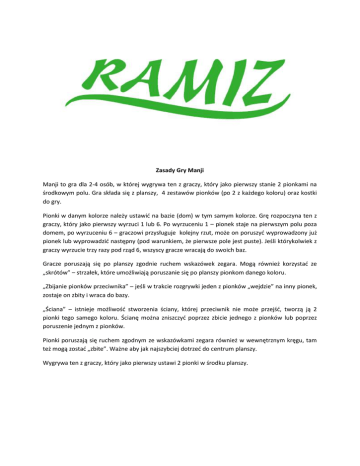 Zasady Gry Manji Manji to gra dla 2-4 osób, w której wygrywa ten z graczy, który jako pierwszy stanie 2 pionkami na środkowym polu. Gra składa się z planszy, 4 zestawów pionków (po 2 z każdego koloru) oraz kostki do gry. Pionki w danym kolorze należy ustawid na bazie (dom) w tym samym kolorze. Grę rozpoczyna ten z graczy, który jako pierwszy wyrzuci 1 lub 6. Po wyrzuceniu 1 – pionek staje na pierwszym polu poza domem, po wyrzuceniu 6 – graczowi przysługuje kolejny rzut, może on poruszyd wyprowadzony już pionek lub wyprowadzid następny (pod warunkiem, że pierwsze pole jest puste). Jeśli którykolwiek z graczy wyrzucie trzy razy pod rząd 6, wszyscy gracze wracają do swoich baz. Gracze poruszają się po planszy zgodnie ruchem wskazówek zegara. Mogą również korzystad ze „skrótów” – strzałek, które umożliwiają poruszanie się po planszy pionkom danego koloru. „Zbijanie pionków przeciwnika” – jeśli w trakcie rozgrywki jeden z pionków „wejdzie” na inny pionek, zostaje on zbity i wraca do bazy. „Ściana” – istnieje możliwośd stworzenia ściany, której przeciwnik nie może przejśd, tworzą ją 2 pionki tego samego koloru. Ścianę można zniszczyd poprzez zbicie jednego z pionków lub poprzez poruszenie jednym z pionków. Pionki poruszają się ruchem zgodnym ze wskazówkami zegara również w wewnętrznym kręgu, tam też mogą zostad „zbite”. Ważne aby jak najszybciej dotrzed do centrum planszy. Wygrywa ten z graczy, który jako pierwszy ustawi 2 pionki w środku planszy.