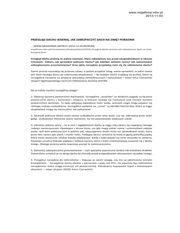 www.mojafirma.infor.pl 2013-11-03 PRZEGLĄD DACHU JESIENIĄ. JAK ZABEZPIECZYĆ DACH NA ZIMĘ? PORADNIK . .,WWW.MOJAFIRMA.INFOR.PL (2013-11-03 00:00:00) mojafirma.infor.pl/nieruchomosci/budowa/dach/323521,Przeglad-dachu-jesienia-Jak-zabezpieczyc-dach-na-zimePoradnik.html Przegląd dachu jesienią to ważna czynność, która zabezpieczy nas przed niespodziankami w okresie zimowym. Zobacz, jak sprawdzić pokrycie dachu? jak odetkać zatkane rynny? Jak zamontować zabezpieczenia przeciwśnieżne? Oraz jakie narzędzia przydadzą nam się do odśnieżania dachu? Zanim jeszcze rozszaleją się jesienne ulewy, a potem przyjdzie śnieg, warto sprawdzić, w jakim stanie jest dach naszego domu po całorocznej eksploatacji. – Na każdym dachu znajdują się punkty, które są szczególnie narażone na działanie warunków atmosferycznych i naturalnych – mówi Artur Czerwiński ekspert Ogólnopolskiego Centrum Odśnieżania Dachów (OCOD). Na co należy zwrócić szczególną uwagę? 1. Obejrzyj łączenia powierzchni dachowych. Szczególnie „wrażliwe” na działanie pogody są łączenia powierzchni dachu z kominami i miejsca, w których stykają się nachylone pod różnym kontem powierzchnie dachowe. To tędy spływają największe ilości wody, wskutek czego mogą pojawić się różnego rodzaju uszkodzenia. Szczególnie podatne na „urazy” są obróbki blacharskie, które w ciągu eksploatacji mogą się rozszczelnić lub poluzować. 2. Sprawdź pokrycie dachu może zostać uszkodzone przez silny wiatr, czy np. oderwaną przez wiatr gałąź. Uszkodzone elementy warto wymienić, by nie powodowały większych szkód. 3. Udrożnij zatkane rynny – to w nich i zagłębieniach dachu w ciągu roku zbiera się najwięcej różnego rodzaju zanieczyszczeń. Opadające z drzew liście, czy igły mogą zatkać rynnę i uniemożliwić odpływ wody. Jeśli dom położony jest w pobliżu pól, nieprzyjemne skutki może też spowodować wiatr, który przez lato nanosi pył, piach i resztki roślin. Padający deszcz zamienia tę masę w gęstą jednolitą papkę, która może skutecznie zatykać kanały odpływowe. Kiedy z kolei pojawi się mróz wszystko to zamarza. Powstaje szczelna blokada odpływu i lodowe bariery, które z kolei uniemożliwiają zsuwanie się z dachu śniegu. Dlatego jesienią warto zawczasu usunąć te zanieczyszczenia. 4. Zamontuj zabezpieczenia przeciwśnieżne – czyli specjalne poprzeczne żerdzie lub metalowe drabinki. Powinniśmy umieścić je na skraju dachu by chroniły przed przypadkowym obsuwaniem się połaci śniegu. 5. Przygotuj narzędzia do odśnieżania – kupując je zwróć uwagę, czy nie są zakończone ostrymi krawędziami. - Szczególnie dachy płaskie z poszyciem z papy lub PCV, nie powinny być odśnieżane narzędziami, które mogą zniszczyć ich powierzchnię. Odradzamy kupowanie łopat z metalowymi okuciami – mówi ekspert OCOD Artur Czerwiński. www.mojafirma.infor.pl 2013-11-03 6. Wyznacz punkt asekuracyjny. Nawet jeśli dach twojego domu ma niewielką powierzchnię, co oznacza, że może wytrzymać większe obciążenia, warto wyznaczyć na nim punkt, w którym można umocować stanowisko asekuracyjne. Jeśli zimą zajdzie konieczność odśnieżania, punkt taki pozwoli zabezpieczyć się osobie, która będzie tę pracę wykonywać. – Dachy skośne, bez względu na ilość spadów, powinny ośnieżać wyspecjalizowane brygady lub osoby, które potrafią wykonywać prace w dostępie linowym. Chyba, że istnieje możliwość usunięcia śniegu z dołu, bez wchodzenia na dach – radzi ekspert OCOD. Odpowiednie zabezpieczenie pracowników przed upadkiem z wysokości powinno być, lecz niestety wciąż jeszcze nie jest w Polsce standardem. Choć kwestie te regulują odpowiednie przepisy, praktycznie w każdym sezonie zdarzają się wypadki przy odśnieżaniu dachu. Zobacz także: Remont pokrycia dachowego z papy – krok po kroku Zobacz także: Obróbka komina wykonana z blachy – krok po kroku Zobacz także: Jak czyścić i konserwować rynny? Źródło: Ogólnopolskie Centrum Odśnieżania Dachów (OCOD)