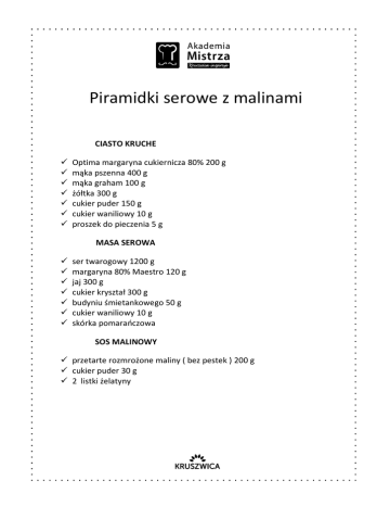 Piramidki serowe z malinami CIASTO KRUCHE Optima margaryna cukiernicza 80% 200 g mąka pszenna 400 g mąka graham 100 g żółtka 300 g cukier puder 150 g cukier waniliowy 10 g proszek do pieczenia 5 g MASA SEROWA ser twarogowy 1200 g margaryna 80% Maestro 120 g jaj 300 g cukier kryształ 300 g budyniu śmietankowego 50 g cukier waniliowy 10 g skórka pomarańczowa SOS MALINOWY przetarte rozmrożone maliny ( bez pestek ) 200 g cukier puder 30 g 2 listki żelatyny Przygotowanie Ciasto kruche Margarynę wymieszaj z utartym cukrem pudrem, cukrem waniliowym oraz z żółtkami, a na końcu dodaj połączoną z proszkiem do pieczenia mąkę. Odstaw do chłodni na około 2 godziny. Po tym czasie rozwałkuj ciasto i przełóż je do formy wyłożonej pergaminem. Odpiecz ciasto do osiągnięcia jasnego koloru, a następnie odłóż do schłodzenia. Masa serowa Dwukrotnie zmielony ser wymieszaj z margaryną utartą z żółtkami, połową przygotowanego cukru i cukrem waniliowym do osiągnięcia jednolitej masy. Na końcu dodaj ubite na sztywno białko z drugą połową cukru i budyniem. Masę serową wlej na podpieczony blat z ciasta kruchego i odpiecz w temperaturze 190 stopni przez około godzinę i ponownie odstaw do schłodzenia. Sos malinowy Aby otrzymać sos malinowy, wystarczy, że wymieszasz maliny z cukrem, a następnie z rozpuszczoną wcześniej żelatyną. Przed podaniem pokrój sernik na trójkąty, polej ciepłym sosem malinowym i udekoruj czekoladą oraz malinami.