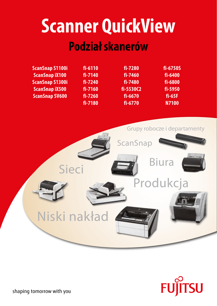 Scanner QuickView Podział skanerów ScanSnap S1100i ScanSnap iX100 ScanSnap S1300i ScanSnap iX500 ScanSnap SV600 fi-6110 fi-7140 fi-7240 fi-7160 fi-7260 fi-7180 fi-7280 fi-7460 fi-7480 fi-5530C2 fi-6670 fi-6770 fi-6750S fi-6400 fi-6800 fi-5950 fi-65F N7100 Grupy robocze i departamenty ScanSnap Sieci Niski nakład Biura Produkcja Seria ScanSnap Wprowadzenie ScanSnap S1100i – błyskawiczny skaner dokumentów do pliku PDF zasilany kablem USB Firma PFU (EMEA) Limited (PFUE) oferuje najszerszą na rynku gamę skanerów do dokumentów. Skanery Fujitsu to produkty najwyższej jakości, cieszące się opinią wyjątkowo niezawodnych urządzeń. Oferta skanerów firmy Fujitsu obejmuje najbardziej optymalne rozwiązania do zastosowań takich jak: zarządzanie dokumentami, archiwizacja, obieg dokumentów, przetwarzanie formularzy, itd. • Skanowanie kolorowej strony A4 w 7,5 sekundy • Łatwe połączenie z urządzeniami z systemem iOS lub Android • Skanowanie dokumentów do konta w chmurze • Równoczesne skanowanie dwóch małych dokumentów za pomocą wyboru ścieżki prowadzenia papieru • Szybkie skanowanie i porządkowanie danych z wizytówek • Oprogramowanie ScanSnap Receipt – skuteczna archiwizacja zeznań podatkowych i danych związanych z wydatkami ScanSnap iX100 – bezprzewodowy skaner z akumulatorem umożliwiający nieograniczoną mobilność • Skanowanie kolorowej strony A4 w 5 sekund • Procesor GI umożliwiający szybkie skanowanie i przesyłanie • Wbudowany moduł Wi-Fi automatycznie wykrywający punkty dostępu i łatwo przełączający się z jednego punktu na drugi • Skanowanie do innych urządzeń za pomocą aplikacji ScanSnap Connect • Elastyczne ścieżki prowadzenia papieru, skanowanie dwóch dokumentów, łączenie do formatu A3 • Oprogramowanie ScanSnap Receipt – skuteczna archiwizacja zeznań podatkowych i danych związanych z wydatkami ZALETY SKANERÓW FUJITSU: • Możliwość skanowania arkuszy o rozmiarach od wizytówki do A3 (skanowanie arkuszy o długości nawet 5.5 m) • Szybkość skanowania do 270 obrazów na minutę • Automatyczne podajniki dokumentów w standardzie • Skanowanie jednostronne / dwustronne • Skanowanie kolorowe, czarno-białe i w skali szarości • Funkcja poprawy jakości niewyraźnych dokumentów/ dokumentów o mieszanych kolorach • Szeroki wachlarz różnorodnych rozwiązań technologicznych • Modele SCSI i USB • Liczne programy dostarczane w zestawie ze skanerami O FIRMIE PFU Firma PFU Limited, część korporacji Fujitsu Limited (Japonia), zajmuje się projektowaniem, produkcją i dystrybucją skanerów marki Fujitsu na całym świecie. PFU jest globalnym dostawcą rozwiązań IT, zajmującym się również projektowaniem, produkcją i sprzedażą sprzętu komputerowego, urządzeń peryferyjnych oraz oprogramowania dla firm. PFU dysponuje bogatą ofertą profesjonalnych skanerów do użytku osobistego, biurowego, produkcji wysokonakładowej, pracy w grupach roboczych oraz środowiskach sieciowych i jest jednym z wiodących globalnych producentów skanerów. Firma PFU jest obecna w branży od ponad 25 lat i notuje coroczne obroty w wysokości 1 miliarda dolarów. PFU (EMEA) Limited zajmuje się marketingiem i sprzedażą skanerów marki Fujitsu w Europie, na Bliskim Wschodzie i w Afryce. Europejska firma, założona w Wielkiej Brytanii w 1981 roku, ma filie w Niemczech, Włoszech i Hiszpanii, a także oddziały Knowledge Suite we Francji i w Rosji. www.ScanSnapit.com ScanSnap S1300i – pozwala użytkownikom systemów Windows i Mac zwiększyć wydajność i zrezygnować z dokumentacji papierowej • Szybki skaner dwustronny, 12 ppm / 24 ipm • Automatyczny podajnik na 10 arkuszy, skanowanie arkuszy od A8 do A4 • Możliwość zasilania przez interfejs USB • Skanowanie do edytowalnych dokumentów Word, Excel i PowerPoint ScanSnap iX500 – nowy wieloplatformowy skaner w sieci WiFi • Kompaktowy skaner stacjonarny 25 ppm / 50 ipm • Automatyczny podajnik dokumentów (ADF) mieszczący 50 kartek, skanowanie od wizytówek do formatu A3 • Skanowanie bezprzewodowe do urządzeń inteligentnych, PC i Mac • Skanowanie jedno- lub dwustronne oraz funkcje intuicyjne ScanSnap SV600 – intuicyjny, wszechstronny i unikalny skaner do błyskawicznej digitalizacji • Łatwa i szybka obsługa „one touch” dla PC i Mac • Wszechstronny skaner typu overhead dla wszystkich rodzajów dokumentów • Trzysekundowe skanowanie strony panoramicznej A3 • Niewielkie rozmiary i wytrzymała konstrukcja • Skanowanie ciągłe z opcją wykrywania zmiany strony i trybem czasowym Skanuj do… WiFi Pobierz aplikację ScanSnap dla skanowania do iPad®, iPhone®, Android™ oraz Kindle™ ScanSnap ScanSnap urządzenie inteligentne / komputer Smart Device / Computer Skanuj do następujących aplikacji * Folder Email Drukuj Folder Obrazy Evernote Google Docs SugarSync Word PowerPoint Excel SharePoint ScanSnap Organizer iPhone®/ iPad®, Android™ i Kindle™ CardMinder Salesforce Chatter DropBox Skanuj do Searchable PDF Convertor iPhoto ScanSnap Receipt™ Aby dowiedzieć się więcej, prosimy odwiedzić stronę: http://www.fujitsu.com/pl/scanners n iektóre aplikacje odnoszą się do wybranych modeli ScanSnap. Apple iPad, iPhone, iPod touch i iTunes są znakami towarowymi firmy Apple Inc. zarejestrowanej w USA i innych krajach. App Store jest znakiem serwisowym Apple Inc. * Seria „fi” http://emea.fujitsu.com/scanners Grupy robocze i departamenty Low Volume fi-6110 – nowe możliwości zarządzania informacjami dla małych i średnich firm fi-6670 – spełni wszystkie potrzeby w zakresie skanowania •9 0 ppm / 180 ipm przy 200 dpi we wszystkich trybach kolorów (A4, panorama) •Z aprojektowany z myślą o niewielkiej przestrzeni z przyjazną dla użytkownika funkcjonalnością •A utomatyczny podajnik dokumentów (ADF) mieszczący 200 kartek / skanowanie A8 – A3 • Wyposażony w PaperStream IP/Capture • Skanowa