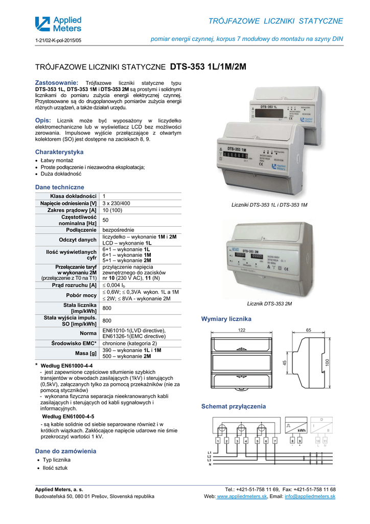 TRÓJFAZOWE LICZNIKI STATYCZNE pomiar energii czynnej, korpus 7 modułowy do montażu na szyny DIN 1-21/02-K-pol-2015/05 TRÓJFAZOWE LICZNIKI STATYCZNE DTS-353 1L/1M/2M Zastosowanie: Trójfazowe liczniki statyczne typu DTS-353 1L, DTS-353 1M i DTS-353 2M są prostymi i solidnymi licznikami do pomiaru zużycia energii elektrycznej czynnej. Przystosowane są do drugoplanowych pomiarów zużycia energii różnych urządzeń, a także działań urzędu. Opis: Licznik może być wyposażony w liczydełko elektromechaniczne lub w wyświetlacz LCD bez możliwości zerowania. Impulsowe wyjście przełączające z otwartym kolektorem (SO) jest dostępne na zaciskach 8, 9. Charakterystyka • Łatwy montaż • Proste podłączenie i niezawodna eksploatacja; • Duża dokładność Dane techniczne Klasa dokładności Napięcie odniesienia [V] Zakres prądowy [A] Częstotliwość nominalna [Hz] Podłączenie Odczyt danych Ilość wyświetlanych cyfr Przełączanie taryf w wykonaniu 2M (przełączenie z T0 na T1) Prąd rozruchu [A] Pobór mocy Stała licznika [imp/kWh] Stała wyjścia impuls. SO [imp/kWh] Norma Środowisko EMC* Masa [g] 1 3 x 230/400 10 (100) Liczniki DTS-353 1L i DTS-353 1M 50 bezpośrednie liczydełko – wykonanie 1M i 2M LCD – wykonanie 1L 6+1 – wykonanie 1L 6+1 – wykonanie 1M 5+1 – wykonanie 2M przyłączenie napięcia zewnętrznego do zacisków nr 10 (230 V AC), 11 (N) ≤ 0,004 Ib ≤ 0,6W; ≤ 0,3VA wykon. 1L a 1M ≤ 2W; ≤ 8VA - wykonanie 2M 800 800 Licznik DTS-353 2M Wymiary licznika EN61010-1(LVD directive), EN61326-1(EMC directive) chronione (kategoria 2) 390 – wykonanie 1L i 1M 500 – wykonanie 2M * Według EN61000-4-4 - jest zapewnione częściowe stłumienie szybkich transjentów w obwodach zasilających (1kV) i sterujących (0,5kV), załączanych tylko za pomocą przekaźników (nie za pomocą styczników) - wykonana fizyczna separacja nieekranowanych kabli zasilających i sterujących od kabli sygnałowych i informacyjnych. Schemat przyłączenia Według EN61000-4-5 - są kable solidnie od siebie separowane również i w krótkich wiązkach. Zakłócające napięcie udarowe nie śmie przekroczyć wartości 1 kV. Dane do zamówienia • Typ licznika • Ilość sztuk Applied Meters, a. s. Budovateľská 50, 080 01 Prešov, Slovenská republika Tel.: +421-51-758 11 69, Fax: +421-51-758 11 68 Web: www.appliedmeters.sk, Email: [email protected]