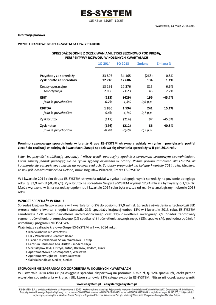 Warszawa, 14 maja 2014 roku Informacja prasowa WYNIKI FINANSOWE GRUPY ES-SYSTEM ZA I KW. 2014 ROKU SPRZEDAŻ ZGODNIE Z OCZEKIWANIAMI, ZYSKI SEZONOWO POD PRESJĄ, PERSPEKTYWY ROZWOJU W KOLEJNYCH KWARTAŁACH 1Q 2014 1Q 2013 Zmiana Zmiana % Przychody ze sprzedaży Zysk brutto ze sprzedaży 33 897 12 740 34 165 12 606 (268) 134 -0,8% 1,1% Koszty operacyjne Amortyzacja 13 191 2 068 12 376 2 023 815 45 6,6% 2,2% EBIT jako % przychodów (233) -0,7% (429) -1,3% 196 0,6 p.p. -45,7% EBITDA jako % przychodów 1 836 5,4% 1 594 4,7% 241 0,7 p.p. 15,1% Zysk brutto (117) (214) 97 -45,5% Zysk netto jako % przychodów (126) -0,4% (212) -0,6% 86 0,2 p.p. -40,5% Pomimo sezonowego spowolnienia w branży Grupa ES-SYSTEM utrzymała udziały w rynku i powiększyła portfel zleceń do realizacji w kolejnych kwartałach. Zarząd spodziewa się ożywienia sprzedaży w II pół. 2014 roku. I kw. br. przyniósł stabilizację sprzedaży i niższy wynik operacyjny zgodnie z corocznym sezonowym spowolnieniem. Coraz śmielej jednak przebijają się na rynku sygnały ożywienia w branży. Rośnie poziom zamówień dla ES-SYSTEM i otwierają się perspektywy rozwoju na nowych rynkach. To dobry prognostyk na kolejne kwartały 2014 roku. Możliwe, że w II pół. branża zaświeci na zielono, mówi Bogusław Pilszczek, Prezes ES-SYSTEM. W I kwartale 2014 roku Grupa ES-SYSTEM utrzymała udział w rynku i osiągnęła wynik sprzedaży na poziomie ubiegłego roku, tj. 33,9 mln zł (-0,8% r/r). Zysk brutto na sprzedaży Grupy ES-SYSTEM wyniósł 12,74 mln zł i był wyższy o 1,1% r/r. Marża wyrażona w % na sprzedaży ogółem po I kwartale 2014 roku była wyższa od marży w analogicznym okresie 2013 roku. WZROST SPRZEDAŻY W KRAJU Sprzedaż krajowa Grupy wzrosła w I kwartale br. o 2% do poziomu 27,9 mln zł. Sprzedaż oświetlenia w technologii LED wzrosła kolejny kwartał z rzędu i stanowiła 21% sprzedaży krajowej wobec 13% w I kwartale 2013 roku. ES-SYSTEM zanotowała 12% wzrost oświetlenia architektonicznego oraz 21% oświetlenia awaryjnego r/r. Spadek zanotowały segment oświetlenia przemysłowego (2% spadku r/r) i oświetlenia zewnętrznego (18% spadku r/r), pochodna opóźnień w realizacji programu NFOŚ SOWA. Ważniejsze realizacje krajowe Grupy ES-SYSTEM w I kw. 2014 roku: • Izba Skarbowa we Wrocławiu • EIT / Wrocławskie Centrum Badań • Osiedle mieszkaniowe Saska, Warszawa - II etap • Centrum Handlowe Alfa Olsztyn - modernizacja • Sieć sklepów JYSK, Olsztyn, Kutno, Rzeszów, Radom, Turek • Apartamentowiec Cosmopolitan, Warszawa • Apartamenty Dębowe Tarasy, Katowice • Galeria handlowa Siedlce, Siedlce SPOWOLNIENIE ZAGRANICĄ DO ODROBIENIA W KOLEJNYCH KWARTAŁACH W I kwartale 2014 roku Grupa osiągnęła sprzedaż eksportową na poziomie 6 mln zł, tj. 12% spadku r/r, efekt przede wszystkim spowolnienia w krajach UE, które stanowią 32% całego eksportu ES-SYSTEM. Niższe niż oczekiwano wyniki www.essystem.pl [email protected] ES-SYSTEM S.A. z siedzibą w Krakowie, ul. Przemysłowa 2, 30-701 Kraków wpisaną przez Sąd Rejonowy dla Krakowa – Śródmieścia w Krakowie Wydział XI Gospodarczy KRS do Rejestru Przedsiębiorców Krajowego Rejestru Sądowego pod numerem 0000113760, o numerze NIP 679-25-51-640 i numerze REGON 351610904, o kapitale akcyjnym 14.145.000, 21 zł (w całości wpłaconym), o zarządzie w składzie: Prezes Zarządu – Bogusław Pilszczek, Wiceprezes Zarządu – Mikołaj Wierzbickii, Wiceprezes Zarządu – Mirosław Butryn -1- spółka osiągnęła, między innymi we Włoszech, Niemczech oraz Szwecji. Równolegle trudna sytuacja polityczna na wschodzie Europy spowolniła niektóre projekty. Najbardziej dynamicznie rosnącym rynkiem eksportowym Grupy w I kwartale br. była Austria, gdzie realizowane są największe projekty, głównie przemysłowe. Sprzedaż w Austrii wzrosła ponad 3-krotnie i wyniosła 9,2% udziału w strukturze sprzedaży Grupy. W omawianym okresie spadek wartości hrywny ograniczył transakcje handlowe na Ukrainie, a inwestycje w dużej części zostały wstrzymane. Udział w targach Kiev Build pozwolił spółce na pozyskanie kontaktów wśród projektantów i firm budowlanych, z którymi aktualnie ES-SYSTEM prowadzi prace nad projektami. W krajach bałtyckich obserwowane jest obecnie ożywienie: na Łotwie realizowane są dostawy oświetlenia do jednego z najbardziej prestiżowych obiektów sportowych w kraju – toru bobslejowego Sigulda. Na koniec kwartału Łotwa stanowiła 2,3% w sprzedaży Grupy. W Rosji duże projekty są realizowane bez opóźnień. W I kwartale zrealizowany został kolejny etap oświetlenia kompleksu logistycznego South Gate. Dostarczane są także systemy oświetlenia awaryjnego i linie świetlne do nowo otwieranych sklepów kilku sieci. Na koniec kwartału Rosja stanowiła 9,5% udział w sprzedaży Grupy. W II-III kwartale realizowane będą projekty centrum handlowego w Kaliningradzie i Kazaniu, salony samochodowe FORD oraz Moscow Telecom City. Od końca I kwartału 2014 roku wzrasta ilość oraz wartość ofert przygotowywanych dla klientów w Austrii, Niemczech, Izraelu oraz w krajach arabskich. Od II kwartału planowana jest intensyfikacja kontaktów z nowymi firmami, z którymi nawiązany został kontakt na targach Light+Building we Frankfurcie. 80% projektów i zapytań otrzymywanych z Austrii, Niemiec i Szwajcarii dotyczy oprawy na bazie LED. W perspektywie kolejnych kwartałów br. Grupa spodziewa się także ożywienia na rynkach Słowacji i w Czechach. W III kw. br. zaplanowane zostały 3 duże projekty modernizacji oświetlenia ulicznego i parkowego w Czechach i na Słowacji. Wybrane realizacje eksportowe Grupy ES-SYSTEM w I kw. 2014 roku: Fabryka słodyczy Manner, Austria Lotnisko w Hannower, Niemcy Simmeringwerkstätte, Austria Ratusz Stadhuis, Assen, Holandia Biurowiec Central Telemetry, Kuwejt Biurowiec Agroimport, Kijów, Ukraina Obiekty biurowo-magazynowe Goldbeck, Košice, Słowacja ZYSKI SEZONO