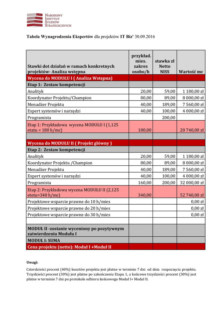 Tabela Wynagrodzenia Ekspertów dla projektów IT Biz' 30.09.2016 Stawki dot działań w ramach konkretnych projektów- Analiza wstępna Wycena do MODUŁU I ( Analiza Wstępna) Etap 1: Zestaw kompetencji Analityk Koordynator Projektu/Champion Menadżer Projektu Expert systemów i narzędzi Programista przykład. mies. stawka zł zakres Netto osobo/h NISS Wartość mc 20,00 80,00 40,00 40,00 Etap 1: Przykładowa wycena MODUŁU I (1,125 etatu = 180 h/mc) 180,00 Wycena do MODUŁU II ( Projekt główny ) Etap 2: Zestaw kompetencji Analityk Koordynator Projektu /Champion Menadżer Projektu Expert systemów i narzędzi Programista 20,00 80,00 40,00 40,00 160,00 Etap 2: Przykładowa wycena MODUŁU II (2,125 etetu=340 h/mc) Projektowe wsparcie prawne do 10 h/mies Projektowe wsparcie prawne do 20 h/mies Projektowe wsparcie prawne do 30 h/mies 340,00 59,00 89,00 189,00 100,00 200,00 1 180,00 zł 8 000,00 zł 7 560,00 zł 4 000,00 zł 20 740,00 zł 59,00 89,00 189,00 100,00 200,00 1 180,00 zł 8 000,00 zł 7 560,00 zł 4 000,00 zł 32 000,00 zł 52 740,00 zł 0,00 zł 0,00 zł 0,00 zł MODUŁ II -zostanie wyceniony po pozytywnym zatwierdzeniu Modułu I MODUŁ I: SUMA Cena projektu (netto): Moduł I +Moduł II Uwagi: Czterdzieści procent (40%) kosztów projektu jest płatne w terminie 7 dni od dnia rozpoczęciu projektu. Trzydzieści procent (30%) jest płatne po zakończeniu Etapu 1, a końcowe trzydzieści procent (30%) jest płatne w terminie 7 dni po protokole odbioru końcowego Moduł I+ Moduł II.