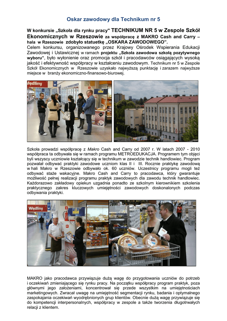 Oskar zawodowy dla Technikum nr 5 W konkursie „Szkoła dla rynku pracy" TECHNIKUM NR 5 w Zespole Szkół Ekonomicznych w Rzeszowie za współpracę z MAKRO Cash and Carry – hala w Rzeszowie zdobyło statuetkę „OSKARA ZAWODOWEGO”. Celem konkursu, organizowanego przez Krajowy Ośrodek Wspierania Edukacji Zawodowej i Ustawicznej w ramach projektu „Szkoła zawodowa szkołą pozytywnego wyboru”, było wyłonienie oraz promocja szkół i pracodawców osiągających wysoką jakość i efektywność współpracy w kształceniu zawodowym. Technikum nr 5 w Zespole Szkół Ekonomicznych w Rzeszowie uzyskało najwyższą punktację i zarazem najwyższe miejsce w branży ekonomiczno-finansowo-biurowej. Szkoła prowadzi współpracę z Makro Cash and Carry od 2007 r. W latach 2007 - 2010 współpraca ta odbywała się w ramach programu METROEDUKACJA. Programem tym objęci byli wszyscy uczniowie kształcący się w technikum w zawodzie technik handlowiec. Program pozwalał odbywać praktyki zawodowe uczniom klas II i III. Rocznie praktykę zawodową w hali Makro w Rzeszowie odbywało ok. 60 uczniów. Uczestnicy programu mogli też odbywać staże wakacyjne. Makro Cash and Carry to pracodawca, który gwarantuje możliwość pełnej realizacji programu praktyk zawodowych dla zawodu technik handlowiec. Każdorazowo zakładowy opiekun uzgadnia ponadto ze szkolnym kierownikiem szkolenia praktycznego zakres kluczowych umiejętności zawodowych doskonalonych podczas odbywania praktyki. MAKRO jako pracodawca przywiązuje dużą wagę do przygotowania uczniów do potrzeb i oczekiwań zmieniającego się rynku pracy. Na początku współpracy program praktyk, poza głównymi jego założeniami, koncentrował się przede wszystkim na umiejętnościach marketingowych. Zwracał uwagę na umiejętność segmentacji rynku, badania i optymalnego zaspokajania oczekiwań wyodrębnionych grup klientów. Obecnie dużą wagę przywiązuje się do kompetencji interpersonalnych, współpracy w zespole a także tworzenia długotrwałych relacji z klientem. MAKRO stworzyło szkole możliwość zakupu pomocy dydaktycznych po atrakcyjnych cenach, stosując specjalną politykę rabatową. Dotyczy to zakupów telewizorów, sprzętu komputerowego i drobnego sprzętu RTV. Ponadto podczas realizacji międzynarodowego projektu „Praktyczne umiejętności w handlu" szkoła otrzymała z MAKRO artykuły spożywcze o przedłużonym okresie trwałości, z możliwością wykorzystania ich podczas zajęć dydaktycznych. Firma udostępniła też rekwizyty, sprzęt demonstracyjny i reklamowy z możliwością wykorzystania go także podczas zajęć szkolnych. W czasie realizacji tego projektu bezpłatnie drukowano w Makro opracowane przez uczniów materiały reklamowe: plakaty, ulotki a także ankiety do prowadzonych badań marketingowych. Wszyscy nauczyciele uczący przedmiotów zawodowych otrzymali płytę z programami edukacyjnymi: „Kompetencje w sprzedaży", „Kompetencje handlowe". Płyty te zostały przekazane również uczniom i do pracowni marketingu. Do dyspozycji szkoły przekazano też „Podręczniki pracownika" - zawierające praktyczne wskazówki dla handlowca (ubiór do pracy, zasady obsługi klienta, zapobieganie kradzieżom). Realizacja projektu „Praktyczne umiejętności w handlu” we współpracy z MAKRO umożliwiła uczniom odbycie staży. W czasie praktyk uczniowie: - przygotowywali i przeprowadzali badania marketingowe wśród klientów MAKRO, - planowali tydzień reklamowy dla wybranego produktu, - przygotowywali materiały reklamowe i przeprowadzali akcje reklamowe dla wybranego produktu, - podsumowywali akcję reklamową: ustalali skuteczność i efektywność reklamy, - przeprowadzali badania marketingowe w celu zbadania stopnia zadowolenia klientów z obsługi w firmie (badania ankietowe), - przeprowadzali wywiady z pracownikami Punktu Obsługi Klienta na temat zachowań klientów i typów klientów, - w praktyce poznawali różne techniki sprzedaży. Ponadto uczniowie i nauczyciele uczestniczyli w wycieczce zawodowej do Warszawy, wzieli udział w spotkaniu w związku z Jubileuszem Firmy (4 osoby). Co roku uczniowie mają okazję uczestniczyć w wycieczce do MAKRO, aby obserwować zachowania i obsługę różnych typów klientów). W związku z realizacją przez szkołę projektów Leonardo da Vinci, MAKRO zadeklarowało pomoc w znalezieniu miejsca praktyk dla uczniów technikum w zawodzie technik handlowiec, wyjeżdżających na praktyki zagraniczne do Monachium i do Koszyc. Szkolenia i kursy umożliwiające uzyskanie dodatkowych uprawnień zawodowych W ramach projektu METRO EDUKACJA (w roku szkolnym 2010/2011) grupa 6 uczniów kl. III Technikum nr 5 w zawodzie technik handlowiec uczestniczyła w międzynarodowym projekcie „Praktyczne umiejętności w handlu". Projekt ten realizowany był we współpracy z Polsko-Niemiecką Izbą Przemysłowo-Handlową. Zakładał odbycie staży dla uczniów i nauczycieli w celu przygotowanie do egzaminu potwierdzającego nabycie przez uczniów praktycznych umiejętności i kluczowych kompetencji w handlu. Jego efektem było uzyskanie przez wszystkich uczniów biorących udział w projekcie, specjalnych certyfikatów potwierdzających praktyczne umiejętności, respektowanych we wszystkich krajach Unii Europejskiej. WSPÓŁPRACA SZKOŁY Z PRACODAWCĄ PRZYBIERA RÓŻNE FORMY Zajęcia dla uczniów prowadzone przez przedstawicieli pracodawcy W latach 2010 - 2012 uczniowie uczestniczyli w wielu zajęciach prowadzonych przez pracodawcę. Były to: - konsultacje w szkole: „Jak przygotować prezentację", „Typy klientów", „Działania reklamowe dla wybranego produktu" - konsultacje u pracodawcy: „Badania ankietowe wśród klientów" - warsztaty z udziałem specjalistów pracodawcy: „Przygotowanie kampanii reklamowej dla wybranego produktu", - warsztaty z udziałem specjalistów pracodawcy: „Obsługa różnych typów klientów" W tym samym okresie wszyscy uc