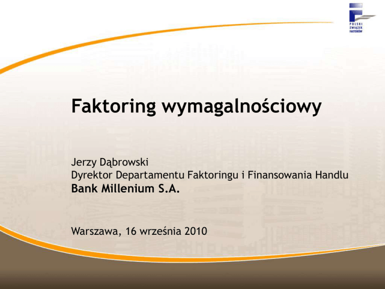 Faktoring wymagalnościowy Jerzy Dąbrowski Dyrektor Departamentu Faktoringu i Finansowania Handlu Bank Millenium S.A. Warszawa, 16 września 2010 Czym jest faktoring wymagalnościowy? - odmiana faktoringu niepełnego (z regresem) - rozwiązanie, które umożliwia Dostawcy (Klientowi) uzyskanie środków za nabyte przez Faktora wierzytelności najpóźniej w terminach ich płatności oraz dodatkowo zapewnia Odbiorcy finansowanie w uzgodnionym z Faktorem okresie po terminie płatności tj. pozwala wydłużyć terminy płatności Odbiorcom, ale na ich koszt Schemat transakcji KLIENT 2 zestawienie wierzytelności 1 3 sprzedaż towaru lub usługi (faktura) wypłata środków w terminie płatności lub przed terminem płatności FAKTOR ODBIORCA 4 spłata wierzytelności oraz odsetek od udzielonego finansowania w terminach określonych w Porozumieniu Schemat cyklu konkretnej wierzytelności przekazanej Faktorowi złożenie do Faktora Zestawienia wierzytelności wypłata Klientowi środków za nabyte wierzytelność 1) maksymalny termin spłaty wierzytelności przez Odbiorcę 2) brak płatności od Odbiorcy – regres do Klienta maksymalny łączny okres finansowania Odbiorcy po terminie płatności faktury wraz z terminem wymagalności faktury termin wymagalności faktury odsetki naliczane Klientowi wystawienie faktury termin płatności faktury okres finansowania Odbiorcy po terminie płatności faktury odsetki naliczane Odbiorcy koniec okresu finansowania Odbiorcy Korzyści KLIENT ODBIORCA - pewność otrzymania od Faktora środków za sprzedane towary i usługi najpóźniej w terminie płatności wierzytelności - skrócenie okresu finansowania Odbiorcy przez Klienta - zmniejszenie kosztów udzielonego Odbiorcy kredytu kupieckiego - przeniesienie na Faktora zadań związanych z administrowaniem wierzytelnościami i monitorowaniem ich spłaty przez Odbiorców - możliwość zwiększenia obrotów z danymi Odbiorcami - wydłużenie okresu spłaty wierzytelności - pozyskanie atrakcyjnego finansowania po terminie płatności wierzytelności bez konieczności ustanawiania dodatkowych zabezpieczeń - możliwość spłaty wierzytelności w dowolnym momencie w trakcie okresu uzgodnionego z Faktorem - możliwość zwiększenia obrotów z Klientem