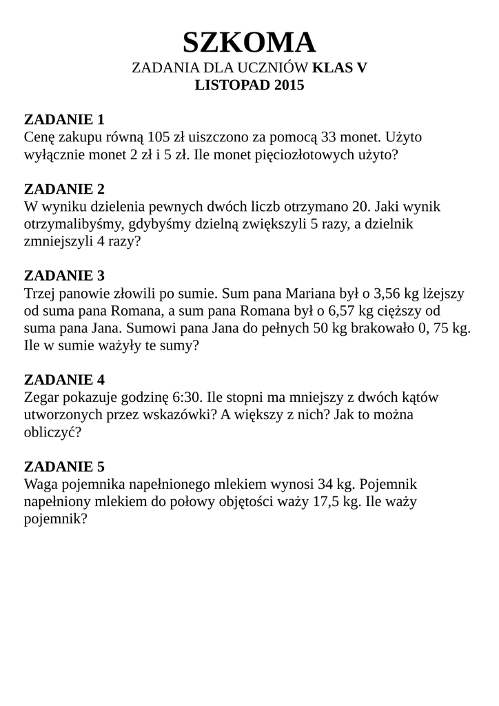 SZKOMA ZADANIA DLA UCZNIÓW KLAS V LISTOPAD 2015 ZADANIE 1 Cenę zakupu równą 105 zł uiszczono za pomocą 33 monet. Użyto wyłącznie monet 2 zł i 5 zł. Ile monet pięciozłotowych użyto? ZADANIE 2 W wyniku dzielenia pewnych dwóch liczb otrzymano 20. Jaki wynik otrzymalibyśmy, gdybyśmy dzielną zwiększyli 5 razy, a dzielnik zmniejszyli 4 razy? ZADANIE 3 Trzej panowie złowili po sumie. Sum pana Mariana był o 3,56 kg lżejszy od suma pana Romana, a sum pana Romana był o 6,57 kg cięższy od suma pana Jana. Sumowi pana Jana do pełnych 50 kg brakowało 0, 75 kg. Ile w sumie ważyły te sumy? ZADANIE 4 Zegar pokazuje godzinę 6:30. Ile stopni ma mniejszy z dwóch kątów utworzonych przez wskazówki? A większy z nich? Jak to można obliczyć? ZADANIE 5 Waga pojemnika napełnionego mlekiem wynosi 34 kg. Pojemnik napełniony mlekiem do połowy objętości waży 17,5 kg. Ile waży pojemnik? SZKOMA ZADANIA DLA UCZNIÓW KLAS V LISTOPAD 2015 ZADANIE 1 Cenę zakupu równą 105 zł uiszczono za pomocą 33 monet. Użyto wyłącznie monet 2 zł i 5 zł. Ile monet pięciozłotowych użyto? ZADANIE 2 W wyniku dzielenia pewnych dwóch liczb otrzymano 20. Jaki wynik otrzymalibyśmy, gdybyśmy dzielną zwiększyli 5 razy, a dzielnik zmniejszyli 4 razy? ZADANIE 3 Trzej panowie złowili po sumie. Sum pana Mariana był o 3,56 kg lżejszy od suma pana Romana, a sum pana Romana był o 6,57 kg cięższy od suma pana Jana. Sumowi pana Jana do pełnych 50 kg brakowało 0, 75 kg. Ile w sumie ważyły te sumy? ZADANIE 4 Zegar pokazuje godzinę 6:30. Ile stopni ma mniejszy z dwóch kątów utworzonych przez wskazówki? A większy z nich? Jak to można obliczyć? ZADANIE 5 Waga pojemnika napełnionego mlekiem wynosi 34 kg. Pojemnik napełniony mlekiem do połowy objętości waży 17,5 kg. Ile waży pojemnik? SZKOMA ZADANIA DLA UCZNIÓW KLAS V LISTOPAD 2015 ZADANIE 1 Cenę zakupu równą 105 zł uiszczono za pomocą 33 monet. Użyto wyłącznie monet 2 zł i 5 zł. Ile monet pięciozłotowych użyto? ZADANIE 2 W wyniku dzielenia pewnych dwóch liczb otrzymano 20. Jaki wynik otrzymalibyśmy, gdybyśmy dzielną zwiększyli 5 razy, a dzielnik zmniejszyli 4 razy? ZADANIE 3 Trzej panowie złowili po sumie. Sum pana Mariana był o 3,56 kg lżejszy od suma pana Romana, a sum pana Romana był o 6,57 kg cięższy od suma pana Jana. Sumowi pana Jana do pełnych 50 kg brakowało 0, 75 kg. Ile w sumie ważyły te sumy? ZADANIE 4 Zegar pokazuje godzinę 6:30. Ile stopni ma mniejszy z dwóch kątów utworzonych przez wskazówki? A większy z nich? Jak to można obliczyć? ZADANIE 5 Waga pojemnika napełnionego mlekiem wynosi 34 kg. Pojemnik napełniony mlekiem do połowy objętości waży 17,5 kg. Ile waży pojemnik?