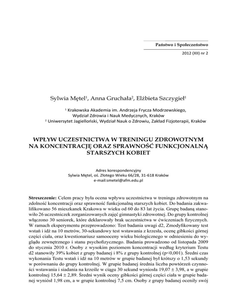 Państwo i Społeczeństwo 2012 (XII) nr 2 Sylwia Mętel1, Anna Gruchała2, Elżbieta Szczygieł1 1 Krakowska Akademia im. Andrzeja Frycza Modrzewskiego, Wydział Zdrowia i Nauk Medycznych, Kraków 2 Uniwersytet Jagielloński, Wydział Nauk o Zdrowiu, Zakład Fizjoterapii, Kraków WPŁYW UCZESTNICTWA W TRENINGU ZDROWOTNYM NA KONCENTRACJĘ ORAZ SPRAWNOŚĆ FUNKCJONALNĄ STARSZYCH KOBIET Adres korespondencyjny Sylwia Mętel, oś. Złotego Wieku 66/28, 31-618 Kraków e-mail:[email protected] Streszczenie: Celem pracy była ocena wpływu uczestnictwa w treningu zdrowotnym na zdolność koncentracji oraz sprawność funkcjonalną starszych kobiet. Do badania zakwalifikowano 56 mieszkanek Krakowa w wieku od 60 do 83 lat życia. Grupę badaną stanowiło 26 uczestniczek zorganizowanych zajęć gimnastyki zdrowotnej. Do grupy kontrolnej włączono 30 seniorek, które deklarowały brak uczestnictwa w ćwiczeniach fizycznych. W ramach eksperymentu przeprowadzono: Test badania uwagi d2, Zmodyfikowany test wstań i idź na 10 metrów, 30-sekundowy test wstawania z krzesła, ocenę gibkości górnej części ciała, oraz kwestionariusz samooceny wieku biologicznego w odniesieniu do wyglądu zewnętrznego i stanu psychofizycznego. Badania prowadzono od listopada 2009 do stycznia 2010 r. Osoby z wysokim poziomem koncentracji według kryterium Testu d2 stanowiły 39% kobiet z grupy badanej i 8% z grupy kontrolnej (p<0,001). Średni czas wykonania Testu wstań i idź na 10 metrów w grupie badanej był krótszy o 1,53 sekundy w porównaniu do grupy kontrolnej. W grupie badanej średnia liczba powtórzeń czynności wstawania i siadania na krześle w ciągu 30 sekund wyniosła 19,07 ± 3,98, a w grupie kontrolnej 15,64 ± 2,89. Średni wynik oceny gibkości górnej części ciała w grupie badanej wyniósł 1,98 cm, a w grupie kontrolnej 7,5 cm. Osoby z grupy badanej oceniły swój 34 SYLWIA MĘTEL, ANNA GRUCHAŁA, ELŻBIETA SZCZYGIEŁ wiek biologiczny jako niższy średnio o 3 lata od wieku kalendarzowego w porównaniu do osób z grupy kontrolnej. Wyniki badań wskazują, że systematyczne uczestnictwo w zajęciach treningu zdrowotnego wpływa korzystnie na utrzymanie dobrych parametrów zdolności koncentracji starszych kobiet. Słowa kluczowe: trening zdrowotny, koncentracja, sprawność funkcjonalna, osoby starsze