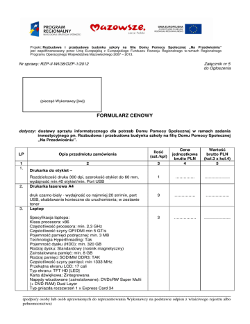 Projekt: Rozbudowa i przebudowa budynku szkoły na fili Domu Pomocy Społecznej „Na Przedwio niu” jest współfinansowany przez Uni Europejsk z Europejskiego Funduszu Rozwoju Regionalnego w ramach Regionalnego Programu Operacyjnego Województwa Mazowieckiego 2007 – 2013. Nr sprawy: RZP-II-WI/38/DZP-1/2012 (piecz Zał cznik nr 5 do Ogłoszenia Wykonawcy [ów]) FORMULARZ CENOWY dotyczy: dostawy sprz tu informatycznego dla potrzeb Domu Pomocy Społecznej w ramach zadania inwestycyjnego pn. Rozbudowa i przebudowa budynku szkoły na fili Domu Pomocy Społecznej „Na Przedwio niu”. 3 Cena jednostkowa brutto PLN 4 Warto brutto PLN (kol.3 x kol.4) 5 1 ………….. ……………… 2. Rozdzielczo druku 300 dpi, szeroko etykiet do 60 mm, wydajno min.40 etykiet/min. Port USB Drukarka laserowa A4 9 …………… …………….. 3. druk czarno-biały - wydajno co najmniej 20 str/min, port USB, okablowanie konieczne do uruchomienia; w zestawie toner Laptop Specyfikacja laptopa: Klasa procesora: x86 Cz stotliwo procesora: min. 2,3 GHz Cz stotliwo szyny QPI/DMI min 5 GT/s Pojemno pami ci podr cznej: min. 3 MB Technologia Hyperthreading: Tak Pojemno dysku (HDD): min. 320 GB Rodzaj dysku: Standardowy (no nik magnetyczny) Zainstalowana pami : min. 8 GB Rodzaj pami ci SODIMM DDR3: TAK Cz stotliwo szyny pami ci: min 1333 MHz Przek tna ekranu LCD: 17 cali Typ ekranu: TFT HD [LED] Karta d wi kowa: Zintegrowana Nap dy wbudowane (zainstalowane): DVD±RW Super Multi (+ DVD-RAM) Dual Layer Typ gniazda rozszerze 1 x Express Card 34 3 ……………. ………………. LP Opis przedmiotu zamówienia Ilo (szt./kpl) 1 1. 2 Drukarka do etykiet – ______________________________________________________________________________________________ (podpis/y osoby lub osób uprawnionych do reprezentowania Wykonawcy na podstawie odpisu z wła ciwego rejestru albo pełnomocnictwa) Nr sprawy: RZP-II-WI/38/DZP-1/2012 Urz dzenia wskazuj ce: TouchPad Rodzaj baterii: Li-Ion (6 Cells) Zł cza zewn. - 1x 15-stykowe D-Sub (wyj cie na monitor) - 1 x HDMI - min. 1x USB 2.0 - min. 2x USB 3.0 - 1x RJ-45 (LAN) - 1x E-SATA/USB Combo - Wyj cie słuchawkowe - wej cie na mikrofon - wej cie zasilania (DC-in) Bezprzewodowa karta sieciowa WiFi Typ bezprzewodowej karty sieciowej: IEEE 802.11b/g/n Bluetooh Czytnik kart pami ci Typy odczytywanych kart pami ci: SecureDigital Card, SecureDigital Card High-Capacity (SDHC), MultiMedia Plus Card, MemoryStick, MemoryStick Pro, xD-Picture Card Wyposa enie standardowe: - 1x10/100/1000BaseT Gigabitethernet (RJ45) - Gło niki stereo - Mikrofon - Zintegrowana kamera - Czytnik linii papilarnych - Pod wietlana klawiatura Zainstalowany system operacyjny: Microsoft Windows 7 Professional PL 64-bit. Program biurowy Microsoft Office 2010 Profesional. Oprogramowanie antywirusowe z licencj na min. 2 lata. Urz dzenie wielofunkcyjne (fax, drukarka, skaner, kopiarka) 4 5. - technologia laserowa do formatu A-4.; automatyczny podajnik dokumentów - min. 30 arkuszy; zasobnik papieru min. 250 arkuszy, komplet tonerów. DRUK rozdzielczo drukowania 600x600 dpi, pr dko drukowania min 20 str/min (kolor); wydruk dwustronny; pami drukowania - min. 500 MB; podł czenie BaseT Ethernet, USB 2.0; SKAN rozdzielczo skanowania 1200x1200 dpi; Miejsca skanowania: do sieci, do pami ci USB, do poczty e-mail. Zapis plików w formacie PDF i TIFF KOPIA zmniejszanie i powi kszanie kopii; kopiowanie jednostronnych oryginałów na dwustronne kopie; rozdzielczo 600x600 dpi . FAKS kompresja faksu JBIG, JPEG, MMR/MR/MH; Funkcje faksu: wysyłanie z opó nieniem, faks LAN, przekazywanie faksów Zestaw komputerowy Specyfikacja zestawu komputerowego: Typ obudowy komputera: slimtower stoj co – le ca Opis zastosowania: aplikacje biurowe Maksymalna ilo zainstalowanych procesorów: 1 szt. Typ zainstalowanego procesora: x86 Cz stotliwo procesora: min. 3,3 GHz Cz stotliwo szyny QPI/DMI min. 5 GT/s Zał cznik nr 5 do Ogłoszenia 1 ………………. ……………… 10 ………….. ……………… ______________________________________________________________________________________________ (podpis/y osoby lub osób uprawnionych do reprezentowania Wykonawcy na podstawie odpisu z wła ciwego rejestru albo pełnomocnictwa) 2/4 Nr sprawy: RZP-II-WI/38/DZP-1/2012 Zał cznik nr 5 do Ogłoszenia Pojemno pami ci cache [L3] 3 MB: Tak Maksymalna ilo zainstalowanych dysków: 1 szt. Pojemno zainstalowanego dysku: min. 500 GB Typ zainstalowanego dysku: SATA II Pojemno zainstalowanej pami ci RAM: min. 4096 MB Rodzaj zainstalowanej pami ci: DDR3 Typ pami ci Non-ECC Cz stotliwo szyny pami ci: min. 1333 MHz Ilo banków pami ci: 2 szt. Zintegrowana karta graficzna Zintegrowana karta d wi kowa Zintegrowana karta sieciowa Typ zintegrowanej karty sieciowej : 10/100/1000 Mbit/s Ilo slotów PCI-E 1x: min. 3 szt. Ilo wolnych slotów PCI-E 1x: 3 szt. Ilo slotów PCI-E 16x: 1 szt. Ilo wolnych slotów PCI-E 16x: 1 szt. Interfejsy: - 1 x 15-stykowe D-Sub (wyj cie na monitor) - 1 x HDMI - 8 x USB 2.0 (6 x USB 2.0(tylny panel), 2 x USB 2.0 (przedni panel)) - 1 x RJ-45 (LAN) - 1 x wyj cie słuchawkowe (na froncie obudowy) - 1 x wej cie na mikrofon (na froncie obudowy) - 1 x wej cie na mikrofon (na tyle obudowy) - 1 x wej cie liniowe - 1 x wyj cie liniowe Nap dy wbudowane (zainstalowane): DVD±RW Super Multi (+ DVD-RAM) Dual Layer Wyposa enie dodatkowe: BIOS płyty głównej dostarczanej jednostki centralnej nie starszy ni 12 miesi cy od daty dostarczenia do Zamawiaj cego. Funkcja blokowania wej cia do BIOS oraz blokowania startu systemu operacyjnego (gwarantuj ca utrzymanie zapisanego hasła nawet w przypadku odł czenia wszystkich ródeł zasilania i podtrzymania BIOS) Funkcja blokowania/odblokowania BOOT-owania jednostki komputerowej z zewn trznych urz dze Funkcja umo liwiaj ce blokowanie hasłem administratora mo liwo ci modyfikacji ustawie BIOS’u. Funkcja ustawieniu portów USB w trybie „no BOOT”, czyli podczas startu komputer nie wykrywa urz dze bootuj 