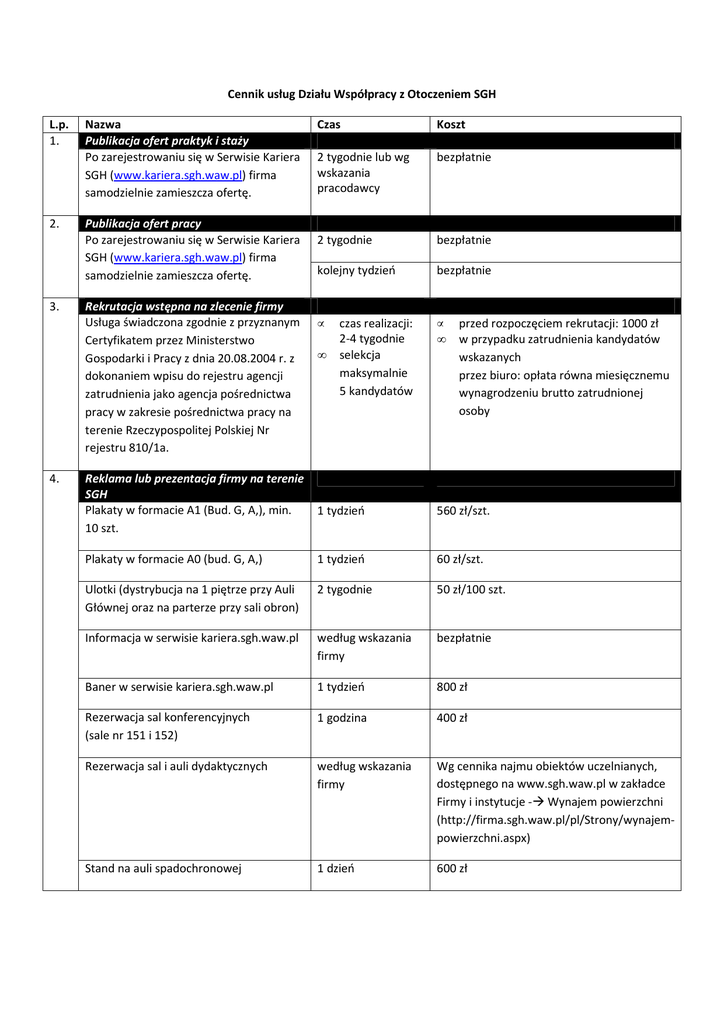 Cennik usług Działu Współpracy z Otoczeniem SGH L.p. 1. 2. 3. 4. Nazwa Publikacja ofert praktyk i staży Po zarejestrowaniu się w Serwisie Kariera SGH (www.kariera.sgh.waw.pl) firma samodzielnie zamieszcza ofertę. Publikacja ofert pracy Po zarejestrowaniu się w Serwisie Kariera SGH (www.kariera.sgh.waw.pl) firma samodzielnie zamieszcza ofertę. Rekrutacja wstępna na zlecenie firmy Usługa świadczona zgodnie z przyznanym Certyfikatem przez Ministerstwo Gospodarki i Pracy z dnia 20.08.2004 r. z dokonaniem wpisu do rejestru agencji zatrudnienia jako agencja pośrednictwa pracy w zakresie pośrednictwa pracy na terenie Rzeczypospolitej Polskiej Nr rejestru 810/1a. Reklama lub prezentacja firmy na terenie SGH Plakaty w formacie A1 (Bud. G, A,), min. 10 szt. Czas Koszt 2 tygodnie lub wg wskazania pracodawcy bezpłatnie 2 tygodnie bezpłatnie kolejny tydzień bezpłatnie • • • • czas realizacji: 2-4 tygodnie selekcja maksymalnie 5 kandydatów przed rozpoczęciem rekrutacji: 1000 zł w przypadku zatrudnienia kandydatów wskazanych przez biuro: opłata równa miesięcznemu wynagrodzeniu brutto zatrudnionej osoby 1 tydzień 560 zł/szt. Plakaty w formacie A0 (bud. G, A,) 1 tydzień 60 zł/szt. Ulotki (dystrybucja na 1 piętrze przy Auli Głównej oraz na parterze przy sali obron) 2 tygodnie 50 zł/100 szt. Informacja w serwisie kariera.sgh.waw.pl według wskazania firmy bezpłatnie Baner w serwisie kariera.sgh.waw.pl 1 tydzień 800 zł Rezerwacja sal konferencyjnych (sale nr 151 i 152) 1 godzina 400 zł Rezerwacja sal i auli dydaktycznych według wskazania firmy Wg cennika najmu obiektów uczelnianych, dostępnego na www.sgh.waw.pl w zakładce Firmy i instytucje - Wynajem powierzchni (http://firma.sgh.waw.pl/pl/Strony/wynajempowierzchni.aspx) Stand na auli spadochronowej 1 dzień 600 zł