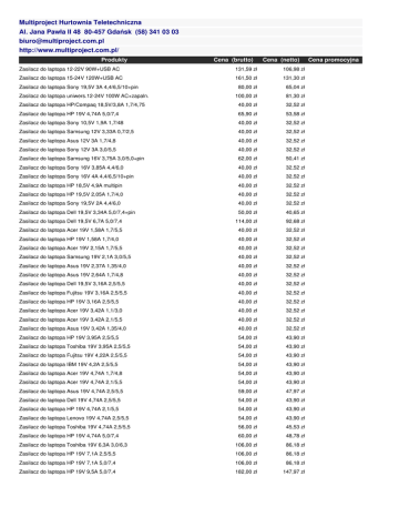 Multiproject Hurtownia Teletechniczna Al. Jana Pawła II 48 80-457 Gdańsk (58) 341 03 03 [email protected] http://www.multiproject.com.pl/ Produkty Cena (brutto) Cena (netto) Zasilacz do laptopa 12-22V 90W+USB AC 131,59 zł 106,98 zł Zasilacz do laptopa 15-24V 120W+USB AC 161,50 zł 131,30 zł Zasilacz do laptopa Sony 19,5V 3A 4,4/6,5/10+pin 80,00 zł 65,04 zł 100,00 zł 81,30 zł Zasilacz do laptopa HP/Compaq 18,5V/3,8A 1,7/4,75 40,00 zł 32,52 zł Zasilacz do laptopa HP 19V 4,74A 5,0/7,4 65,90 zł 53,58 zł Zasilacz do laptopa Sony 10,5V 1,9A 1,7/48 40,00 zł 32,52 zł Zasilacz do laptopa Samsung 12V 3,33A 0,7/2,5 40,00 zł 32,52 zł Zasilacz do laptopa Asus 12V 3A 1,7/4,8 40,00 zł 32,52 zł Zasilacz do laptopa Sony 12V 3A 3,0/5,5 40,00 zł 32,52 zł Zasilacz do laptopa Samsung 16V 3,75A 3,0/5,0+pin 62,00 zł 50,41 zł Zasilacz do laptopa Sony 16V 3,85A 4,4/6,0 40,00 zł 32,52 zł Zasilacz do laptopa Sony 16V 4A 4,4/6,5/10+pin 40,00 zł 32,52 zł Zasilacz do laptopa HP 18,5V 4,9A multipin 40,00 zł 32,52 zł Zasilacz do laptopa HP 19,5V 2,05A 1,7/4,0 40,00 zł 32,52 zł Zasilacz do laptopa Sony 19,5V 2A 4,4/6,0 40,00 zł 32,52 zł Zasilacz do laptopa uniwers.12-24V 100W AC+zapaln. Zasilacz do laptopa Dell 19,5V 3,34A 5,0/7,4+pin 50,00 zł 40,65 zł Zasilacz do laptopa Dell 19,5V 6,7A 5,0/7,4 114,00 zł 92,68 zł Zasilacz do laptopa Acer 19V 1,58A 1,7/5,5 40,00 zł 32,52 zł Zasilacz do laptopa HP 19V 1,58A 1,7/4,0 40,00 zł 32,52 zł Zasilacz do laptopa Acer 19V 2,15A 1,7/5,5 40,00 zł 32,52 zł Zasilacz do laptopa Samsung 19V 2,1A 3,0/5,5 40,00 zł 32,52 zł Zasilacz do laptopa Asus 19V 2,37A 1,35/4,0 40,00 zł 32,52 zł Zasilacz do laptopa Asus 19V 2,64A 1,7/4,8 40,00 zł 32,52 zł Zasilacz do laptopa Dell 19,5V 3,16A 2,5/5,5 40,00 zł 32,52 zł Zasilacz do laptopa Fujitsu 19V 3,16A 2,5/5,5 40,00 zł 32,52 zł Zasilacz do laptopa HP 19V 3,16A 2,5/5,5 40,00 zł 32,52 zł Zasilacz do laptopa Acer 19V 3,42A 1,1/3,0 40,00 zł 32,52 zł Zasilacz do laptopa Acer 19V 3,42A 2,1/5,5 40,00 zł 32,52 zł Zasilacz do laptopa Asus 19V 3,42A 1,35/4,0 40,00 zł 32,52 zł Zasilacz do laptopa HP 19V 3,95A 2,5/5,5 54,00 zł 43,90 zł Zasilacz do laptopa Toshiba 19V 3,95A 2,5/5,5 54,00 zł 43,90 zł Zasilacz do laptopa Fujitsu 19V 4,22A 2,5/5,5 54,00 zł 43,90 zł Zasilacz do laptopa IBM 19V 4,2A 2,5/5,5 54,00 zł 43,90 zł Zasilacz do laptopa Acer 19V 4,74A 1,7/4,8 54,00 zł 43,90 zł Zasilacz do laptopa Acer 19V 4,74A 2,1/5,5 54,00 zł 43,90 zł Zasilacz do laptopa Asus 19V 4,74A 2,5/5,5 59,00 zł 47,97 zł Zasilacz do laptopa Dell 19V 4,74A 2,5/5,5 54,00 zł 43,90 zł Zasilacz do laptopa HP 19V 4,74A 2,1/5,5 54,00 zł 43,90 zł Zasilacz do laptopa Lenovo 19V 4,74A 2,5/5,5 54,00 zł 43,90 zł Zasilacz do laptopa Toshiba 19V 4,74A 2,5/5,5 56,00 zł 45,53 zł Zasilacz do laptopa HP 19V 4,74A 5,0/7,4 60,00 zł 48,78 zł Zasilacz do laptopa Toshiba 19V 6,3A 3,0/6,3 106,00 zł 86,18 zł Zasilacz do laptopa HP 19V 7,1A 2,5/5,5 106,00 zł 86,18 zł Zasilacz do laptopa HP 19V 7,1A 5,0/7,4 106,00 zł 86,18 zł Zasilacz do laptopa HP 19V 9,5A 5,0/7,4 182,00 zł 147,97 zł Cena promocyjna Zasilacz do laptopa Lenovo 20V 2A 2,5/5,5 40,00 zł 32,52 zł Zasilacz do laptopa Dell 20V 3,5A DC Dell 3pin 40,00 zł 32,52 zł Zasilacz do laptopa Lenovo 20V 2,25A DC NT 74,00 zł 60,16 zł