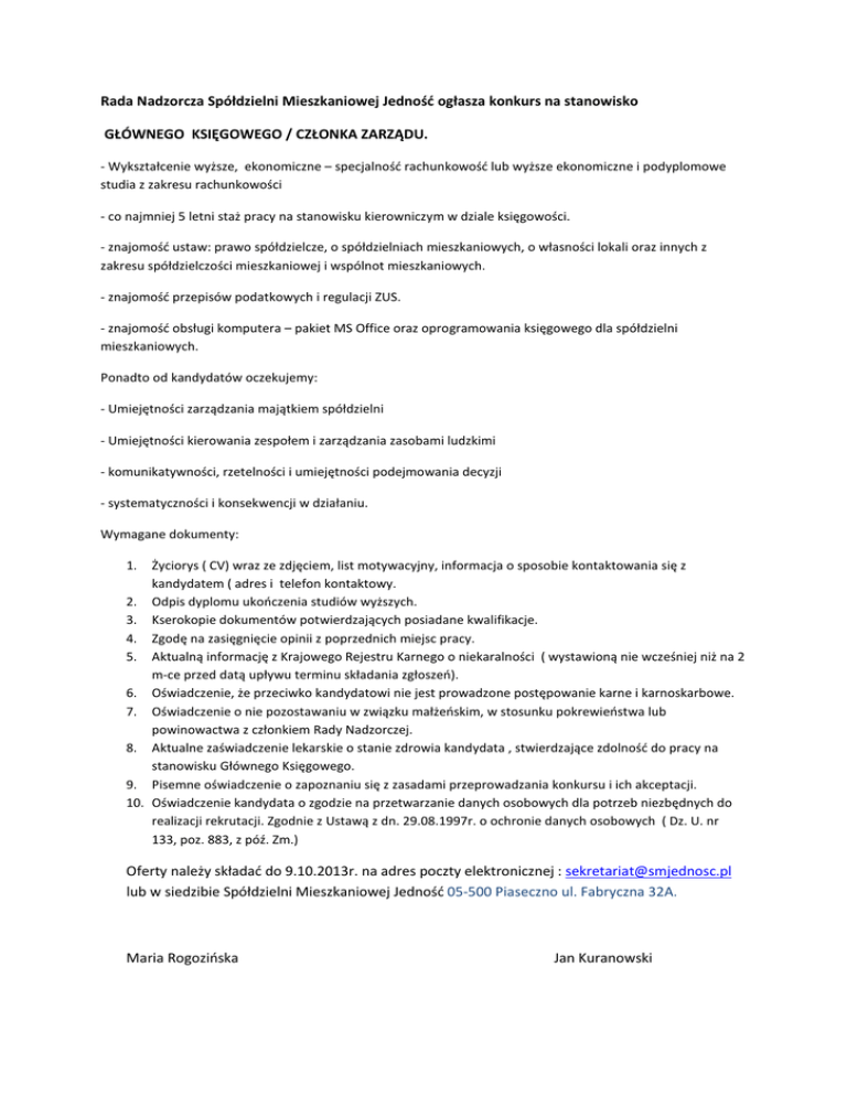 Rada Nadzorcza Spółdzielni Mieszkaniowej Jedność ogłasza konkurs na stanowisko GŁÓWNEGO KSIĘGOWEGO / CZŁONKA ZARZĄDU. - Wykształcenie wyższe, ekonomiczne – specjalność rachunkowość lub wyższe ekonomiczne i podyplomowe studia z zakresu rachunkowości - co najmniej 5 letni staż pracy na stanowisku kierowniczym w dziale księgowości. - znajomość ustaw: prawo spółdzielcze, o spółdzielniach mieszkaniowych, o własności lokali oraz innych z zakresu spółdzielczości mieszkaniowej i wspólnot mieszkaniowych. - znajomość przepisów podatkowych i regulacji ZUS. - znajomość obsługi komputera – pakiet MS Office oraz oprogramowania księgowego dla spółdzielni mieszkaniowych. Ponadto od kandydatów oczekujemy: - Umiejętności zarządzania majątkiem spółdzielni - Umiejętności kierowania zespołem i zarządzania zasobami ludzkimi - komunikatywności, rzetelności i umiejętności podejmowania decyzji - systematyczności i konsekwencji w działaniu. Wymagane dokumenty: 1. Życiorys ( CV) wraz ze zdjęciem, list motywacyjny, informacja o sposobie kontaktowania się z kandydatem ( adres i telefon kontaktowy. 2. Odpis dyplomu ukończenia studiów wyższych. 3. Kserokopie dokumentów potwierdzających posiadane kwalifikacje. 4. Zgodę na zasięgnięcie opinii z poprzednich miejsc pracy. 5. Aktualną informację z Krajowego Rejestru Karnego o niekaralności ( wystawioną nie wcześniej niż na 2 m-ce przed datą upływu terminu składania zgłoszeń). 6. Oświadczenie, że przeciwko kandydatowi nie jest prowadzone postępowanie karne i karnoskarbowe. 7. Oświadczenie o nie pozostawaniu w związku małżeńskim, w stosunku pokrewieństwa lub powinowactwa z członkiem Rady Nadzorczej. 8. Aktualne zaświadczenie lekarskie o stanie zdrowia kandydata , stwierdzające zdolność do pracy na stanowisku Głównego Księgowego. 9. Pisemne oświadczenie o zapoznaniu się z zasadami przeprowadzania konkursu i ich akceptacji. 10. Oświadczenie kandydata o zgodzie na przetwarzanie danych osobowych dla potrzeb niezbędnych do realizacji rekrutacji. Zgodnie z Ustawą z dn. 29.08.1997r. o ochronie danych osobowych ( Dz. U. nr 133, poz. 883, z póź. Zm.) Oferty należy składać do 9.10.2013r. na adres poczty elektronicznej : [email protected] lub w siedzibie Spółdzielni Mieszkaniowej Jedność 05-500 Piaseczno ul. Fabryczna 32A. Maria Rogozińska Jan Kuranowski