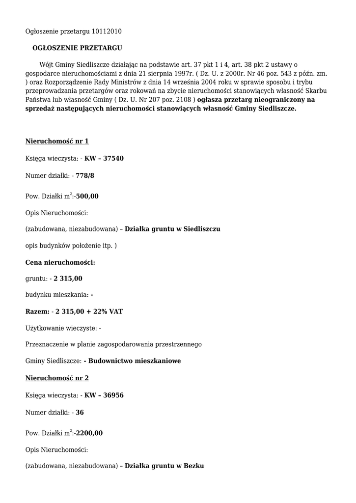 Ogłoszenie przetargu 10112010 OGŁOSZENIE PRZETARGU Wójt Gminy Siedliszcze działając na podstawie art. 37 pkt 1 i 4, art. 38 pkt 2 ustawy o gospodarce nieruchomościami z dnia 21 sierpnia 1997r. ( Dz. U. z 2000r. Nr 46 poz. 543 z późn. zm. ) oraz Rozporządzenie Rady Ministrów z dnia 14 września 2004 roku w sprawie sposobu i trybu przeprowadzania przetargów oraz rokowań na zbycie nieruchomości stanowiących własność Skarbu Państwa lub własność Gminy ( Dz. U. Nr 207 poz. 2108 ) ogłasza przetarg nieograniczony na sprzedaż następujących nieruchomości stanowiących własność Gminy Siedliszcze. Nieruchomość nr 1 Księga wieczysta: - KW – 37540 Numer działki: - 778/8 2 Pow. Działki m :-500,00 Opis Nieruchomości: (zabudowana, niezabudowana) – Działka gruntu w Siedliszczu opis budynków położenie itp. ) Cena nieruchomości: gruntu: - 2 315,00 budynku mieszkania: Razem: - 2 315,00 + 22% VAT Użytkowanie wieczyste: Przeznaczenie w planie zagospodarowania przestrzennego Gminy Siedliszcze: - Budownictwo mieszkaniowe Nieruchomość nr 2 Księga wieczysta: - KW – 36956 Numer działki: - 36 Pow. Działki m2:-2200,00 Opis Nieruchomości: (zabudowana, niezabudowana) – Działka gruntu w Bezku opis budynków położenie itp. ) Cena nieruchomości: gruntu: - 17 204,00 budynku mieszkania: Razem: - 17 204,00 + 22% VAT Użytkowanie wieczyste: Przeznaczenie w planie zagospodarowania przestrzennego Gminy Siedliszcze: - Budownictwo mieszkaniowe z możliwością jednorodzinną FORMA ZBYCIA Przetarg ustny nieograniczony w siedzibie Urzędu Gminy Siedliszczu, w dniu 14-12-2010r. o godz. 10 UWAGI!!! W przetargu mogą brać udział osoby fizyczne i prawne, jeżeli wpłacą na konto Urzędu Gminy Siedliszcze wadium w wysokości 10 % ceny wywoławczej nieruchomości w terminie nie później niż na 3 dni przed dniem przetargu na konto bankowe BS CHEŁM / O.SIEDLISZCZE NR: 57 8187 0004 2007 0150 0048 0001 Wpłacone wadium zostanie: - zaliczone na poczet ceny nabycia, jeżeli osoba wpłacająca wygra przetarg - zwrócona jeśli osoba wpłacająca przetargu nie wygra Wysokość postąpienia nie może być mniejsza niż 1% ceny wywoławczej z zaokrągleniem w górę do pełnych dziesiątek złotych. W przypadku uchylenia się nabywcy, który wygrał przetarg od zawarcia umowy sprzedaży w terminie i miejscu wyznaczonym przez organizatora przetargu, Wójt Gminy może odstąpić od zawarcia aktu notarialnego, a wpłacone wadium nie podlega zwrotowi. Gminie przysługuje umowne prawo odkupu przedmiotowych działek bez prawa naliczania odsetek ustawowych w przypadku nie rozpoczęcia budowy budynku w okresie 5 lat od daty zawarcia aktu notarialnego. Na przedmiotowej/ych nieruchomości/ach nie istnieją żadne obciążenia i zobowiązania. Zastrzega się prawo do odwołania przetargu z uzasadnionych przyczyn i podając informację. Wykaz zamieszczono dnia 2010-10-11 mgr inż. Hieronim Zonik Wójt Gminy Siedliszcze