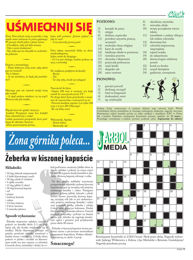 UŚMIECHNIJ SIĘ Zima. Dwa jelenie stoją na paśniku i żują ospale siano nałożone tu przez gajowego. W pewnej chwili jeden z jeleni mówi: - Chciałbym, żeby już była wiosna. - Tak ci mróz doskwiera? - Nie, tylko już mi obrzydło to stołówkowe jedzenie. W Pacjent u stomatologa: - Panie doktorze, bolą mnie zęby, które pan mi wstawił! Na to lekarz: - A nie mówiłem, że będą jak prawdziwe?! W Dlaczego pan nie ratował swojej żony, gdy tonęła? – A skąd miałem wiedzieć, że się topi?! Wrzeszczała jak zwykle... W Wpada facet do apteki i krzyczy: -Ludzie! Przepuście mnie bez kolejki! Tam człowiek leży i czeka! Ludzie poruszeni przepuścili, facet podbiega do okienka i krzyczy: -Dwie prezerwatywy proszę... Jasiu, jeśli powiem: „Jestem piękna”, to jaki to czas? - Czas przeszły, proszę pani! W Dwa rekiny zauważyły łebka na desce windsurfingowej. Jeden mówi do drugiego: - O. I to jest obsługa. Ładnie podane, na tacy, z serwetką! W Do wędkarza podpływa krokodyl: - Biorą? - Nie - To olej ryby, chodź się wykąpać! W Nauczyciel do Jasia: -Napisz 100 razy w zeszycie: nie będę mówił do nauczyciela przez TY”. Na drugi dzień Jasiu przychodzi z zeszytem do nauczyciela, a nauczyciel na to: -Przecież kazałem napisać ci to tylko 100 razy, a tu jest 200. Dlaczego? -Bo cię lubię stary! W Walentynki. Apteka: - Dzień dobry. - Skończyły się! POZIOMO: 2) 5) 6) 11) 14) 15) 16) 17) 21) 25) 26) 27) 28) kanapki do pracy sztygar drobina, cząsteczka protektor artystów, pisarzy, uczonych wschodni obraz religijny karty do wróżb lokalizuje obiekt w powietrzu teatralna przerwa skrzynka z klejnotami pomocnik proboszcza część kartki skupisko ryb samo centrum 8) 9) 10) 11) 12) 13) 18) 19) 20) 22) 23) 24) określenie, wyzwisko mrzonka, ułuda wcięty początkowy wiersz tekstu żartobliwie o małym chłopcu lub niskim człowieku drewniany but człowiek nieproszony, niepożądany najazd wojska do zakasywania dawny, bogato zdobiony powóz korek na drodze zespół dźwięków gnębienie, ciemiężenie PIONOWO: 1) 2) 3) 4) 7) pasożyt pszczół drobiazg, szczegół fotel na biegunach doskonałość, wzór np. artyleryjski Kolejne liczby umieszczone w prawym dolnym rogu utworzą hasło. Wśród Czytelników, którzy prawidłowo je rozwiążą rozlosujemy atrakcyjne nagrody rzeczowe. Rozwiązania należy przesłać pocztą na adres redakcji z dopiskiem ZZG w Polsce lub e-mailem Poprawne rozwiązania krzyżówek prosimy nadsyłać do 15 marca . Przesyłając rozwiązania e-mailem prosimy podawać adres. Zapraszamy do zabawy! Żeberka w kiszonej kapuście Składniki: • 50 dag żeberek wieprzowych • 2 łyżki klarowanego masła • 30 dag cebuli (3 średnie) • 4 ząbki czosnku • 15 dag jabłek (1 duże) • 50 dag kiszonej kapusty • sól • pieprz • mielony kminek • cukier • 3/4 litra bulionu • 2 liście laurowe • 2 ziarenka jałowca Sposób wykonania: Żeberka wieprzowe opłukać, osuszyć i pokroić na kawałki około 2-3 cm (najlepiej tak, aby kostka znajdowała się w środku). Masło klarowane roztopić na patelni, przełożyć żeberka, zrumienić z każdej strony i wyciągnąć. Cebulę obrać, pokroić w piórka i zeszklić na klarowanym maśle (na tym samym, co żeberka). Czosnek obrać, zmiażdżyć i dodać do ce- buli pod koniec smażenia. Jabłko obrać ze skórki, opłukać i pokroić na osiem części (w tzw. 8), a potem każdy kawałek w plasterki. Kiszoną kapustę odcisnąć z soku. Na dno garnka wykładać warstwami przygotowane składniki: połowę kiszonej kapusty, posypać ją szczyptą soli, pieprzu, mielonego kminku i cukru. Następnie wyłożyć połowę jabłek, żeberek i cebuli. Potem znowu pozostałą kiszoną kapustę, szczyptę soli (ale to już niekoniecznie), pieprzu, mielonego kminku i cukru oraz pozostałe jabłka, żeberka i cebulę. Całość zalać gorącym bulionem. Dodać liście laurowe i ziarenka jałowca. Garnek przykryć pokrywką i położyć na dużym ogniu, gdy żeberka się zagotują zmniejszyć ogień i gotować pod przykryciem przez około 80 minut. Żeberka w kiszonej kapuście można podawać razem z pieczonymi ziemniakami posypanymi koperkiem. Podane składniki wystarczą na około 5 porcji. Smacznego! Rozwiązanie krzyżówki nr 2/2013 brzmi: Skok przez skórę. Nagrody wylosowali: Jadwiga Witkiewicz z Zabrza i Jan Michalski z Bytomia. Gratulujemy! Nagrody prześlemy pocztą. strona 11