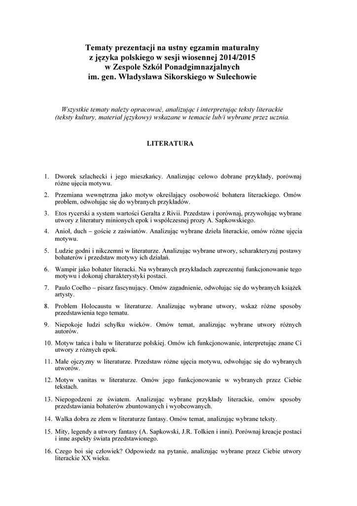 Tematy prezentacji na ustny egzamin maturalny z języka polskiego w sesji wiosennej 2014/2015 w Zespole Szkół Ponadgimnazjalnych im. gen. Władysława Sikorskiego w Sulechowie Wszystkie tematy należy opracować, analizując i interpretując teksty literackie (teksty kultury, materiał językowy) wskazane w temacie lub/i wybrane przez ucznia. LITERATURA 1. Dworek szlachecki i jego mieszkańcy. Analizując celowo dobrane przykłady, porównaj różne ujęcia motywu. 2. Przemiana wewnętrzna jako motyw określający osobowość bohatera literackiego. Omów problem, odwołując się do wybranych przykładów. 3. Etos rycerski a system wartości Geralta z Rivii. Przedstaw i porównaj, przywołując wybrane utwory z literatury minionych epok i współczesnej prozy A. Sapkowskiego. 4. Anioł, duch – goście z zaświatów. Analizując wybrane dzieła literackie, omów różne ujęcia motywu. 5. Ludzie godni i nikczemni w literaturze. Analizując wybrane utwory, scharakteryzuj postawy bohaterów i przedstaw motywy ich działań. 6. Wampir jako bohater literacki. Na wybranych przykładach zaprezentuj funkcjonowanie tego motywu i dokonaj charakterystyki postaci. 7. Paulo Coelho – pisarz fascynujący. Omów zagadnienie, odwołując się do wybranych książek artysty. 8. Problem Holocaustu w literaturze. Analizując wybrane utwory, wskaż różne sposoby przedstawienia tego tematu. 9. Niepokoje ludzi schyłku wieków. Omów temat, analizując wybrane utwory różnych autorów. 10. Motyw tańca i balu w literaturze polskiej. Omów ich funkcjonowanie, interpretując znane Ci utwory z różnych epok. 11. Małe ojczyzny w literaturze. Przedstaw różne ujęcia motywu, odwołując się do wybranych utworów. 12. Motyw vanitas w literaturze. Omów jego funkcjonowanie w wybranych przez Ciebie tekstach. 13. Niepogodzeni ze światem. Analizując wybrane przykłady literackie, omów sposoby przedstawiania bohaterów zbuntowanych i wyobcowanych. 14. Walka dobra ze złem w literaturze fantasy. Omów temat, analizując wybrane teksty. 15. Mity, legendy a utwory fantasy (A. Sapkowski, J.R. Tolkien i inni). Porównaj kreacje postaci i inne aspekty świata przedstawionego. 16. Czego boi się człowiek? Odpowiedz na pytanie, analizując wybrane przez Ciebie utwory literackie XX wieku. 17. Bohaterowie literaccy w obliczu trudnego wyboru. Omów problem, odwołując się do decyzji i postaw wybranych przez Ciebie postaci. 18. Różne wizerunki władców w literaturze. Omów zagadnienie, charakteryzując wybranych bohaterów. 19. Motyw snu i widzenia w literaturze. Analizując wybrane teksty, omów różne ujęcia tego tematu. 20. Twórczość Jana Kochanowskiego w tradycji literackiej późniejszych epok. Omów temat, analizując wybrane utwory różnych twórców. 21. Literatura oświecenia bawi, uczy i wychowuje. Omów problem, odwołując się do wybranych dzieł tej epoki. 22. Motyw ogrodu w literaturze. Przedstaw różne jego ujęcia, analizując wybrane przykłady. 23. Polacy w satyrze i karykaturze literackiej. Omów temat, analizując wybrane utwory. 24. Motyw córki w literaturze. Analizując wybrane utwory, omów różne sposoby kreowania postaci. 25. Literackie portrety człowieka średniowiecza i renesansu. Analizując wybrane utwory literackie, porównaj wzorce osobowe epok. 26. Topos bohaterskiego umierania w literaturze. Przedstaw różne jego ujęcia, analizując wybrane utwory. 27. Literackie portrety człowieka romantyzmu i pozytywizmu. Porównaj typy bohaterów, uwzględniając kontekst epoki. 28. Groteskowe widzenie rzeczywistości. Analizując wybrane przykłady, omów funkcje groteski w literaturze. 29. Symbol/alegoria jako sposób mówienia o rzeczywistości. Interpretując wybrane przykłady, omów jego/jej rolę w kreacji świata przedstawionego. 30. Analizując twórczość J. R. Tolkiena, omów zaprezentowaną tam wizję świata przedstawionego. 31. Miasto i jego mieszkańcy w literaturze. Analizując celowo wybrane utwory literackie z przełomu XIX i XX wieku, przedstaw zmieniający się obraz miasta i jego mieszkańców. 32. Średniowieczny asceta, renesansowy humanista i barokowy Sarmata. Omów na wybranych przykładach wzorce osobowe kreowane przez twórców literatury staropolskiej. 33. Dramat współczesny jako wyraz problemów, niepokojów i dążeń człowieka. Interpretując celowo wybrane utwory z literatury polskiej i obcej, wykaż prawdziwość tego sformułowania oraz omów środki wyrazu wykorzystywane przez twórców. 34. Bohaterowie obłąkani w dramatach Williama Szekspira. Analizując teksty, porównaj wybrane postaci. 35. Człowiek wobec Boga, życia i śmierci. Omów temat, interpretując wybrane utwory z literatury staropolskiej. 36. Pisarz (poeta) jako kronikarz swoich czasów. Przedstaw zagadnienie na podstawie przykładów z różnych epok. 37. Różne kreacje bohatera romantycznego. Omów temat, analizując postawy wybranych postaci. 38. Wizja człowieka i świata w literaturze fantasy. Omów temat, analizując celowo wybrane teksty. 39. Konflikt pokoleń w literaturze. Omów problem na wybranych przykładach literatury polskiej. 40. Bohater zdeterminowany przez swoje otoczenie. Analizując celowo dobrane teksty literackie, omów wpływ środowiska na postawy wybranych postaci. 41. Literackie portrety młodych. Przedstaw różne sposoby kreacji bohaterów, analizując wybrane dzieła. 42. Przeznaczenie, przypadek, świadomy wybór – co decyduje o naszym losie? Interpretując wybrane utwory, porównaj różne ujęcia i rozstrzygnięcia tego dylematu w literaturze. 43. Świat wartości bohaterów średniowiecznych a system wartości człowieka współczesnego. Omów temat na przykładzie dowolnie wybranych dzieł. 44. Wieś w literaturze. Analizując wybrane utwory, omów funkcjonowanie tego toposu w dziełach różnych epok. 45. Motto i tytuł jako klucz do odczytania utworu literackiego. Interpretując wybrane przykłady, omów funkcję tych elementów dzieł