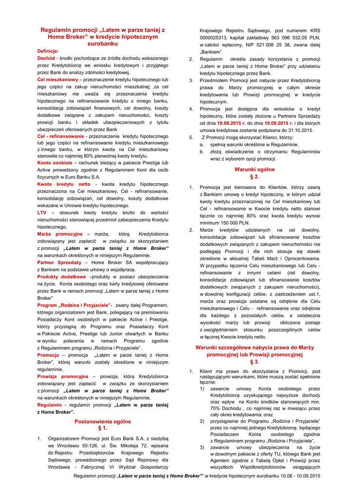 Regulamin promocji „Latem w parze taniej z Home Broker” w kredycie hipotecznym eurobanku Definicje: Dochód - środki pochodzące ze źródła dochodu wskazanego przez Kredytobiorcę we wniosku kredytowym i przyjętego przez Bank do analizy zdolności kredytowej. Cel mieszkaniowy – przeznaczenie kredytu hipotecznego lub jego części na zakup nieruchomości mieszkalnej; za cel mieszkaniowy nie uważa się przeznaczenia kredytu hipotecznego na refinansowanie kredytu z innego banku, konsolidację zobowiązań finansowych, cel dowolny, koszty dodatkowe związane z zakupem nieruchomości, koszty prowizji banku i składek ubezpieczeniowych z tytułu ubezpieczeń oferowanych przez Bank Cel - refinansowanie - przeznaczenie kredytu hipotecznego lub jego części na refinansowanie kredytu mieszkaniowego z innego banku, w którym kwota na Cel mieszkaniowy stanowiła co najmniej 80% pierwotnej kwoty kredytu. Konto osobiste – rachunek bieżący w pakiecie Prestige lub Active prowadzony zgodnie z Regulaminem Kont dla osób fizycznych w Euro Banku S.A. Kwota kredytu netto - kwota kredytu hipotecznego przeznaczona na Cel mieszkaniowy, Cel - refinansowanie, konsolidację zobowiązań, cel dowolny, koszty dodatkowe wskazane w Umowie kredytu hipotecznego. LTV – stosunek kwoty kredytu brutto do wartości nieruchomości stanowiącej przedmiot zabezpieczenia Kredytu hipotecznego, Marża promocyjna – marża, którą Kredytobiorca zobowiązany jest zapłacić w związku ze skorzystaniem z promocji „Latem w parze taniej z Home Broker” na warunkach określonych w niniejszym Regulaminie. Partner Sprzedaży – Home Broker SA współpracujący z Bankiem na podstawie umowy o współpracę. Produkty dodatkowe –produkty w postaci ubezpieczenia na życie, Konta osobistego oraz karty kredytowej oferowane przez Bank w ramach promocji „Latem w parze taniej z Home Broker” Program „Rodzina i Przyjaciele”- zwany dalej Programem, którego organizatorem jest Bank, polegający na premiowaniu Posiadaczy Kont osobistych w pakiecie Active i Prestige, którzy przystąpią do Programu oraz Posiadaczy Kont w Pakiecie Active, Prestige lub Junior otwartych w Banku w wyniku polecenia w ramach Programu zgodnie z Regulaminem programu „Rodzina i Przyjaciele”. Promocja – promocja „Latem w parze taniej z Home Broker”, której warunki zostały określone w niniejszym regulaminie, Prowizja promocyjna – prowizja, którą Kredytobiorca zobowiązany jest zapłacić w związku ze skorzystaniem z promocji „Latem w parze taniej z Home Broker” na warunkach określonych w niniejszym Regulaminie, Regulamin - regulamin promocji „Latem w parze taniej z Home Broker”. Postanowienia ogólne § 1. 1. Organizatorem Promocji jest Euro Bank S.A. z siedzibą we Wrocławiu 50-126, ul. Św. Mikołaja 72, wpisana do Rejestru Przedsiębiorców Krajowego Rejestru Sądowego, prowadzonego przez Sąd Rejonowy dla Wrocławia - Fabrycznej VI Wydział Gospodarczy 2. 3. 4. 5. Krajowego Rejestru Sądowego, pod numerem KRS 0000025313, kapitał zakładowy 563 096 032,05 PLN, w całości wpłacony, NIP 521 008 25 38, zwana dalej „Bankiem”. Regulamin określa zasady korzystania z promocji „Latem w parze taniej z Home Broker” przy udzielaniu kredytu hipotecznego przez Bank. Przedmiotem Promocji jest nabycie przez Kredytobiorcę prawa do Marży promocyjnej w całym okresie kredytowania lub Prowizji promocyjnej w kredycie hipotecznym. Promocja jest dostępna dla wniosków o kredyt hipoteczny, które zostały złożone u Partnera Sprzedaży od dnia 10.08.2015 r. do dnia 10.09.2015 r. i dla których umowa kredytowa zostanie podpisana do 31.10.2015. Z Promocji mogą skorzystać Klienci, którzy: a. spełnią warunki określone w Regulaminie, b. złożą oświadczenie o otrzymaniu Regulaminów wraz z wyborem opcji promocji. Warunki ogólne § 2. 1. 2. Promocja jest kierowana do Klientów, którzy zawrą z Bankiem umowę o kredyt hipoteczny, w którym udział kwoty kredytu przeznaczonej na Cel mieszkaniowy lub Cel - refinansowanie w Kwocie kredytu netto stanowi łącznie co najmniej 80% oraz kwota kredytu wynosi minimum 150 000 PLN. Marże kredytów udzielanych na cel dowolny, konsolidacje zobowiązań lub sfinansowanie kosztów dodatkowych związanych z zakupem nieruchomości nie podlegają Promocji i dla nich stosuje się stawki określone w aktualnej Tabeli Marż i Oprocentowania. W przypadku łączenia Celu mieszkaniowego lub Celu refinansowanie z innymi celami (cel dowolny, konsolidacje zobowiązań lub sfinansowanie kosztów dodatkowych związanych z zakupem nieruchomości), w dowolnej konfiguracji celów, z zastrzeżeniem ust.1, marża oraz prowizja ustalane są odrębnie dla Celu mieszkaniowego i Celu - refinansowanie oraz odrębnie dla każdego z pozostałych celów, a ostateczna wysokość marży lub prowizji obliczona zostaje z uwzględnieniem stosunku poszczególnych celów w łącznej Kwocie kredytu netto. Warunki szczegółowe nabycia prawa do Marży promocyjnej lub Prowizji promocyjnej § 3. 1. Klient ma prawo do skorzystania z Promocji, pod następującymi warunkami, które muszą zostać spełnione łącznie: 1) zawarcie umowy Konta osobistego przez Kredytobiorcę uzyskującego najwyższe dochody oraz wpływ na Konto środków stanowiących min. 70% Dochodu , co najmniej raz w miesiącu przez cały okres kredytowania; oraz 2) przystąpienie do Programu „Rodzina i Przyjaciele” przez co najmniej jednego Kredytobiorcę, będącego Posiadaczem Konta osobistego zgodnie z Regulaminem programu „Rodzina i Przyjaciele”, 3) zawarcie umowy ubezpieczenia na życie w dowolnym pakiecie z oferty TU, którego Bank jest Agentem zgodnie z Tabelą Opłat i Prowizji przez wszystkich Współkredytobiorców osiągających Regulamin promocji „Latem w parze taniej z Home Broker”” w kredycie hipotecznym eurobanku 10.08 - 10.09.2015 2. Dochód i utrzymywanie tego ubezpieczenia przez okres minimum pierwszych 10 lat kredytowania,