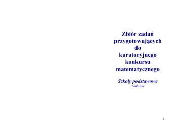 Zbiór zadań przygotowujących do kuratoryjnego konkursu matematycznego Szkoły podstawowe Zadania 1 Treści zadań Zadanie nr 1 Arek ma pomalować płot u siebie i u swojego wujka. Obydwa płoty są identyczne, gdyż Rodzice Arka i wujek mieszkają w bliźniaku.. Arek własny płot malował w piątek od 13:00 do 19:00. W sobotę Arek również zaczął malowanie o 13:00. Po dwóch godzinach samotnej pracy dołączył do niego wujek, który nie szedł tego dnia do pracy. Odtąd wujek i Arek i malowali razem. O której godzinie w sobotę Arek i wujek skończyli pracę, jeśli wiadomo, że wujek maluje płot trzy razy szybciej od Arka? Zadanie nr 2 Zadanie nr 9 Zosia przechowuje na odpowiednio długim wieszaku w szafie następujące ubrania: • cztery takie same zielone bluzki • trzy takie same granatowe swetry • dwie takie same czerwone spódnice Zosia nigdy nie wiesza swoich ubrań byle jak – ma określone zasady: • czerwone spódnice muszą zawsze wisieć razem – jedna obok drugiej przy czym żadna czerwona spódnica nie może wisieć z brzegu • grantowe swetry nigdy, ze sobą nie sąsiadują przy czym na środkowej pozycji (piątej od lewej) zawsze wisi granatowy sweter Na ile sposobów Zosia może powiesić swoje ubrania w szafie? Kazik zawsze w sobotę obiera ziemniaki dla całej rodziny. Jednak robi to bardzo wolno i cała praca zajmuje mu prawie godzinę, a dokładnie 51 minut. W ostatnią sobotę zlitowała się nad nim siostra Lusia, która obiera ziemniaki cztery razy szybciej od Kazika. Lusia widząc brata obierającego ziemniaki, wzięła nóż i także przystąpiła do obierania. W ten sposób, od chwili gdy Kazik wziął pierwszy ziemniak, do zakończenia obierania ziemniaków przez obydwoje rodzeństwa minęło tylko 11 minut! Po ilu minutach samotnego obierania ziemniaków przez Kazika, Lusia przystąpiła do pracy? 2 7 Zadanie nr 7 Zadanie nr 3 Wiedząc, że wszystkie figury składające się na duży prostokąt są kwadratami, oraz, że pole różowego kwadracika wynosi 9, oblicz długości boków każdego kwadratu jak również długości boków dużego prostokąta. Trójka dzieci: Adrian, Basia i Cyprian bawiła się w grę o następujących zasadach: 1. Najpierw dziecko pisze na kartce dowolna liczbę 2. Kartki oddaje się do sędziego 3. Następnie sędzia losuje kolejność dzieci 4. Na tablicy, pierwsze wylosowane dziecko wypisuje wielokrotności liczby którą zapisało na kartce w zakresie od 1 do 200 5. Kolejne dzieci (według losowania) dopisują na tablicy wielokrotności liczb zapisanych przez siebie na kartce w przedziale od 1 do 200 według następujących zasad: a. Jeśli danej wielokrotności nie było na tablicy, to ta liczba jest dopisywana. b. Jeśli dana wielokrotność już jest na tablicy (powtarza się z wielokrotnością któregoś poprzedniego dziecka) to nie jest dopisywana. Wygrywa ta osoba która wypisze najwięcej liczb na tablicy. 9 9 9 Zadanie nr 8 Mateusz robi musztrę swoim 6 żołnierzykom ustawiając ich jeden za drugim. Na ile sposobów Mateusz może ustawić swoich żołnierzy, jeśli żołnierzy można rozróżnić tylko kolorami: • jeden żołnierz ma kolor czerwony • dwóch żołnierzy ma kolor granatowy • trzech żołnierzy ma kolor zielony 6 Na kartkach dzieci zapisały następujące liczby: Basia: 15 Adrian: 25 Cyprian: 10 3 Sędzia wylosował następującą wypisywania liczb na tablicy: 1. Adrian 2. Basia 3. Cyprian kolejność Zadanie nr 6 Z ilu najmniejszych kwadracików (dwa z nich zaznaczono na różowo) składa się duży kwadrat o niebieskim obwodzie? Które z dzieci wygrało grę? Jaka jest strategię powinno obrać dziecko by wygrać tę grę? Zadanie nr 4 1. Nauczyciel wypisał na tablicy zielona kredą liczby podzielne przez 6 w zakresie 10 000. 2. Następnie dopisał dodatkowo czerwonym kolorem liczby podzielne przez 10 w zakresie 10 000 pisząc tylko te liczby których nie ma jeszcze na tablicy. 3. Na koniec, granatową kredą dopisał liczby podzielne przez 8 w zakresie 10 000. Również i w tym przypadku nie wypisywał liczb jeśli były już na tablicy. Ile liczb każdego koloru wypisał nauczyciel? Zadanie nr 5 Składając 3 jednakowe małe prostopadłościany możemy uzyskać sześcian o polu powierzchni 864 cm2. Jakie pole powierzchni uzyskamy składając 3 małe prostopadłościany w jeden duży prostopadłościan nie będący sześcianem? 4 5