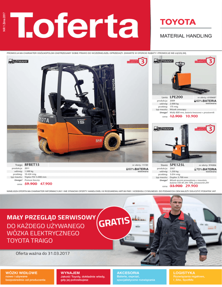 NR 1 Zima 2017 PROMOCJA MA CHARAKTER OGÓLNOPOLSKI ZASTRZEGAMY SOBIE PRAWO DO WCZEŚNIEJSZEJ SPRZEDAŻY. ZAWARTE W OFERCIE RABATY I PROMOCJE NIE ŁĄCZĄ SIĘ. POZIOM GWARANCJI POZIOM GWARANCJI Levio produkcja: udźwig: przebieg: typ masztu: LPE200 nr oferty: 6100687 2009 2.000 kg 175 mtg Wózek unoszący testowana Uwaga! Widły 800 mm, bateria kwasowa + prostownik cena: 12.900 10.900 POZIOM GWARANCJI Traigo produkcja: udźwig: przebieg: typ masztu: 8FBET15 nr oferty: 11720 2011 1.500 kg 10.424 mtg Triplex FSV 5.000 mm testowana Uwaga! Przesuw boczny cena: Staxio produkcja: udźwig: przebieg: typ masztu: SPE125L nr oferty: 974006 2007 1.250 kg 3.014 mtg Duplex 3.700 mm testowana Uwaga! Wózek ręcznie prowadzony z masztem, bateria 430 Ah 24V 70%, prostownik 24V 59.900 47.900 cena: 33.900 29.900 NINIEJSZA OFERTA MA CHARAKTER INFORMACYJNY I NIE STANOWI OFERTY HANDLOWEJ W ROZUMIENIU ART.66 PAR.1 KODEKSU CYWILNEGO. DO PODANYCH CEN NALEŻY DOLICZYĆ PODATEK VAT. MAŁY PRZEGLĄD SERWISOWY DO KAŻDEGO UŻYWANEGO WÓZKA ELEKTRYCZNEGO TOYOTA TRAIGO GRATIS Oferta ważna do 31.03.2017 WÓZKI WIDŁOWE WYNAJEM AKCESORIA LOGISTYKA nowe i używane bezpośrednio od producenta Jakość Toyoty, dokładnie wtedy, gdy jej potrzebujesz Baterie, osprzęt, specjalistyczne rozwiązania Rozwiązania regałowe, I_Site, SpotMe Tonero produkcja: udźwig: przebieg: typ masztu: 8FGF15 POZIOM GWARANCJI nr oferty: 10255 2007 1.500 kg 5.859 mtg Standard V 3.300 mm Uwaga! Przesuw boczny cena: Tonero produkcja: udźwig: przebieg: typ masztu: 02-8FGF25 cena: Tonero 8FDF25 nr oferty: 10738 Tonero produkcja: udźwig: przebieg: typ masztu: 2008 2.500 kg 5.130 mtg Standard V 4.000 mm 69.000 62.900 8FGF25 Tonero 50-8FDJF35 2008 3.500 kg 7.732 mtg Duplex V 3.500 mm 65.900 59.900 nr oferty: 30264 2011 2.500 kg 6.390 mtg Duplex FV 3.300 mm POZIOM GWARANCJI Tonero produkcja: udźwig: przebieg: typ masztu: 02-7FGA45 nr oferty: 10858 Tonero produkcja: udźwig: przebieg: typ masztu: Uwaga! Pełna kabina z ogrzewaniem + 3,4 sekcja hydrauliki, idealny do celulozy 75.400 69.900 8FGF15 cena: nr oferty: 13826 95.900 89.900 cena: Tonero 02-8FGF18 nr oferty: 10651 2007 1.750 kg 8.954 mtg Duplex FV 3.000 mm Uwaga! Przesuw boczny 54.900 49.900 cena: 44.900 39.900 POZIOM GWARANCJI POZIOM GWARANCJI Tonero 8FGF25 nr oferty: 31236 produkcja: 2012 udźwig: 2.000 kg typ masztu: Standard V 3.300 mm Uwaga! Przesuw boczny, kabina cena: 73.900 69.900 ZDJĘCIE POGLĄDOWE POZIOM GWARANCJI POZIOM GWARANCJI produkcja: udźwig: przebieg: typ masztu: 2011 1.500 kg 2.580 mtg Standard V 4.000 mm Uwaga! Przeswu boczny 78.900 75.900 nr oferty: 50093 2007 4.500 kg 3.917 mtg Triplex FSV 6.000 mm POZIOM GWARANCJI Uwaga! Kabina + przesuw boczny wideł cena: cena: Uwaga! Przesuw boczny cena: nr oferty: 12551 2009 2.500 kg 4.723 mtg Triplex FVS 4.700 mm Uwaga! Przesuw boczny wraz z pozycjonerem wideł, pełna kabina 69.900 61.900 POZIOM GWARANCJI produkcja: udźwig: przebieg: typ masztu: 02-8FGF25 POZIOM GWARANCJI Uwaga! Pełna kabina z ogrzewaniem, przesuw boczny z pozycjonerem cena: Tonero produkcja: udźwig: przebieg: typ masztu: Uwaga! Przesuw boczny 51.900 45.900 POZIOM GWARANCJI produkcja: udźwig: przebieg: typ masztu: nr oferty: 30755 2012 2.500 kg 2.885 mtg Duplex FV 4.000 mm POZIOM GWARANCJI ZDJĘCIE POGLĄDOWE Spalinowe wózki z przeciwwagą Toyota Tonero POZIOM GWARANCJI Tonero produkcja: udźwig: przebieg: typ masztu: 7FGF30 2005 3.000 kg 9.132 mtg Standard 3.000 mm Uwaga! Przesuw boczny cena: 51.600 41.900 nr oferty: 12505 Tonero produkcja: udźwig: przebieg: typ masztu: 8FGJF35 nr oferty: 30352 2012 3.500 kg 2.558 mtg Duplex FV 3.000 mm Uwaga! Przesuw boczny z pozycjonerem, pełna kabina cena: 74.900 69.900 ZAWARTE W OFERCIE RABATY I PROMOCJE NIE ŁĄCZĄ SIĘ. NINIEJSZA OFERTA MA CHARAKTER INFORMACYJNY I NIE STANOWI OFERTY HANDLOWEJ W ROZUMIENIU ART.66 PAR.1 KODEKSU CYWILNEGO. DO PODANYCH CEN NALEŻY DOLICZYĆ PODATEK VAT. POZIOM GWARANCJI 8BMT20 nr oferty: 10586 2010 2.000 kg 7952 mtg Duplex 3.300 mm testowana Uwaga! Przesuw boczny cena: Traigo produkcja: udźwig: przebieg: typ masztu: 7FBST15 nr oferty: 13825 2014 1.500 kg 2.337 mtg Duplex 3.710 mm testowana Uwaga! Przesuw boczny 74.900 65.900 cena: cena: 7FBEST13 nr oferty: 11335 2012 1250 kg 3.728 mtg Standard V 4.510 mm testowana Uwaga! Przesuw boczny cena: testowana 49.900 45.900 POZIOM GWARANCJI ZDJĘCIE POGLĄDOWE Traigo produkcja: udźwig: przebieg: typ masztu: 7FBMF16 nr oferty: 14935 2011 1.600 kg 3.846 mm Duplex 3.700 mm regenerowana Uwaga! Przesuw boczny 47.900 39.900 nr oferty: 10043 2009 1.600 kg 7.597 mtg Duplex FV 3.300 mm POZIOM GWARANCJI ZDJĘCIE POGLĄDOWE Traigo produkcja: udźwig: przebieg: typ masztu: 8FBEKT16 Uwaga! Przesuw boczny 94.900 89.900 POZIOM GWARANCJI Traigo produkcja: udźwig: przebieg: typ masztu: cena: Traigo produkcja: udźwig: przebieg: typ masztu: 8FBET16 nr oferty: 10304 2010 1.600 kg 18.233 mtg Triplex 4.700 mm testowana Uwaga! Bateria 625 Ah, boczna wymiana 52.500 49.900 cena: 64.900 59.900 POZIOM GWARANCJI POZIOM GWARANCJI ZDJĘCIE POGLĄDOWE POZIOM GWARANCJI ZDJĘCIE POGLĄDOWE Traigo produkcja: udźwig: przebieg: typ masztu: ZDJĘCIE POGLĄDOWE ZDJĘCIE POGLĄDOWE POZIOM GWARANCJI Traigo produkcja: udźwig: przebieg: typ masztu: 8FBET18 nr oferty: 10324 2011 1.800 kg Tylko 924 mtg Duplex Tele FV 3.700 mm testowana Uwaga! Bateria 630 Ah, przesuw boczny cena: Traigo produkcja: udźwig: przebieg: typ masztu: 7FBMF30 nr oferty: 140417 2009 3.000 kg 2.107 mtg Duplex FV 3.000 mm testowana Uwaga! Przesuw boczny 57.900 54.900 cena: Traigo produkcja: udźwig: przebieg: typ masztu: 8FBET16 testowana Uwaga! Bateria po regeneracji 500 Ah, boczna wymiana 62.900 59.900 cena: 47.900 42.900 POZIOM GWARANCJI POZIOM GWARANCJI Traigo produkcja: udźwig: przebieg: typ masztu: 8FBET18 nr oferty: 11211 2012 1.750 kg 2.238 mtg Triplex FSV 4.500 mm Uwaga! cena: ZDJĘCIE POGLĄDOWE POZIOM GWARANCJI nr oferty: 10714 2011 1.600 kg 9.523 mtg Triplex 5.000 mm ZDJĘCIE POGLĄDOWE Elektry