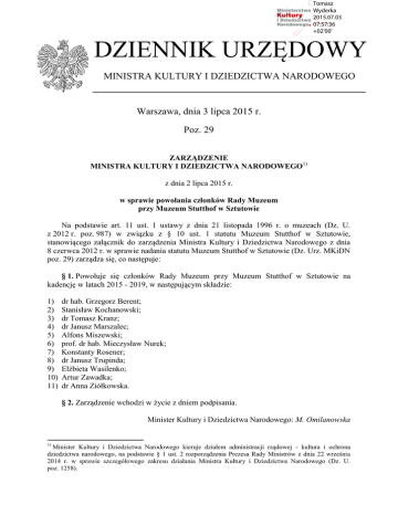 Tomasz Wyderka 2015.07.03 07:57:36 +02'00' DZIENNIK URZĘDOWY MINISTRA KULTURY I DZIEDZICTWA NARODOWEGO Warszawa, dnia 3 lipca 2015 r. Poz. 29 ZARZĄDZENIE MINISTRA KULTURY I DZIEDZICTWA NARODOWEGO1) z dnia 2 lipca 2015 r. w sprawie powołania członków Rady Muzeum przy Muzeum Stutthof w Sztutowie Na podstawie art. 11 ust. 1 ustawy z dnia 21 listopada 1996 r. o muzeach (Dz. U. z 2012 r. poz. 987) w związku z § 10 ust. 1 statutu Muzeum Stutthof w Sztutowie, stanowiącego załącznik do zarządzenia Ministra Kultury i Dziedzictwa Narodowego z dnia 8 czerwca 2012 r. w sprawie nadania statutu Muzeum Stutthof w Sztutowie (Dz. Urz. MKiDN poz. 29) zarządza się, co następuje: § 1. Powołuje się członków Rady Muzeum przy Muzeum Stutthof w Sztutowie na kadencję w latach 2015 - 2019, w następującym składzie: 1) 2) 3) 4) 5) 6) 7) 8) 9) 10) 11) dr hab. Grzegorz Berent; Stanisław Kochanowski; dr Tomasz Kranz; dr Janusz Marszalec; Alfons Miszewski; prof. dr hab. Mieczysław Nurek; Konstanty Rosener; dr Janusz Trupinda; Elżbieta Wasilenko; Artur Zawadka; dr Anna Ziółkowska. § 2. Zarządzenie wchodzi w życie z dniem podpisania. Minister Kultury i Dziedzictwa Narodowego: M. Omilanowska 1) Minister Kultury i Dziedzictwa Narodowego kieruje działem administracji rządowej - kultura i ochrona dziedzictwa narodowego, na podstawie § 1 ust. 2 rozporządzenia Prezesa Rady Ministrów z dnia 22 września 2014 r. w sprawie szczegółowego zakresu działania Ministra Kultury i Dziedzictwa Narodowego (Dz. U. poz. 1258).