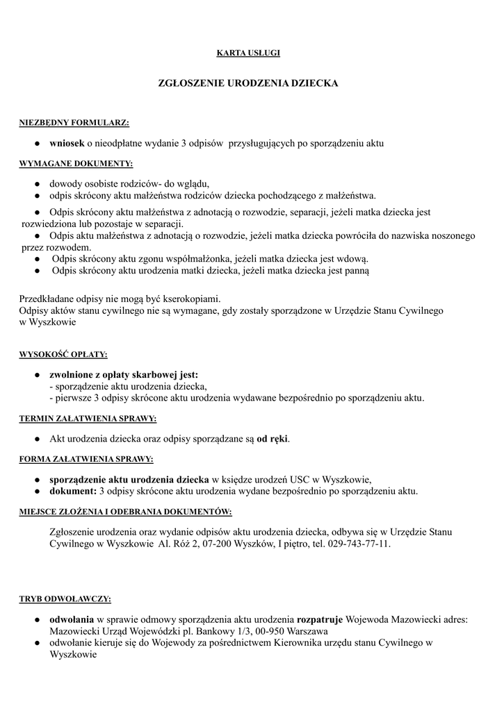 KARTA USŁUGI ZGŁOSZENIE URODZENIA DZIECKA NIEZBĘDNY FORMULARZ: wniosek o nieodpłatne wydanie 3 odpisów przysługujących po sporządzeniu aktu WYMAGANE DOKUMENTY: dowody osobiste rodziców- do wglądu, odpis skrócony aktu małżeństwa rodziców dziecka pochodzącego z małżeństwa. Odpis skrócony aktu małżeństwa z adnotacją o rozwodzie, separacji, jeżeli matka dziecka jest rozwiedziona lub pozostaje w separacji. Odpis aktu małżeństwa z adnotacją o rozwodzie, jeżeli matka dziecka powróciła do nazwiska noszonego przez rozwodem. Odpis skrócony aktu zgonu współmałżonka, jeżeli matka dziecka jest wdową. Odpis skrócony aktu urodzenia matki dziecka, jeżeli matka dziecka jest panną Przedkładane odpisy nie mogą być kserokopiami. Odpisy aktów stanu cywilnego nie są wymagane, gdy zostały sporządzone w Urzędzie Stanu Cywilnego w Wyszkowie WYSOKOŚĆ OPŁATY: zwolnione z opłaty skarbowej jest: - sporządzenie aktu urodzenia dziecka, - pierwsze 3 odpisy skrócone aktu urodzenia wydawane bezpośrednio po sporządzeniu aktu. TERMIN ZAŁATWIENIA SPRAWY: Akt urodzenia dziecka oraz odpisy sporządzane są od ręki. FORMA ZAŁATWIENIA SPRAWY: sporządzenie aktu urodzenia dziecka w księdze urodzeń USC w Wyszkowie, dokument: 3 odpisy skrócone aktu urodzenia wydane bezpośrednio po sporządzeniu aktu. MIEJSCE ZŁOŻENIA I ODEBRANIA DOKUMENTÓW: Zgłoszenie urodzenia oraz wydanie odpisów aktu urodzenia dziecka, odbywa się w Urzędzie Stanu Cywilnego w Wyszkowie Al. Róż 2, 07-200 Wyszków, I piętro, tel. 029-743-77-11. TRYB ODWOŁAWCZY: odwołania w sprawie odmowy sporządzenia aktu urodzenia rozpatruje Wojewoda Mazowiecki adres: Mazowiecki Urząd Wojewódzki pl. Bankowy 1/3, 00-950 Warszawa odwołanie kieruje się do Wojewody za pośrednictwem Kierownika urzędu stanu Cywilnego w Wyszkowie termin do wniesienia odwołania: 14 dni od dnia doręczenia decyzji. SPRAWĘ PROWADZI: Kierownik USC Alicja Chełmicka Zastępca Kierownika Małgorzata Buźniak Inspektor d/s rejestracji stanu cywilnego Przemysław Budny INFORMACJI UDZIELA: Kierownik USC Alicja Chełmicka Zastępca Kierownika Małgorzata Buźniak Inspektor d/s rejestracji stanu cywilnego Przemysław Budny DODATKOWE INFORMACJE: do zgłoszenia urodzenia dziecka są obowiązani ojciec dziecka albo matka, jeżeli jej stan zdrowia na to pozwala oraz lekarz i położna. Jeżeli urodzenie nastąpiło w zakładzie opieki zdrowotnej, do zgłoszenia urodzenia jest obowiązany zakład opieki zdrowotnej, dziecku nie można nadać więcej niż dwóch imion, imienia ośmieszającego, nieprzyzwoitego, w formie zdrobniałej oraz imienia nie pozwalającego odróżnić płci dziecka, rodzice dziecka mogą w ciągu 6 miesięcy od daty sporządzenia aktu urodzenia złożyć kierownikowi USC pisemne oświadczenie o zmianie imienia (imion) dziecka wpisanego do aktu w chwili jego sporządzenia, urodzenie rejestruje się w urzędzie stanu cywilnego właściwym dla miejsca urodzenia dziecka. Urodzenie dziecka należy zgłosić w ciągu 14 dni od dnia urodzenia lub 3 dni, jeżeli dziecko urodziło się martwe, w sytuacji, gdy osoba obowiązana do zgłoszenia urodzenia dziecka nie może spełnić tego obowiązku, może tego dokonać w jej imieniu pełnomocnik. Pełnomocnictwo powinno być udzielone na piśmie, w treści pełnomocnictwa winno być wskazane imię lub imiona nadawane dziecku przez rodziców. jeżeli żadne z rodziców nie zamieszkuje na obszarze gminy, na terenie której urodziło się dziecko, zgłoszenia urodzenia mogą dokonać w USC miejsca zamieszkania rodziców lub jednego z nich. PODSTAWA PRAWNA: ustawa z dnia 29 września 1986 r. Prawo o aktach stanu cywilnego (tekst jedn. Dz.U. Nr 212 poz. 1264 z 2011 roku), ustawa z dnia 16 listopada 2006 r. O opłacie skarbowej (Dz. U. z 2006 r. Nr 225, poz. 1635 z późn.zm.) GODZINY PRACY URZĘDU: - od poniedziałku do piątku w godzinach 800-1600 - wtorek – 800-1800 Osoba sporządzająca i zatwierdzająca kartę pod względem merytorycznym Kierownik USC Alicja Chełmicka