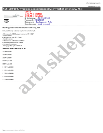 Informacje o produkcie Utworzono 02-03-2017 ACC-168/100, wysokiej jakości koncentryczny kabel antenowy, 75Ω Cena : 235,77 zł (netto) 290,00 zł (brutto) Nr katalogowy : ACC-168/100 Producent : MONACOR Dostępność : Dostępność- 7 dni Średnia ocena : brak recenzji Wysokiej jakości koncentryczny kabel antenowy, 75Ω, ● ● ● ● ● ● ● ● Ekranowanie: 100dB, zgodne z normą EN 50117 Szpula 100m Wewnętrzna żyła: Ø 1.13mm Potrójny ekran Tłumienie: 5.2dB/100m (100MHz) Średnica zewnętrzna: Ø 6.8mm Oznaczenie metrowe Pasujący wtyk typu F: FCH-14 Tłumienie w dB/100m przy 20 °C: 100MHz/5.2dB 300MHz/8.8dB 500MHz/12.3dB 800MHz/15.6dB 1 000MHz/18.3dB 1 350MHz/21.8dB 1 750MHz/24.9dB 2 050MHz/28.4dB ar 2 450MHz/33.4dB t1 sk 200MHz/7.2dB le p Biały, do telewizji kablowej i systemów satelitarnych. Wygenerowano w programie www.oscGold.com