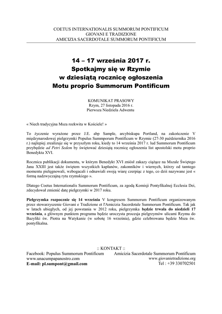 COETUS INTERNATIONALIS SUMMORUM PONTIFICUM GIOVANI E TRADIZIONE AMICIZIA SACERDOTALE SUMMORUM PONTIFICUM 14 – 17 września 2017 r. Spotkajmy się w Rzymie w dziesiątą rocznicę ogłoszenia Motu proprio Summorum Pontificum KOMUNIKAT PRASOWY Rzym, 27 listopada 2016 r. Pierwsza Niedziela Adwentu « Niech tradycyjna Msza rozkwita w Kościele! » To życzenie wyrażone przez J.E. abp Sample, arcybiskupa Portland, na zakończenie V międzynarodowej pielgrzymki Populus Summporum Pontificum w Rzymie (27-30 października 2016 r.) najlepiej zrealizuje się w przyszłym roku, kiedy to 14 września 2017 r. lud Summorum Pontificum przybędzie ad Petri Sedem by świętować dziesiątą rocznicę ogłoszenia list apostolski motu proprio Benedykta XVI. Rocznica publikacji dokumentu, w którym Benedykt XVI zniósł zakazy ciążące na Mszale Świętego Jana XXIII jest także świętem wszystkich kapłanów, zakonników i wiernych, którzy od tamtego momentu pielęgnowali, wzbogacali i odnawiali swoją wiarę czerpiąc z tego, co dziś nazywane jest « formą nadzwyczajną rytu rzymskiego ». Dlatego Coetus Internationalis Summorum Pontificum, za zgodą Komisji Pontyfikalnej Ecclesia Dei, zdecydował zmienić datę pielgrzymki w 2017 roku. Pielgrzymka rozpocznie się 14 września V kongresem Summorum Pontificum organizowanym przez stowarzyszenie Giovani e Tradizione et l'Amicizia Sacerdotale Summorum Pontificum. Tak jak w latach ubiegłych, od jej powstania w 2012 roku, pielgrzymka będzie trwała do niedzieli 17 września, a głównym punktem programu będzie uroczysta procesja pielgrzymów ulicami Rzymu do Bazyliki św. Piotra na Watykanie (w sobotę 16 września), gdzie celebrowana będzie Msza św. pontyfikalna. :: KONTAKT :: Facebook: Populus Summorum Pontificum Amicizia Sacerdotale Summorum Pontificum www.giovanietradizione.org www.unacumpapanostro.com Tel : +39 330702501 E-mail: [email protected]