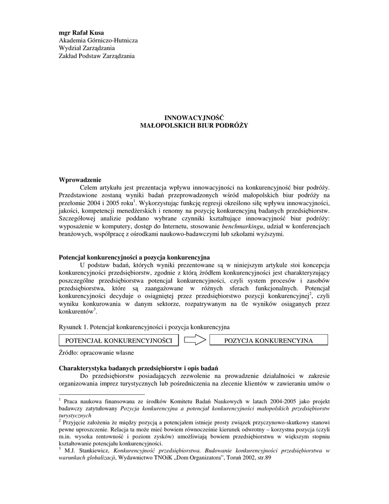 mgr Rafał Kusa Akademia Górniczo-Hutnicza Wydział Zarządzania Zakład Podstaw Zarządzania INNOWACYJNOŚĆ MAŁOPOLSKICH BIUR PODRÓŻY Wprowadzenie Celem artykułu jest prezentacja wpływu innowacyjności na konkurencyjność biur podróży. Przedstawione zostaną wyniki badań przeprowadzonych wśród małopolskich biur podróży na przełomie 2004 i 2005 roku1. Wykorzystując funkcję regresji określono siłę wpływu innowacyjności, jakości, kompetencji menedżerskich i renomy na pozycję konkurencyjną badanych przedsiębiorstw. Szczegółowej analizie poddano wybrane czynniki kształtujące innowacyjność biur podróży: wyposażenie w komputery, dostęp do Internetu, stosowanie benchmarkingu, udział w konferencjach branżowych, współpracę z ośrodkami naukowo-badawczymi lub szkołami wyższymi. Potencjał konkurencyjności a pozycja konkurencyjna U podstaw badań, których wyniki prezentowane są w niniejszym artykule stoi koncepcja konkurencyjności przedsiębiorstw, zgodnie z którą źródłem konkurencyjności jest charakteryzujący poszczególne przedsiębiorstwa potencjał konkurencyjności, czyli system procesów i zasobów przedsiębiorstwa, które są zaangażowane w różnych sferach funkcjonalnych. Potencjał konkurencyjności decyduje o osiągniętej przez przedsiębiorstwo pozycji konkurencyjnej2, czyli wyniku konkurowania w danym sektorze, rozpatrywanym na tle wyników osiąganych przez konkurentów3. Rysunek 1. Potencjał konkurencyjności i pozycja konkurencyjna POTENCJAŁ KONKURENCYJNOŚCI POZYCJA KONKURENCYJNA Źródło: opracowanie własne Charakterystyka badanych przedsiębiorstw i opis badań Do przedsiębiorstw posiadających zezwolenie na prowadzenie działalności w zakresie organizowania imprez turystycznych lub pośredniczenia na zlecenie klientów w zawieraniu umów o 1 Praca naukowa finansowana ze środków Komitetu Badań Naukowych w latach 2004-2005 jako projekt badawczy zatytułowany Pozycja konkurencyjna a potencjał konkurencyjności małopolskich przedsiębiorstw turystycznych 2 Przyjęcie założenia że między pozycją a potencjałem istnieje prosty związek przyczynowo-skutkowy stanowi pewne uproszczenie. Relacja ta może mieć bowiem równocześnie kierunek odwrotny – korzystna pozycja (czyli m.in. wysoka rentowność i poziom zysków) umożliwiają bowiem przedsiębiorstwu w większym stopniu kształtowanie potencjału konkurencyjności. 3 M.J. Stankiewicz, Konkurencyjność przedsiębiorstwa. Budowanie konkurencyjności przedsiębiorstwa w warunkach globalizacji, Wydawnictwo TNOiK „Dom Organizatora”, Toruń 2002, str.89 147 świadczenie usług turystycznych, które zarejestrowane były w Małopolsce w grudniu 2004 roku, zostały rozesłane drogą pocztową kwestionariusze ankiety. O ich wypełnienie poproszono kierowników lub właścicieli badanych przedsiębiorstw. Przedstawione poniżej wyniki opracowane zostały na podstawie odpowiedzi uzyskanych z 34 biur, co stanowi 10% badanej grupy przedsiębiorstw. Średni wiek badanych przedsiębiorstw wynosi przeszło 9 lat, a aż 30% firm funkcjonuje na rynku dłużej niż 11 lat. 76% badanych biur, oprócz organizacji i sprzedaży imprez własnych, sprzedaje także imprezy obce. 70% zajmuje się obsługą zagranicznej turystyki wyjazdowej, a przeszło 50% deklaruje działalność w zakresie turystyki przyjazdowej (która w istotny sposób wpływa na sytuację gospodarczą regionu). 77% przedsiębiorstw zatrudnia mniej niż 6 pracowników, zaś 7% przedsiębiorstw – więcej niż 50 pracowników4. Średnia rentowność sprzedaży wynosiła w 2004 roku 10,5% i w okresie ostatnich 3 lat wykazuje tendencję wzrostową (Tabela 1). Osoby kierujące działalnością badanych przedsiębiorstw optymistycznie oceniają przyszłość – średnia dynamika przychodów oczekiwana w 2005 roku wynosi 111,4%, czyli wyraźnie powyżej poziomu z lat poprzednich. Tabela 1. Rentowność sprzedaży i dynamika przychodów małopolskich biur podróży Rok 2002 2003 2004 Średnia rentowność sprzedaży (%) 8,7 8,9 10,3 Średnia dynamika przychodów (%) 108,5 106,3 Źródło: opracowanie własne na podstawie wyników badań ankietowych 107,6 Poniżej przedstawione zostaną wskaźniki wykorzystane do oceny pozycji konkurencyjnej oraz do oceny innowacyjności, a następnie przedstawiona zostanie próba oceny wpływu innowacyjności na pozycję konkurencyjną badanych przedsiębiorstw. Wskaźniki pozycji konkurencyjnej Najczęściej stosowanymi wyznacznikami pozycji konkurencyjnej przedsiębiorstwa są udział firmy w rynku oraz wskaźniki opisujące sytuację finansową przedsiębiorstwa5. Ponieważ pojęcie zysku nie jest najdoskonalszym wskaźnikiem konkurencyjności (zwłaszcza w przypadku porównywania przedsiębiorstw o różnej skali działalności), zwykle stosuje się wskaźniki rentowności. Zarówno udział w rynku, jak i poziom rentowności zazwyczaj rozpatrywane są w ujęciu dynamicznym, co umożliwia ocenę kierunku i tempa zmian, jakim podlegają wyniki przedsiębiorstwa. Powinny one być analizowane łącznie, gdyż wysoki poziom jednego z nich (np. udziału w rynku), przy niskim poziomie drugiego (rentowność) nie wskazuje jeszcze na korzystną pozycję konkurencyjną przedsiębiorstwa. W prezentowanych badaniach do oceny pozycji konkurencyjnej posłużyły przede wszystkim dynamika sprzedaży i rentowność sprzedaży. Dodatkowymi wskaźnikami były także: wiek firmy, liczba turystów korzystających z usług biura, odsetek stałych klientów, liczba własnych punktów sprzedaży. Wszystkie wskaźniki analizowane były w okresie ostatnich 3 lat (lata 2002-2004), co pozwoliło ocenić dodatkowo kierunek ich zmian. 4 zatrudnienie poza sezonem; obejmuje także właścicieli (jeżeli to oni kierują działalnością przedsiębiorstwa). W szczycie sezonu przedsiębiorstwa zatrudniają średnio 7 osób więcej. 5 M. Gorynia (red.), Luka konkurencyjna na poziomie przedsiębiorstwa a przys