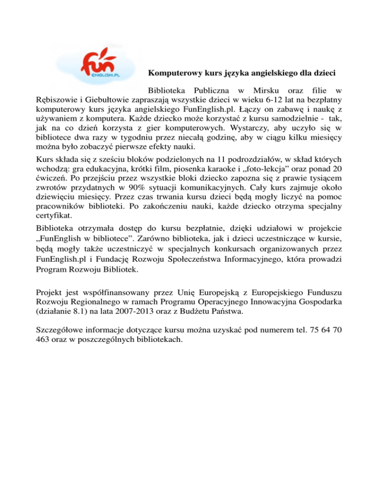 Komputerowy kurs języka angielskiego dla dzieci Biblioteka Publiczna w Mirsku oraz filie w Rębiszowie i Giebułtowie zapraszają wszystkie dzieci w wieku 6-12 lat na bezpłatny komputerowy kurs języka angielskiego FunEnglish.pl. Łączy on zabawę i naukę z używaniem z komputera. Każde dziecko może korzystać z kursu samodzielnie - tak, jak na co dzień korzysta z gier komputerowych. Wystarczy, aby uczyło się w bibliotece dwa razy w tygodniu przez niecałą godzinę, aby w ciągu kilku miesięcy można było zobaczyć pierwsze efekty nauki. Kurs składa się z sześciu bloków podzielonych na 11 podrozdziałów, w skład których wchodzą: gra edukacyjna, krótki film, piosenka karaoke i „foto-lekcja” oraz ponad 20 ćwiczeń. Po przejściu przez wszystkie bloki dziecko zapozna się z prawie tysiącem zwrotów przydatnych w 90% sytuacji komunikacyjnych. Cały kurs zajmuje około dziewięciu miesięcy. Przez czas trwania kursu dzieci będą mogły liczyć na pomoc pracowników biblioteki. Po zakończeniu nauki, każde dziecko otrzyma specjalny certyfikat. Biblioteka otrzymała dostęp do kursu bezpłatnie, dzięki udziałowi w projekcie „FunEnglish w bibliotece”. Zarówno biblioteka, jak i dzieci uczestniczące w kursie, będą mogły także uczestniczyć w specjalnych konkursach organizowanych przez FunEnglish.pl i Fundację Rozwoju Społeczeństwa Informacyjnego, która prowadzi Program Rozwoju Bibliotek. Projekt jest współfinansowany przez Unię Europejską z Europejskiego Funduszu Rozwoju Regionalnego w ramach Programu Operacyjnego Innowacyjna Gospodarka (działanie 8.1) na lata 2007-2013 oraz z Budżetu Państwa. Szczegółowe informacje dotyczące kursu można uzyskać pod numerem tel. 75 64 70 463 oraz w poszczególnych bibliotekach.