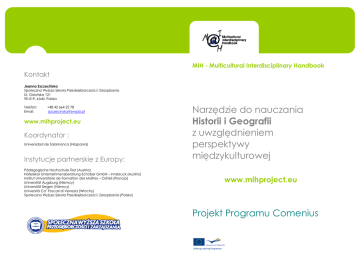 MIH - Multicultural Interdisciplinary Handbook Kontakt Joanna Szczecińska Społeczna Wyższa Szkoła Przedsiębiorczości i Zarządzania Ul. Gdańska 121 90-519, Łódź, Polska Telefon: Email: +48 42 664 22 78 [email protected] www.mihproject.eu Koordynator : Universidad de Salamanca (Hiszpania) Instytucje partnerskie z Europy: Pädagogische Hochschule Tirol (Austria) Hafelekar Unternehmensberatung Schober GmbH – Innsbruck (Austria) Institut Universitaire de Formation des Maîtres – Créteil (Francja) Universität Augsburg (Niemcy) Universität Siegen (Niemcy) Università Ca’ Foscari di Venezia (Włochy) Społeczna Wyższa Szkoła Przedsiębiorczości i Zarządzania (Polska) Narzędzie do nauczania Historii i Geografii z uwzględnieniem perspektywy międzykulturowej www.mihproject.eu Projekt Programu Comenius Cele W projekcie MIH tworzone są zdalne materiały dydaktyczne wprowadzające edukację interdyscyplinarną i międzykulturową do szkół. Nowe narzędzia pomagają nauczycielom I uczniom zagłębić się w kulturę I język innych narodów europejskich poprzez poznanie ich sposobu nauczania historii i geografii. Intencją projektu jest również promowanie wspólnej europejskiej tożsamości poprzez wprowadzenie do szkół programów nauczania historii I geografii perspektywy europejskiej, która zwykle zawężona jest zagadnień narodowych. Partnerstwo stworzyło zestaw narzędzi takich jak podręcznik, cyfrowe moduły dydaktyczne I program szkoleniowy dla nauczycieli. Oferują one usystematyzowaną ścieżkę nauczania współczesnej historii i geografii Europy dotyczących krajów uczestniczących w projekcie. • Dalszy rozwój wspólnej tożsamości europejskiej poprzez zaangażowanie szkól w poznawanie kultur innych krajów, ich języka oraz ich narodowej symboliki wizualnej • Promowanie używania systemu zintegrowanego nauczania języka i przedmiotu (CLIL) • Wkład w stworzenie materiałów dydaktycznych nowej generacji wykorzystujących nowe technologie, które będą wspomagać nauczycieli prowadzących zajęcia CLIL • Implentacja w szkołach cyfrowych materiałów edukacyjnych Główne rezultaty 1. Podręcznik i Cyfrowe Materiały – dostępne na stronie www.mihproject.eu po angielsku, niemiecku, francusku, hiszpańsku, włosku i polsku – dotyczące wybranych tematów historycznych i geograficznych, 2. Szkolenie dla Nauczycieli adresowane do obecnych I przyszłych nauczycieli. Szkolenie uczy posługiwania się podręcznikiem i wyjaśnia jego zagadnienia metodologiczne.